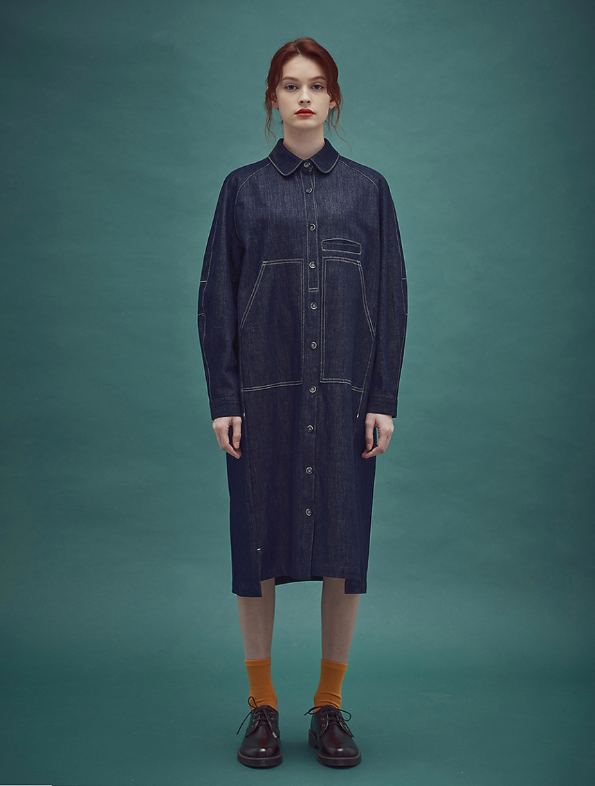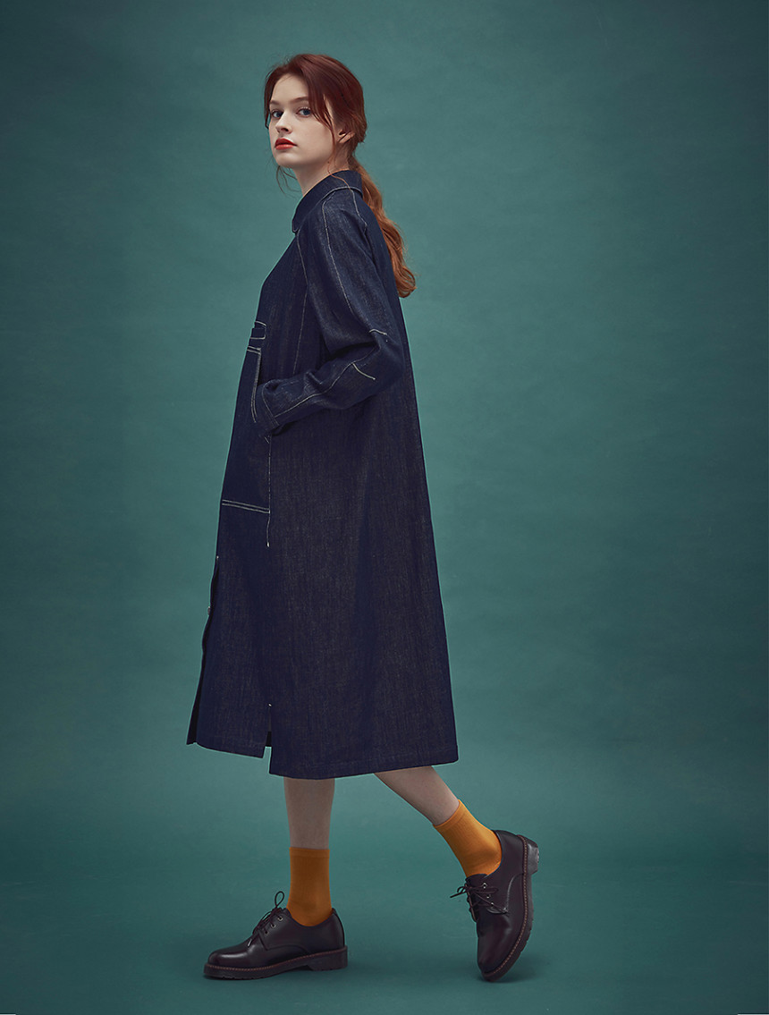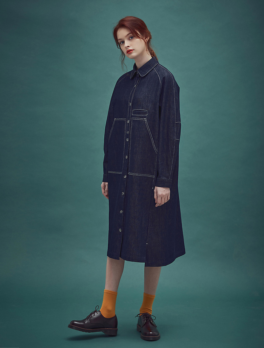 인디고 염색 특유의 젊음과 자유로움 그리고 품격 있는 멋까지 공존하는 드레스 아이템으로 롱 셔츠 드레스와 라그랑 트렌치의 느낌을 데님 소재로 하이브리드 시킨 라그랑 인디고 블루 드레스[Raglan indigo blue dress] 입니다. 전체적으로 직선의 스티치와 컷팅이 사용 되었지만 라운드 칼라와 목선에서 어깨선으로 떨어지는 곡선의 라그랑 슬리브 그 아래로 둥그스레 입체적인 폼의 소매 형태는 편안한 착용감과 함께 부드러운 데님 원피스를 만들어 줍니다.