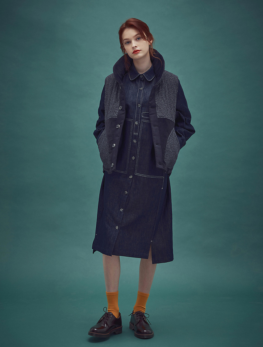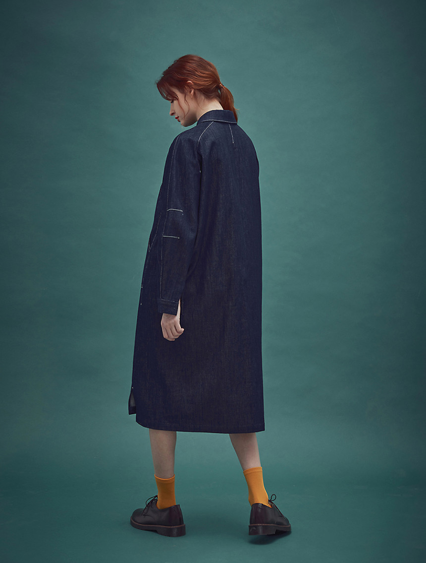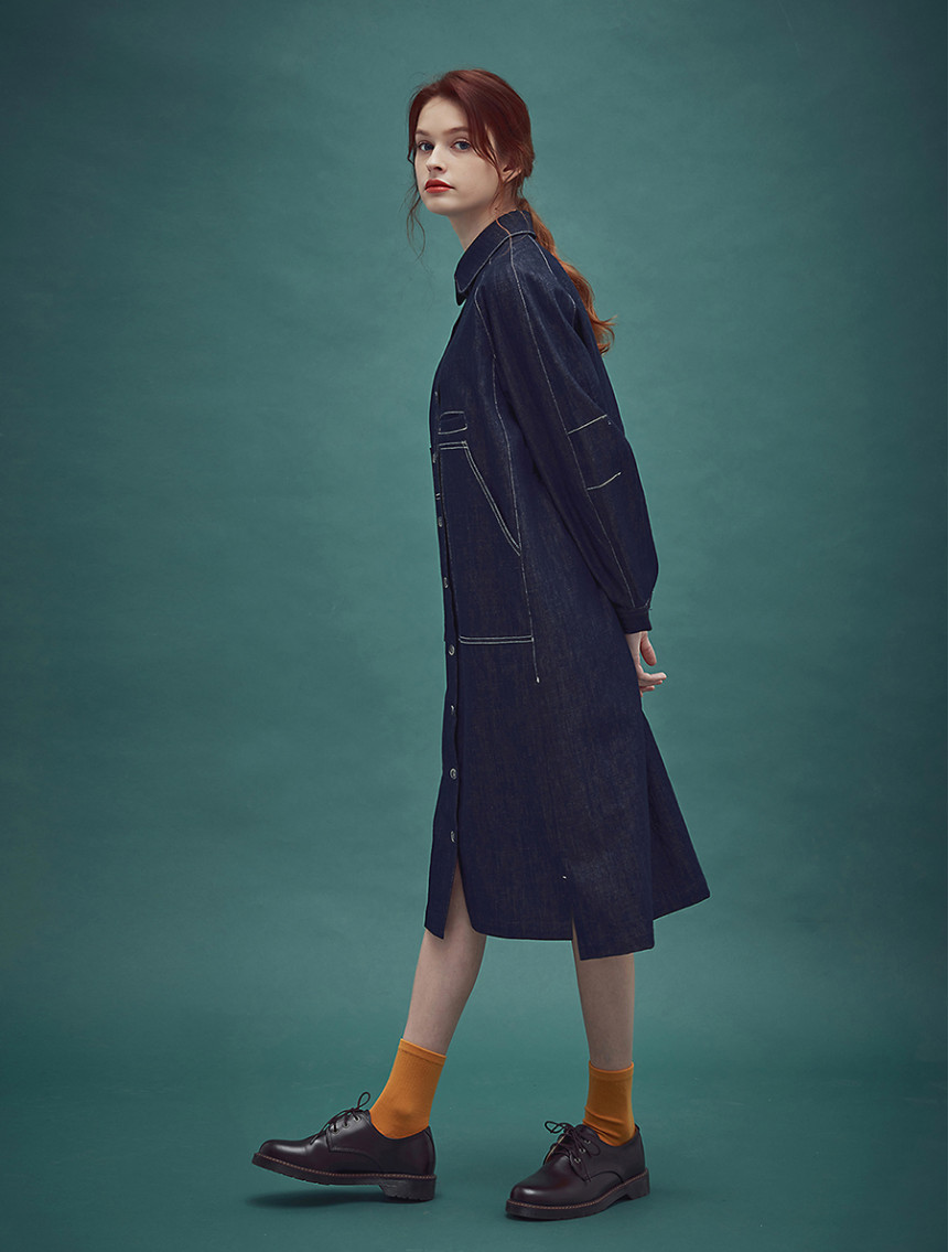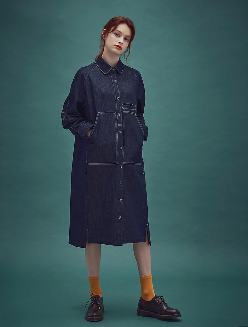 인디고 염색 특유의 젊음과 자유로움 그리고 품격 있는 멋까지 공존하는 드레스 아이템으로 롱 셔츠 드레스와 라그랑 트렌치의 느낌을 데님 소재로 하이브리드 시킨 라그랑 인디고 블루 드레스[Raglan indigo blue dress] 입니다. 전체적으로 직선의 스티치와 컷팅이 사용 되었지만 라운드 칼라와 목선에서 어깨선으로 떨어지는 곡선의 라그랑 슬리브 그 아래로 둥그스레 입체적인 폼의 소매 형태는 편안한 착용감과 함께 부드러운 데님 원피스를 만들어 줍니다.