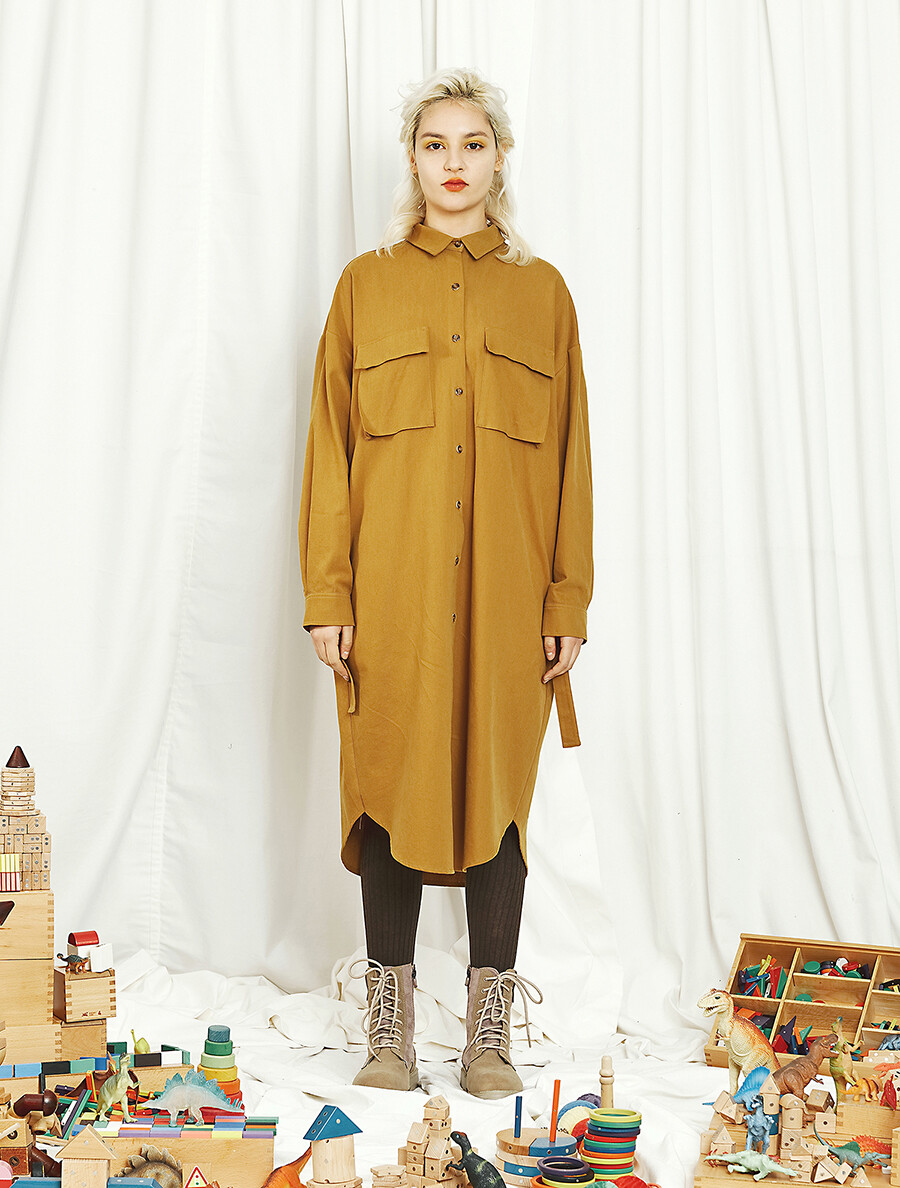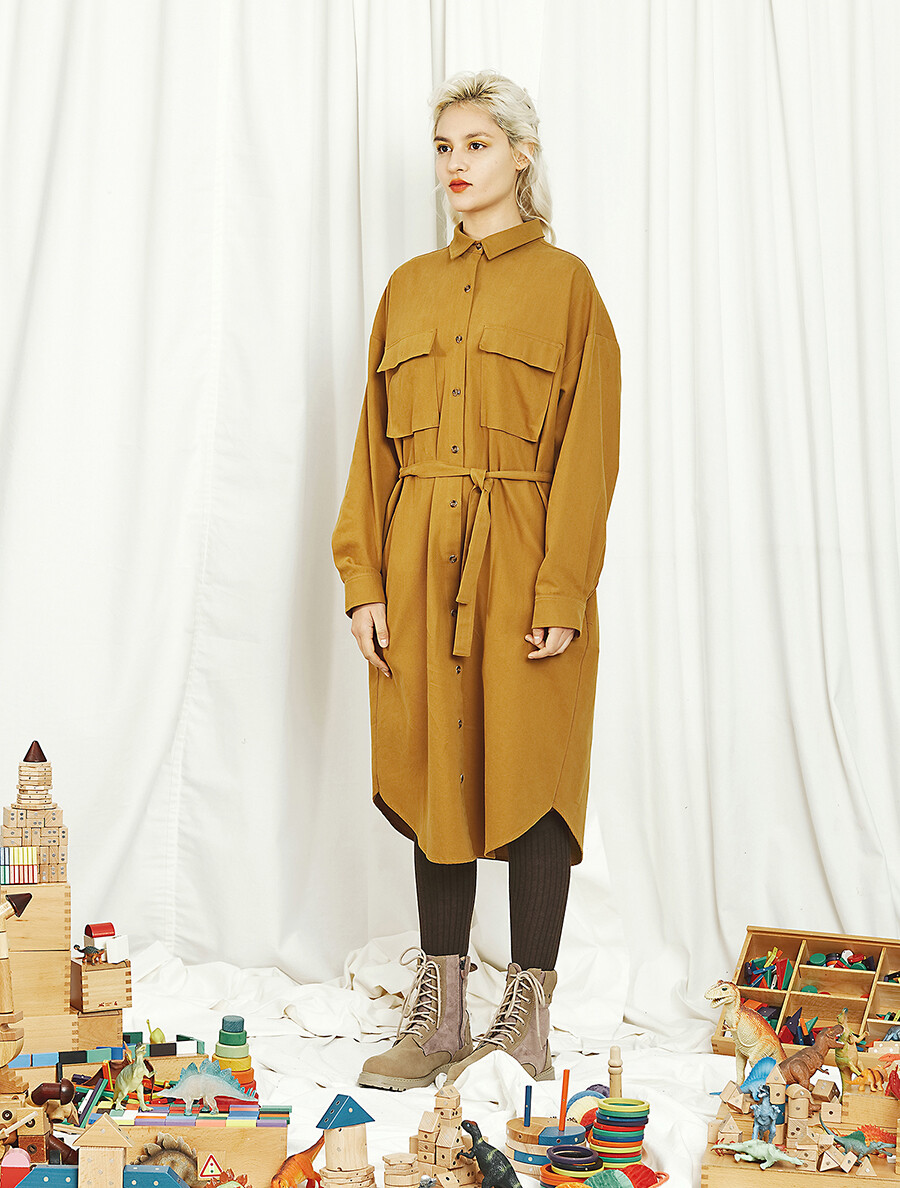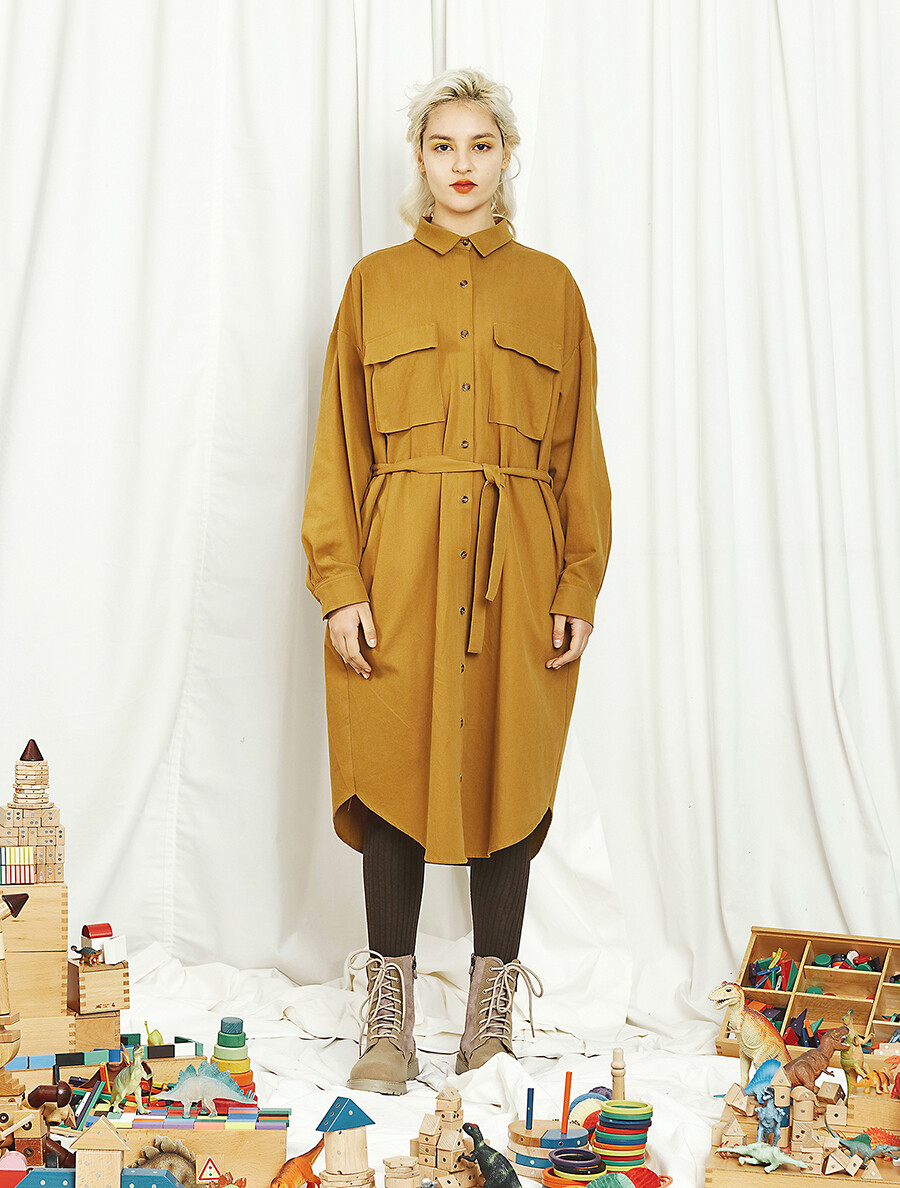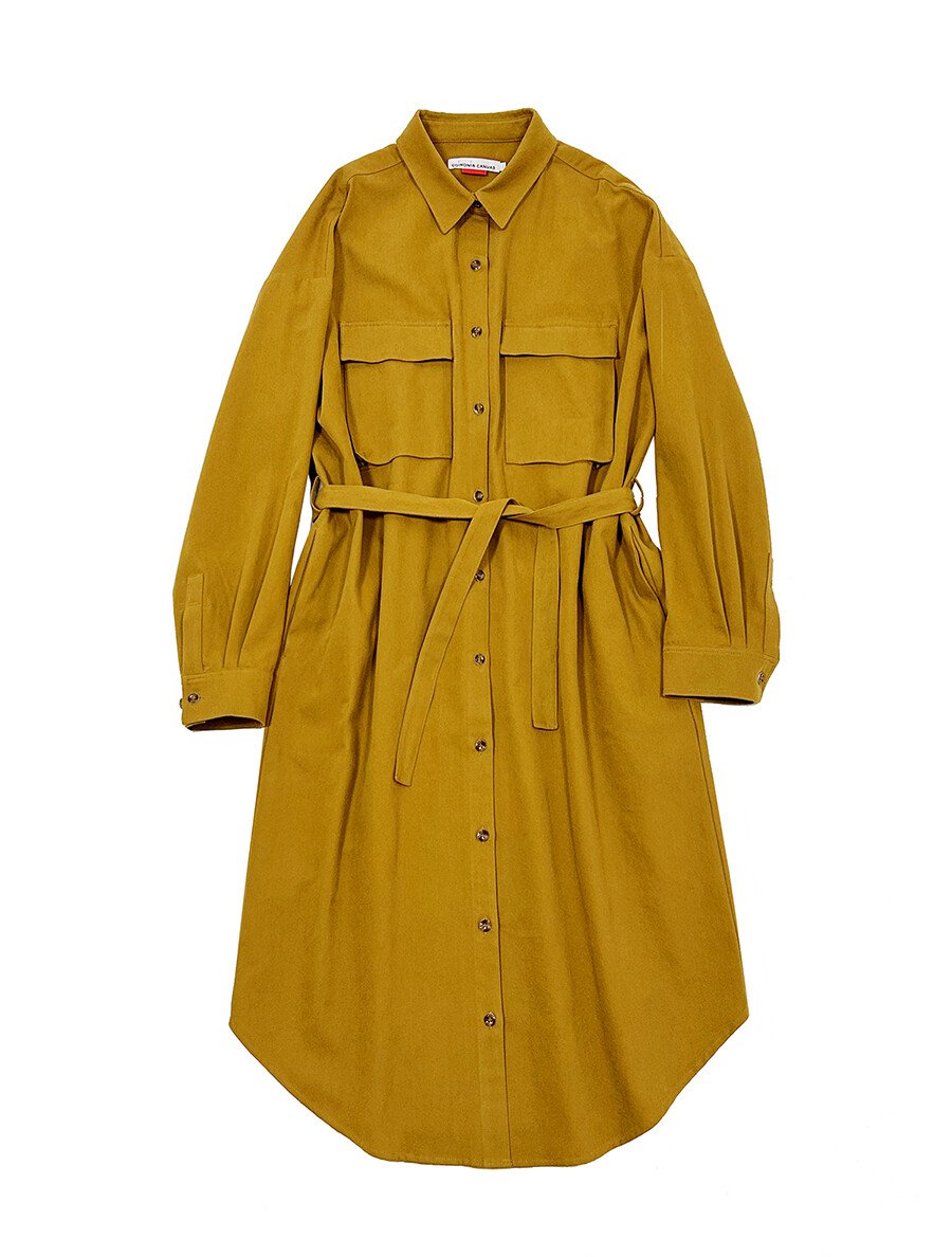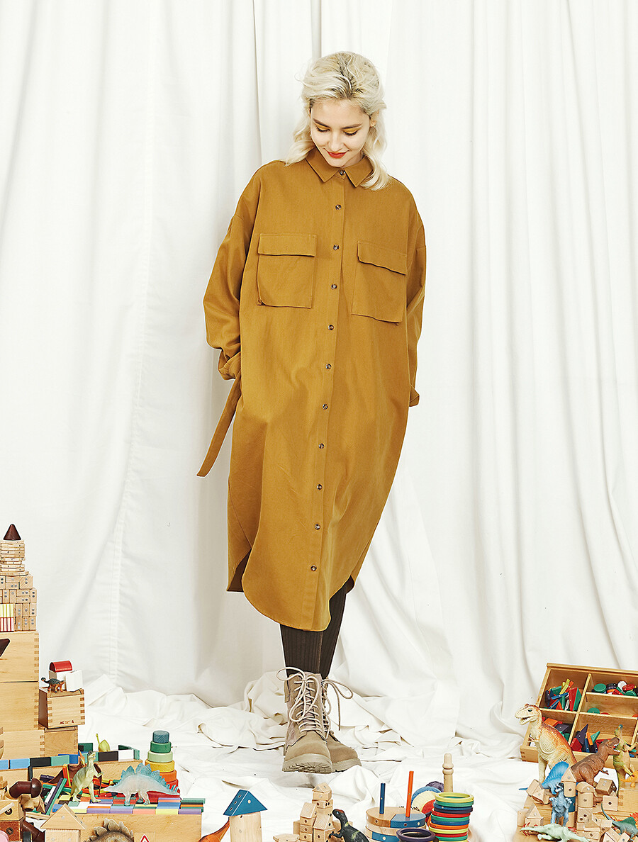 16수 트윌 코튼 소재로 피치의 부드러운 터치감과 바이오 워싱으로 더 깊이감이 생긴 머스터드 컬러가 착용자와 실루엣에서 그대로 느껴지는 부드러우면서도 포근한 벨티드 셔츠드레스입니다. 2개의 입체 빅포켓과 사이드 포켓이 각자가 있어야 할 가장 아름다운 위치에 자리잡고 있습니다.