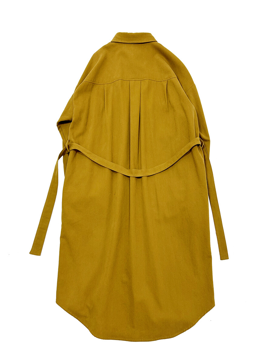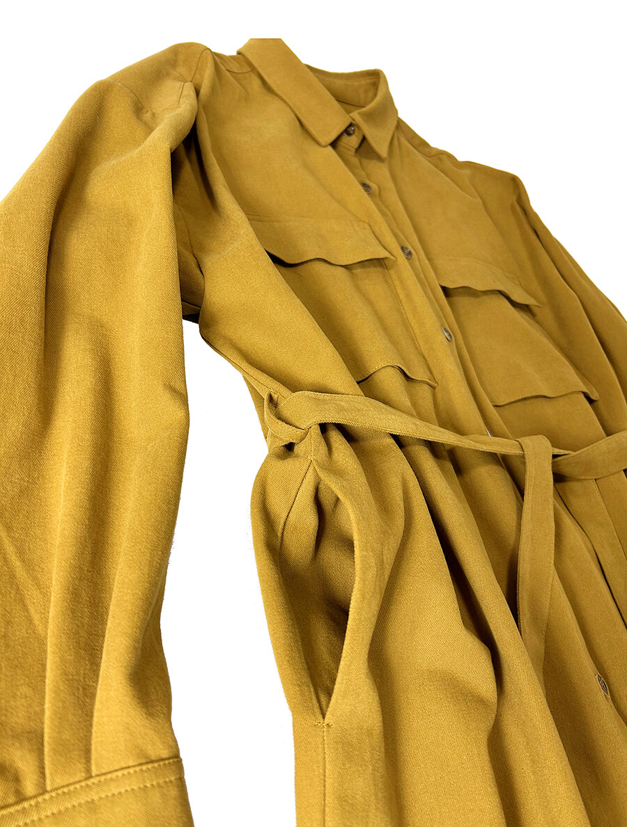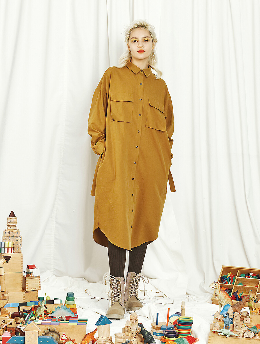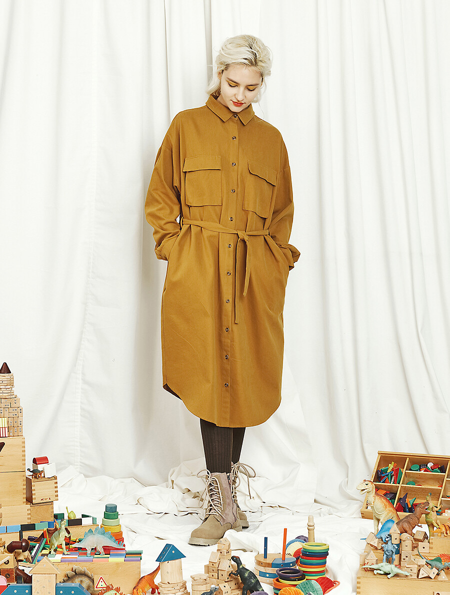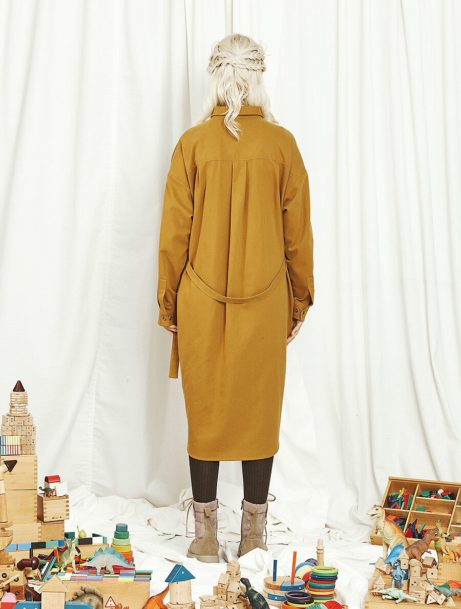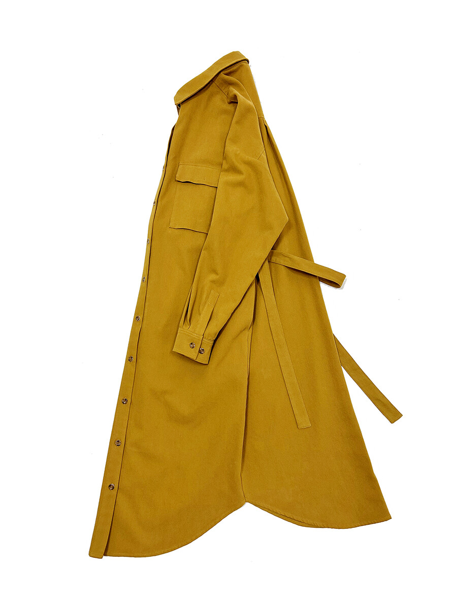 16수 트윌 코튼 소재로 피치의 부드러운 터치감과 바이오 워싱으로 더 깊이감이 생긴 머스터드 컬러가 착용자와 실루엣에서 그대로 느껴지는 부드러우면서도 포근한 벨티드 셔츠드레스입니다. 2개의 입체 빅포켓과 사이드 포켓이 각자가 있어야 할 가장 아름다운 위치에 자리잡고 있습니다.