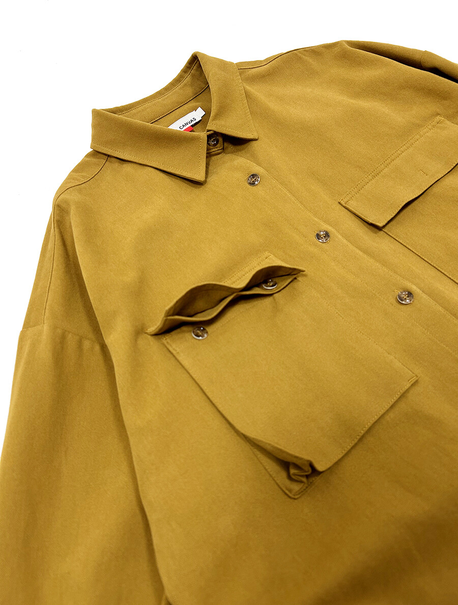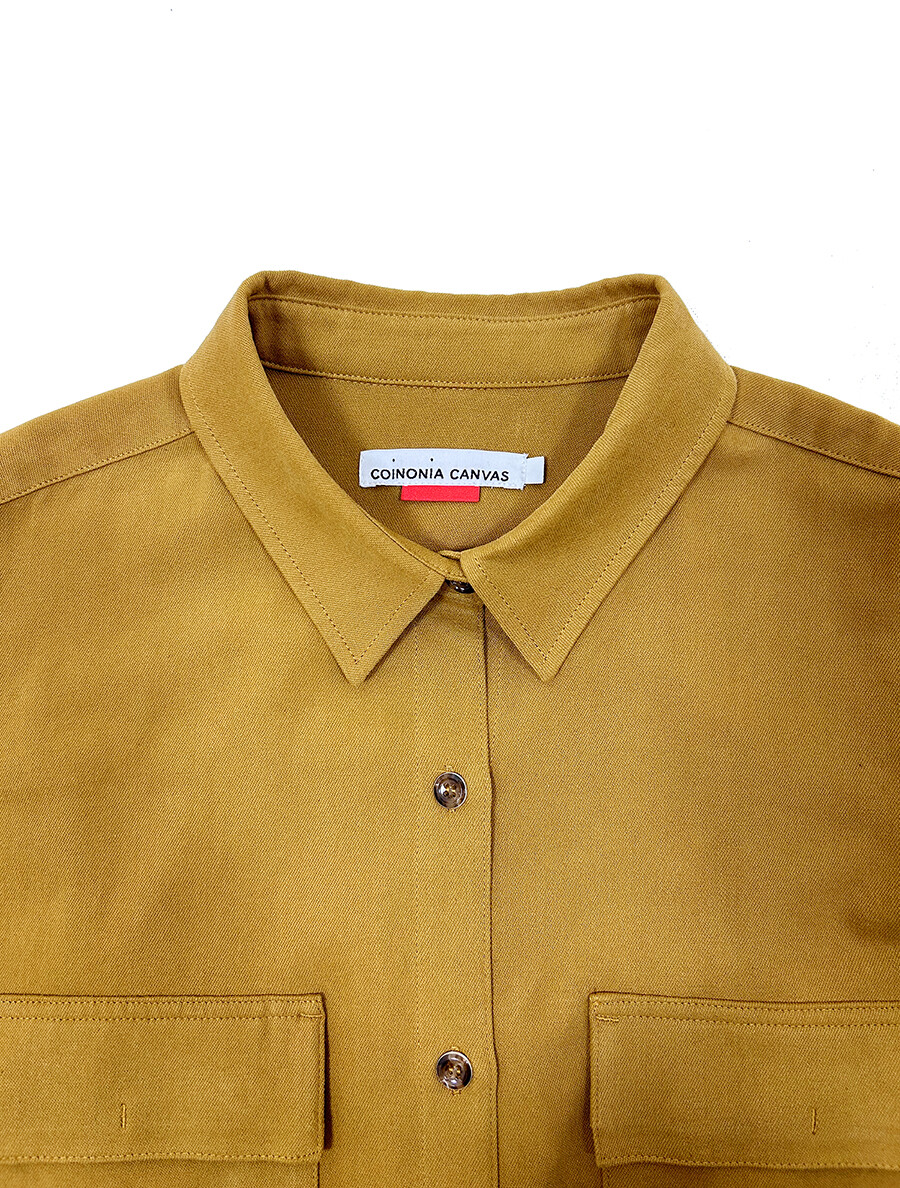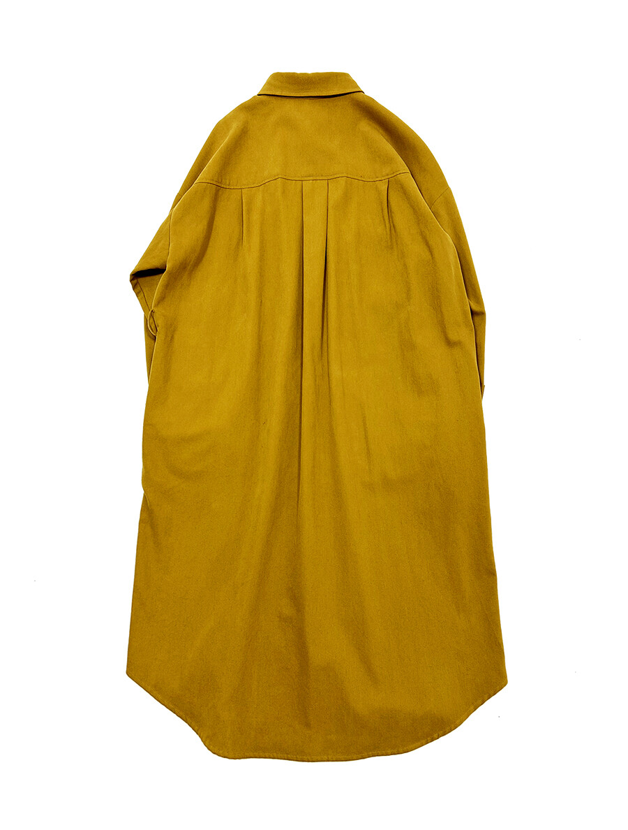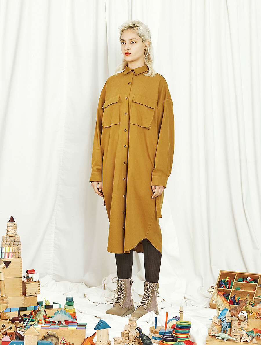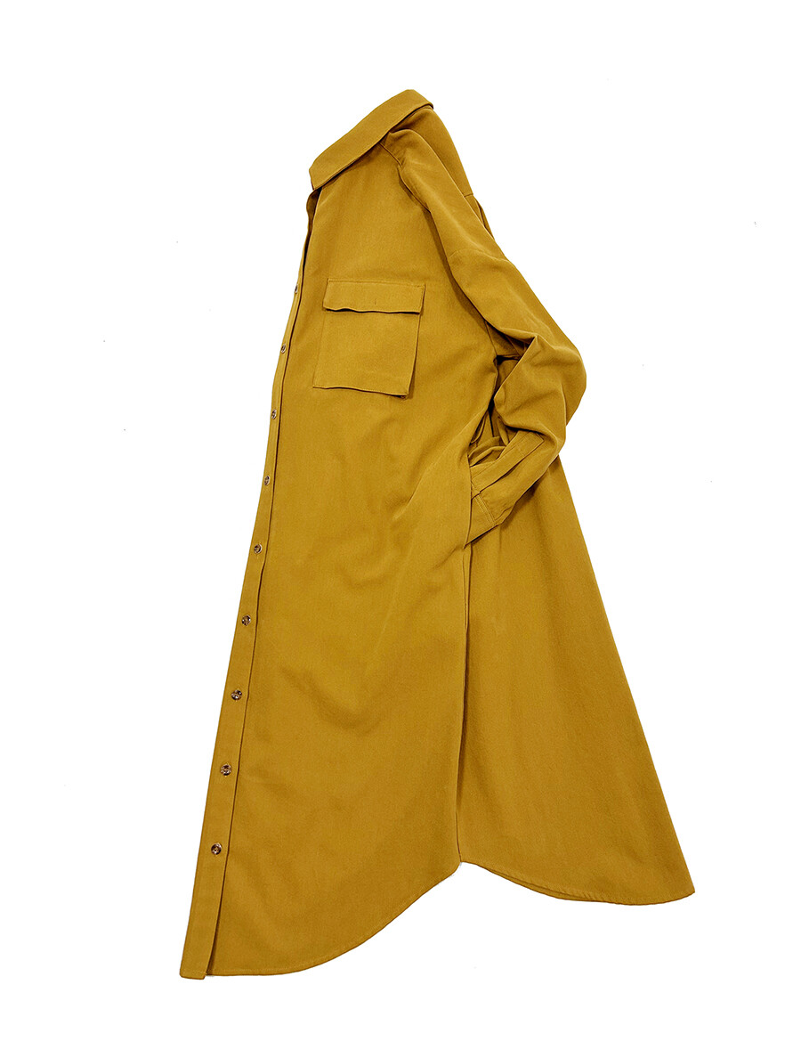 16수 트윌 코튼 소재로 피치의 부드러운 터치감과 바이오 워싱으로 더 깊이감이 생긴 머스터드 컬러가 착용자와 실루엣에서 그대로 느껴지는 부드러우면서도 포근한 벨티드 셔츠드레스입니다. 2개의 입체 빅포켓과 사이드 포켓이 각자가 있어야 할 가장 아름다운 위치에 자리잡고 있습니다.