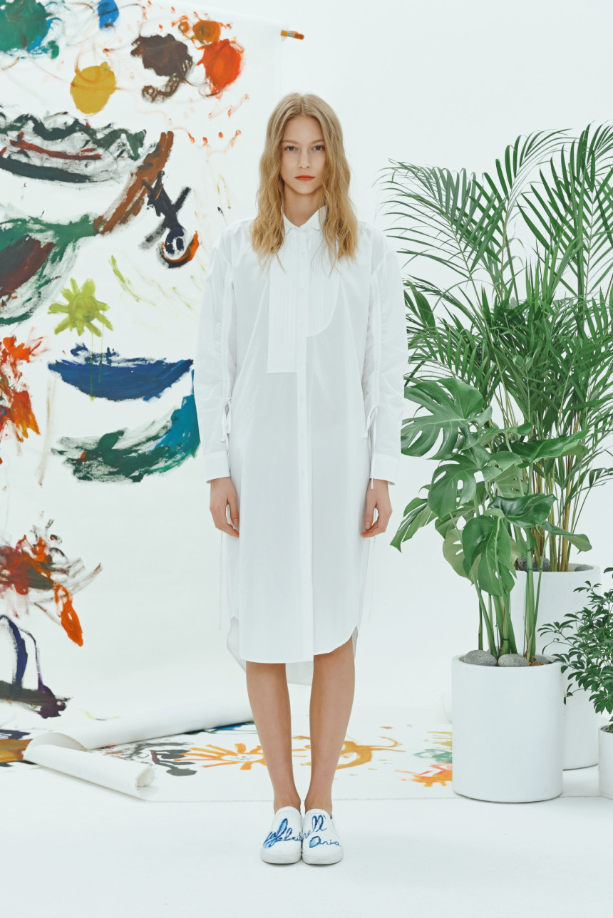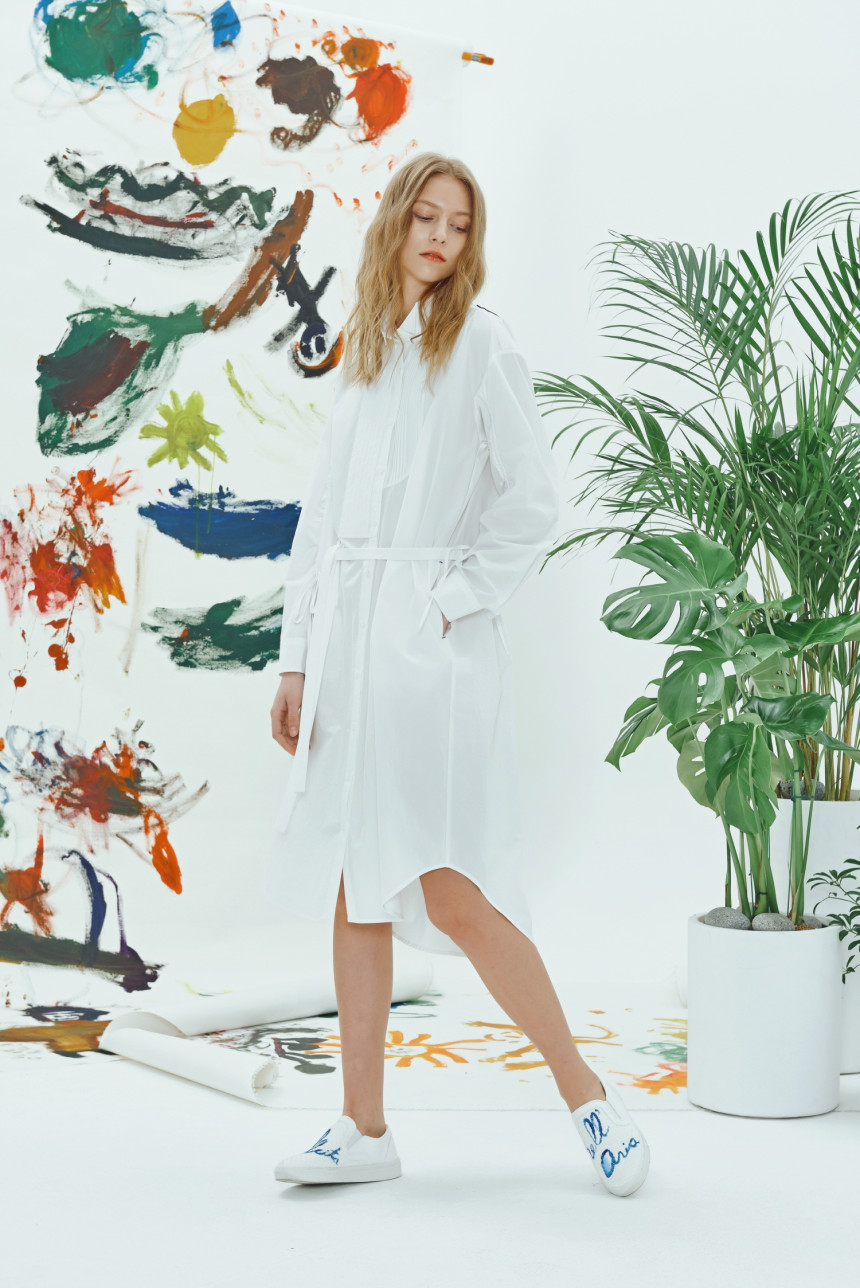 40수 바이오 워싱 코튼으로 만들어진 비대칭 핀턱 셔츠 드레스입니다. 앞부분은 남성복의 턱시도 셔츠 카라와 좌 우가 비대칭으로 디자인된 핀턱 디자인이 마치 그림을 보는듯합니다. 소매에는 얇은 터널이 있어서 스트링으로 길이를 조절할 수 있고 조절하면서 자연스럽게 패턴이 변형되며 잔잔한 주름이 생깁니다.