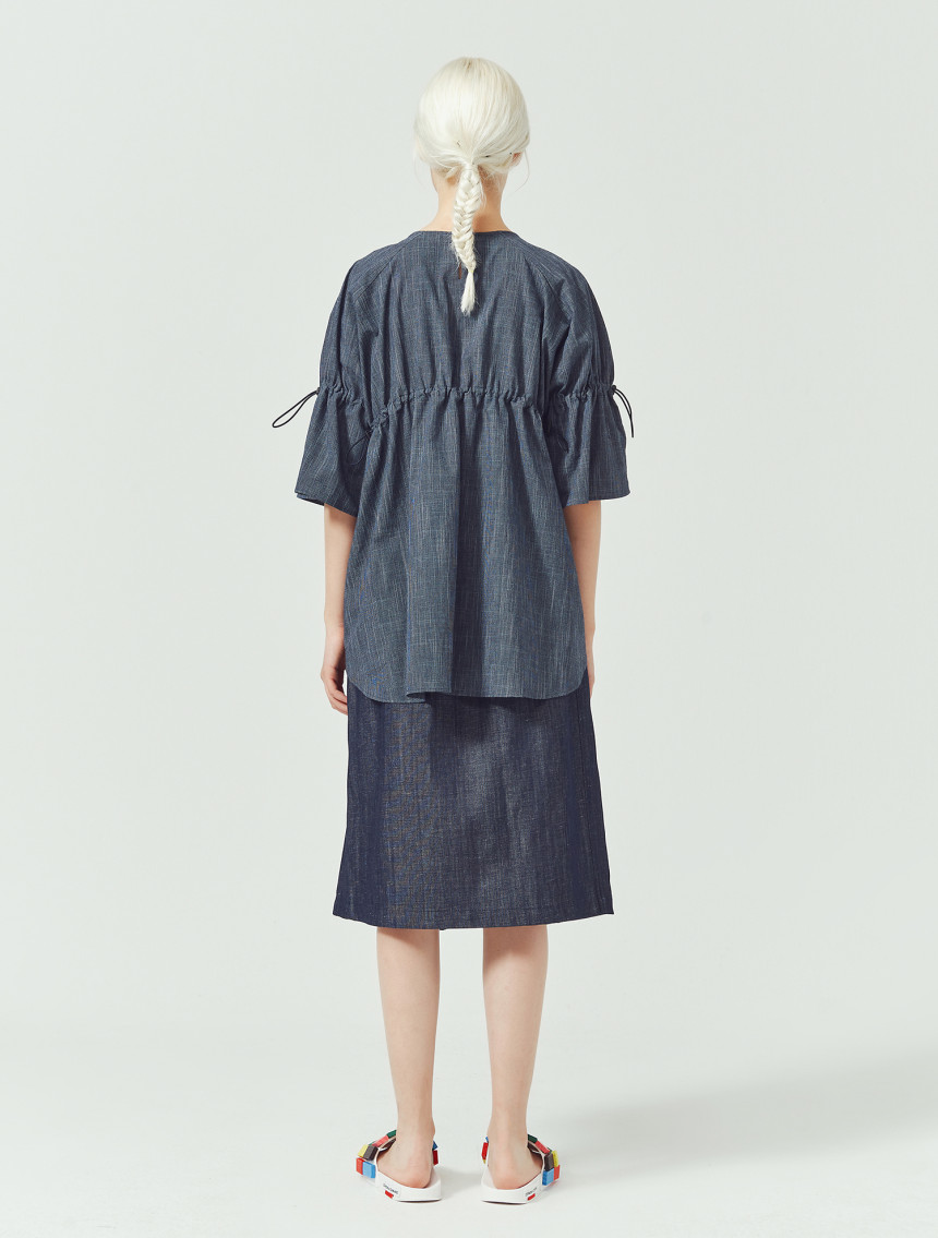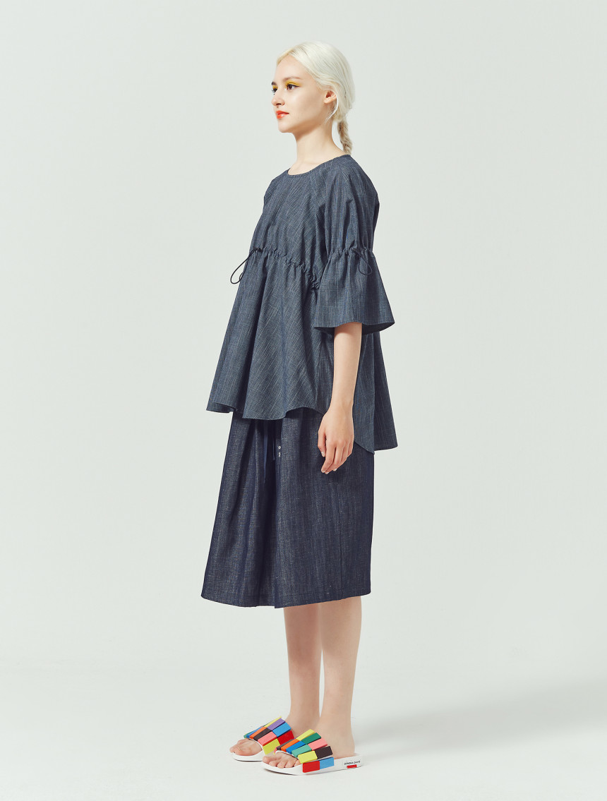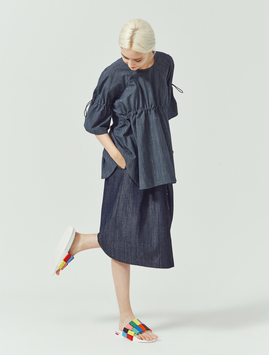 가볍고 쾌적한 슬럽 인디고 소재로 제작된 [Slub indigo string top]입니다. 착용자의 체형과 스타일에 따라 스톱퍼로 주름의 양을 조절해서 자신만의 볼륨감을 만들 수 있는 특성이 있습니다. 특히, 엘라스틱 스트링을 사용하여서 주름을 많이 주어도 답답하지 않는 활동량과 편안한 착용감을 보장합니다. 제품은 출고 시 디자이너에 의해 적당량의 주름이 잡혀진 상태에서 출고가 됩니다.