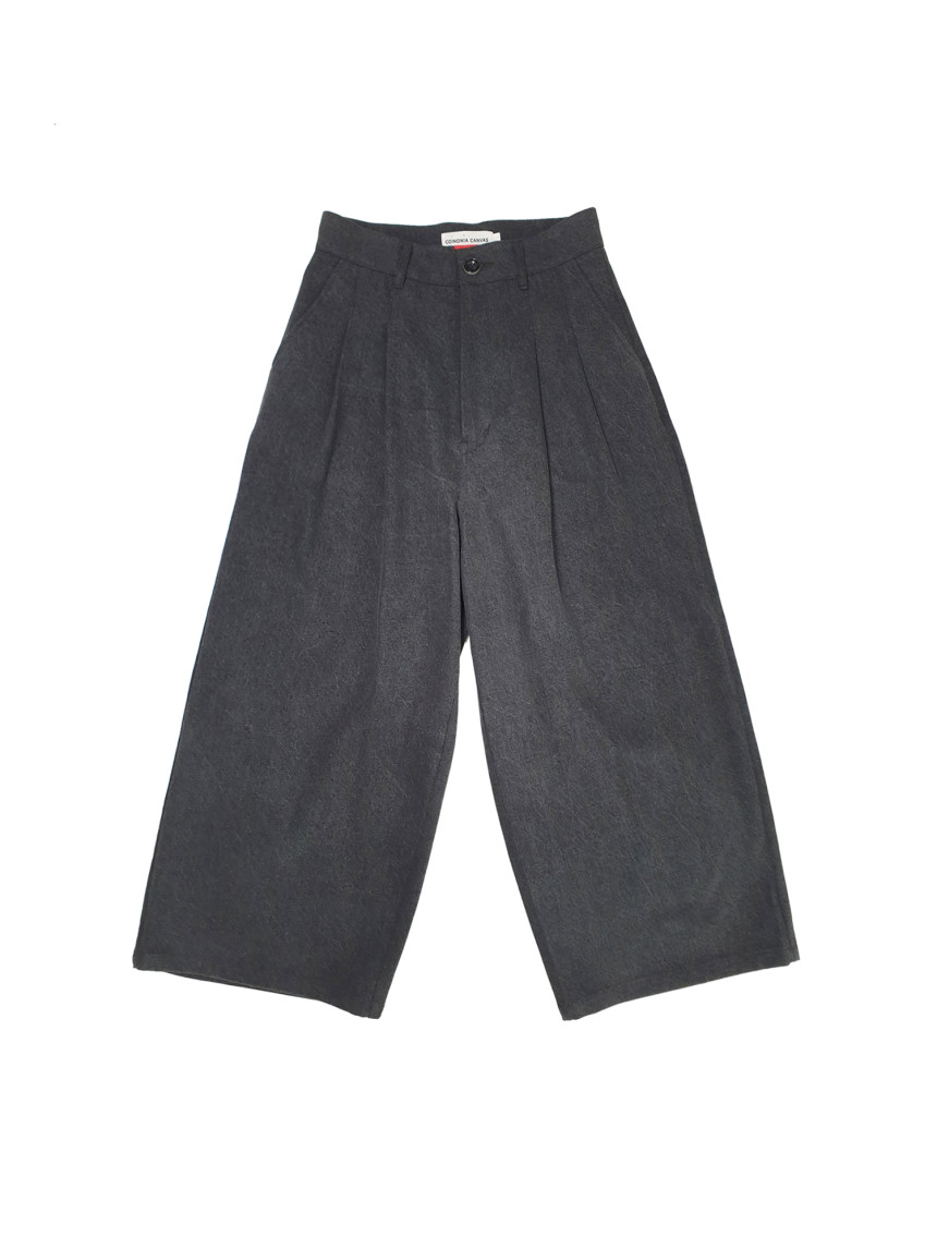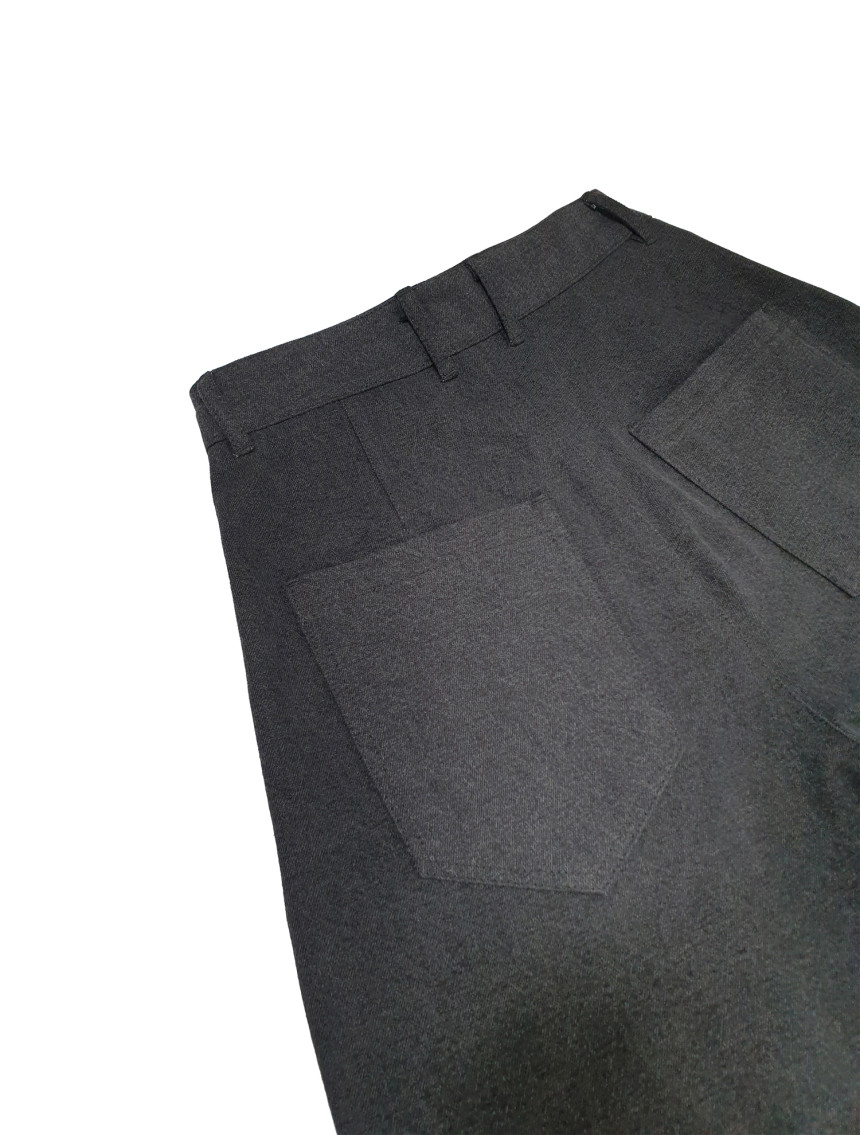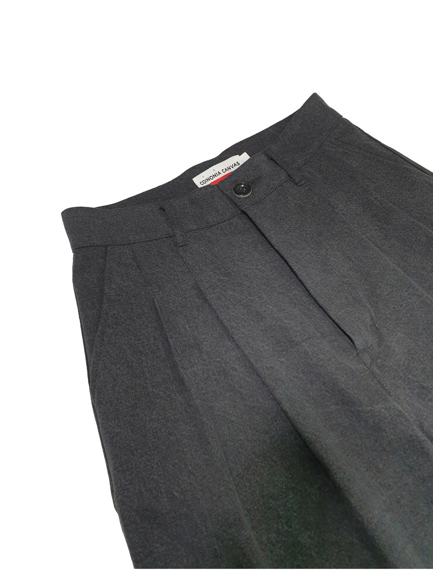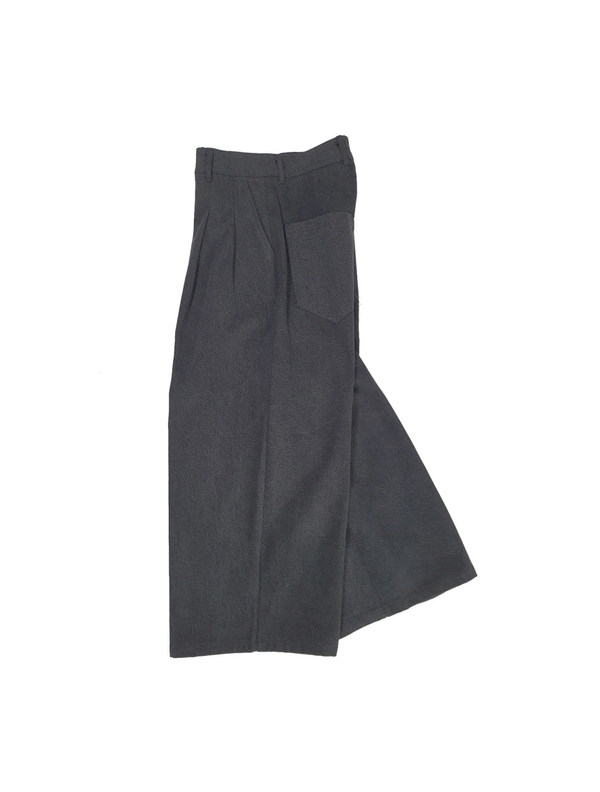 와이드 차콜 데님 팬츠입니다. 차콜 컬러의 빈티지 느낌의 20수 데님을 사용한 와이드 핏으로 앞쪽의 두개의 턱과 힙쪽의 빅 포켓은 편안한 착용감과 함께 스타일리쉬한 실루엣을 만들어 줍니다.