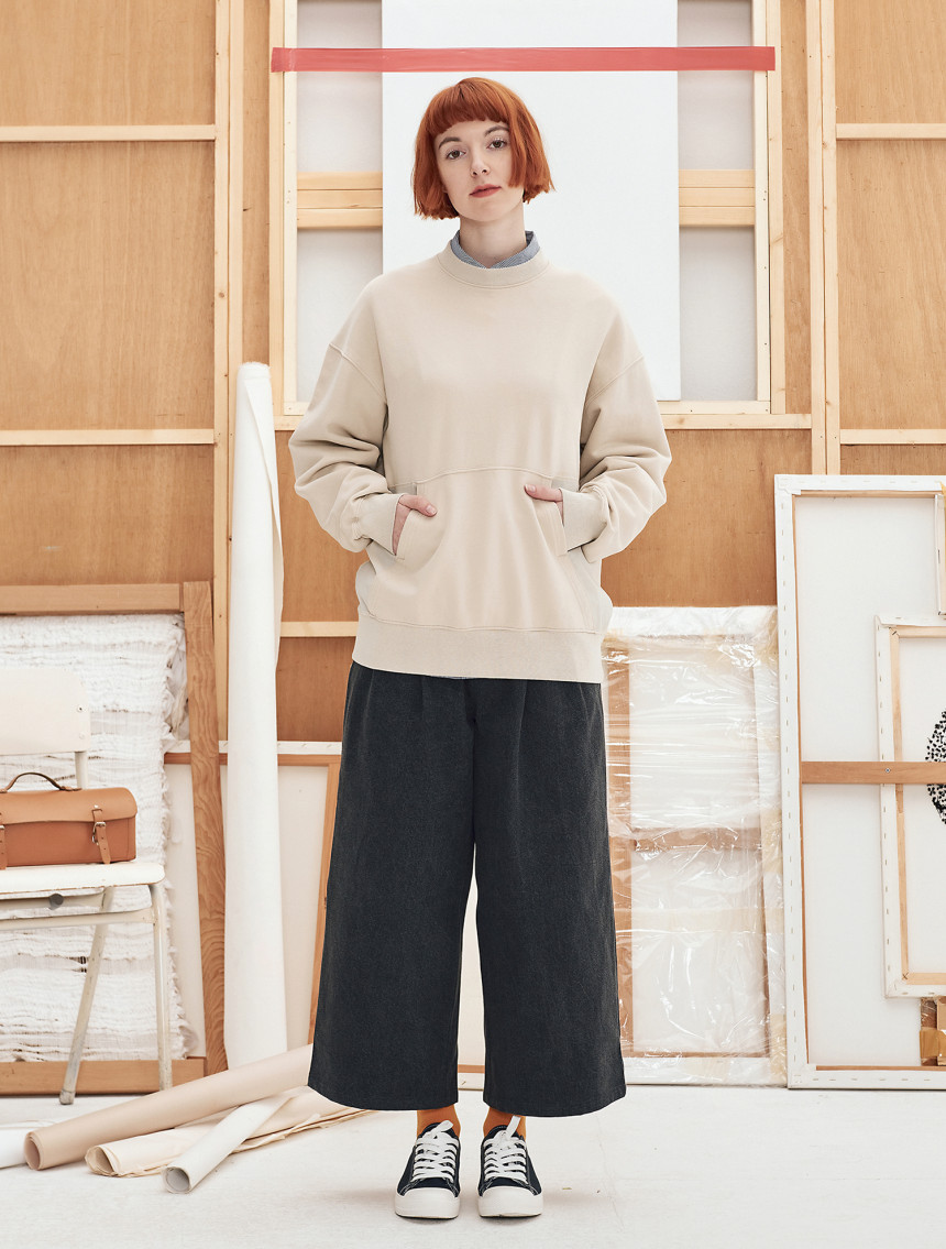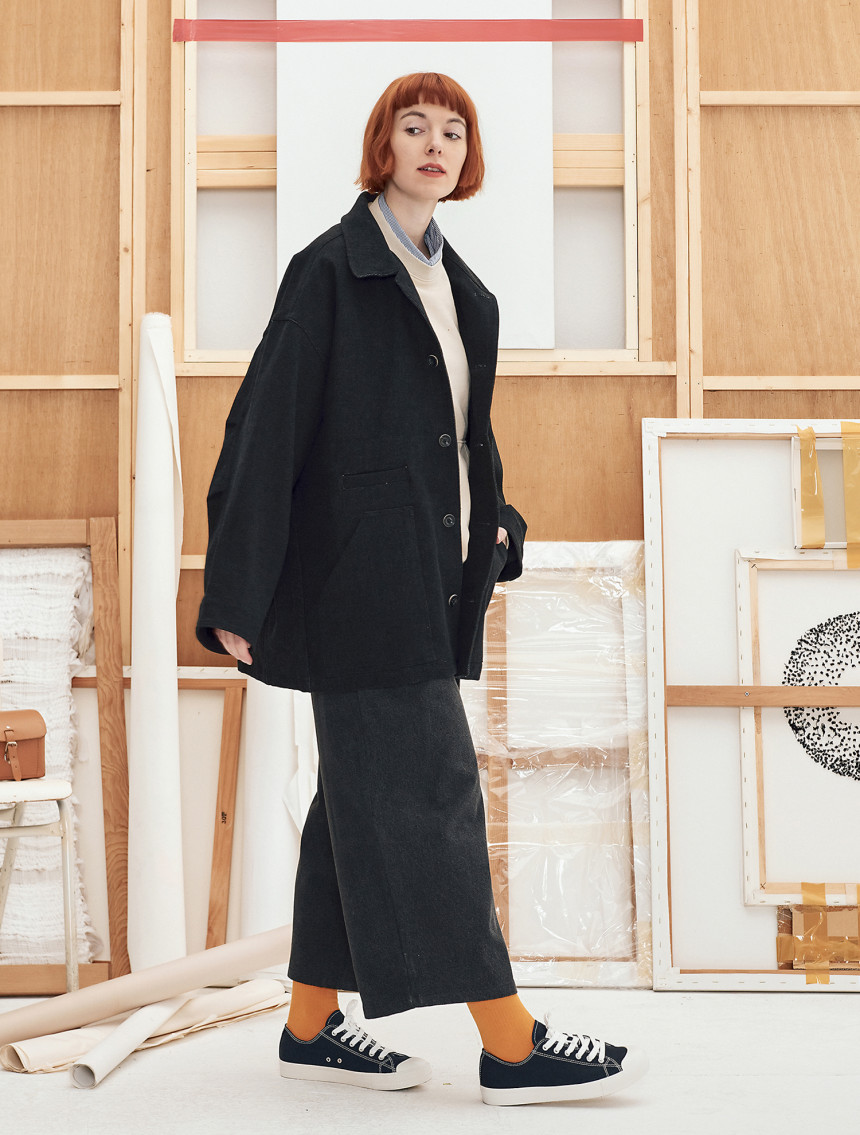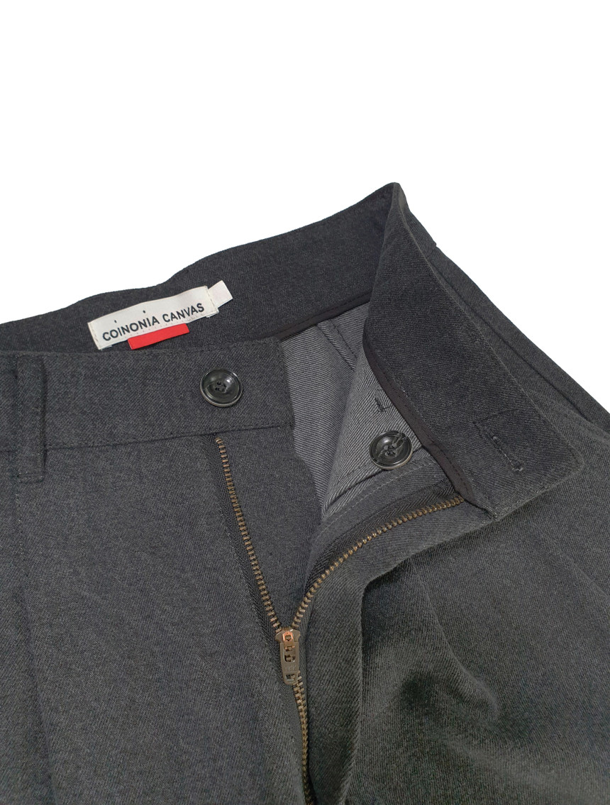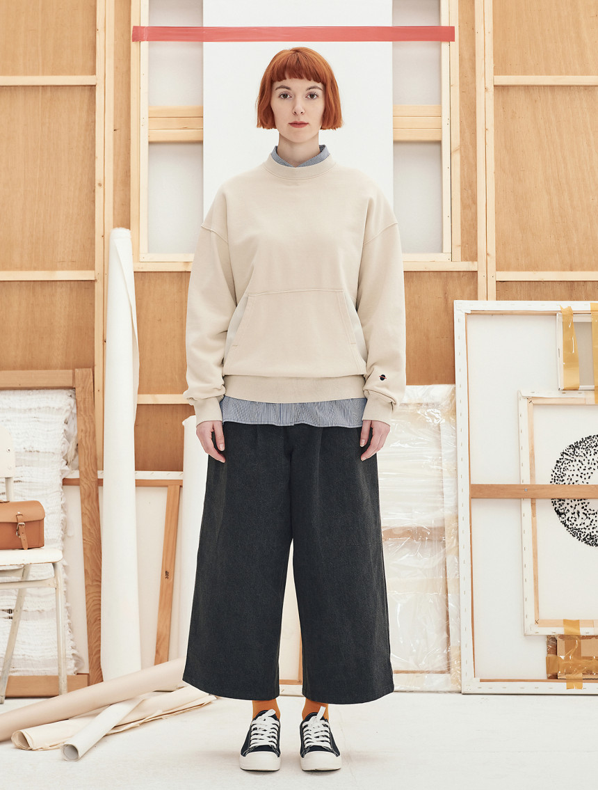 와이드 차콜 데님 팬츠입니다. 차콜 컬러의 빈티지 느낌의 20수 데님을 사용한 와이드 핏으로 앞쪽의 두개의 턱과 힙쪽의 빅 포켓은 편안한 착용감과 함께 스타일리쉬한 실루엣을 만들어 줍니다.
