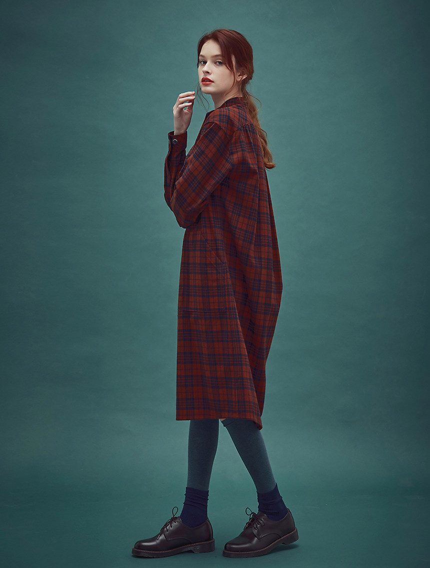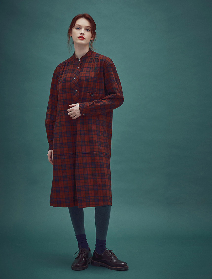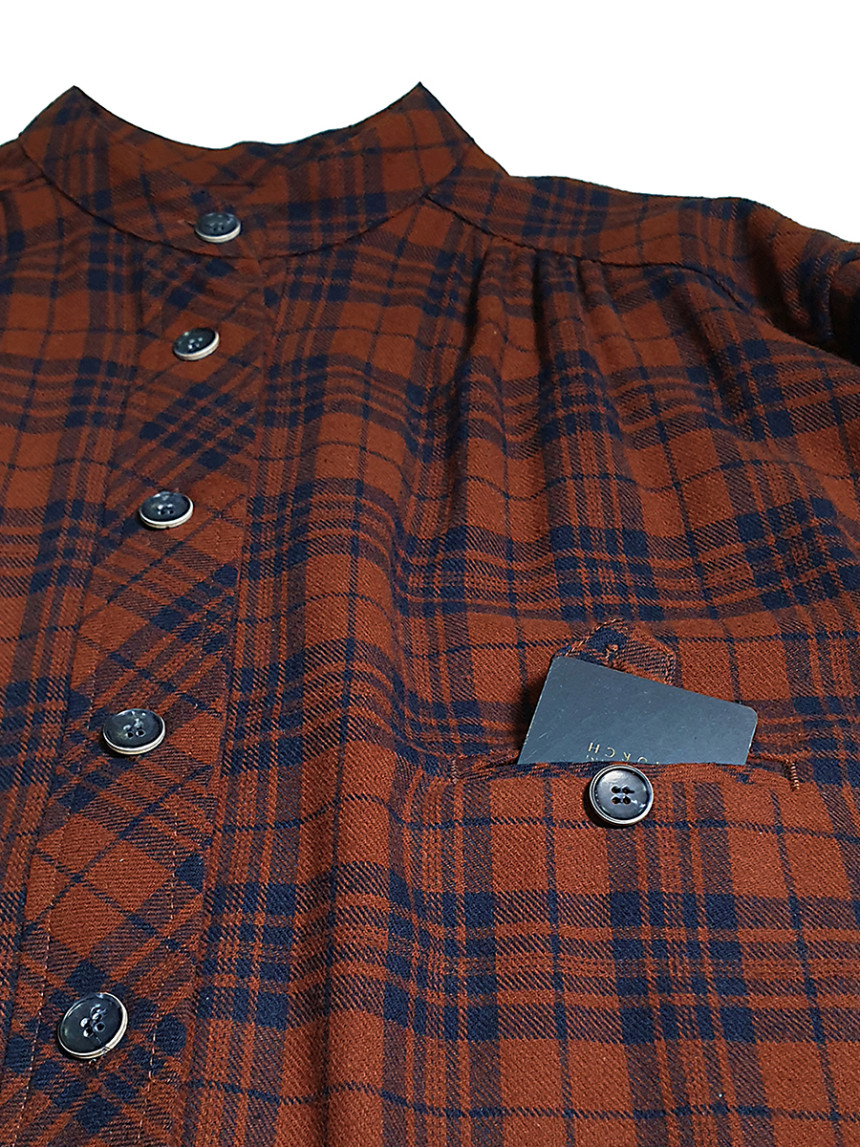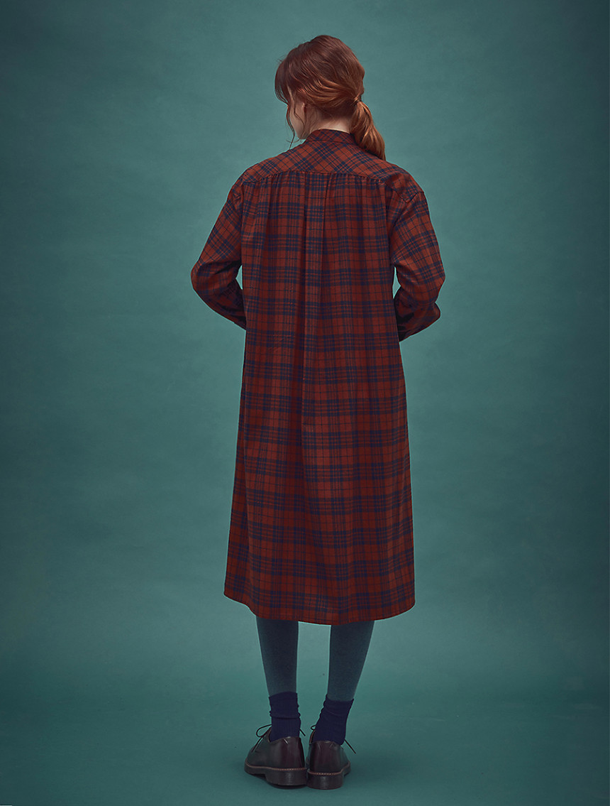 남성복 턱시도 셔츠의 디테일과 여성스러운 셔링 드레스를 하이브리드 시킨 풀오버 체스트넛 체크 드레스[Pullover chestnut check dress]입니다.