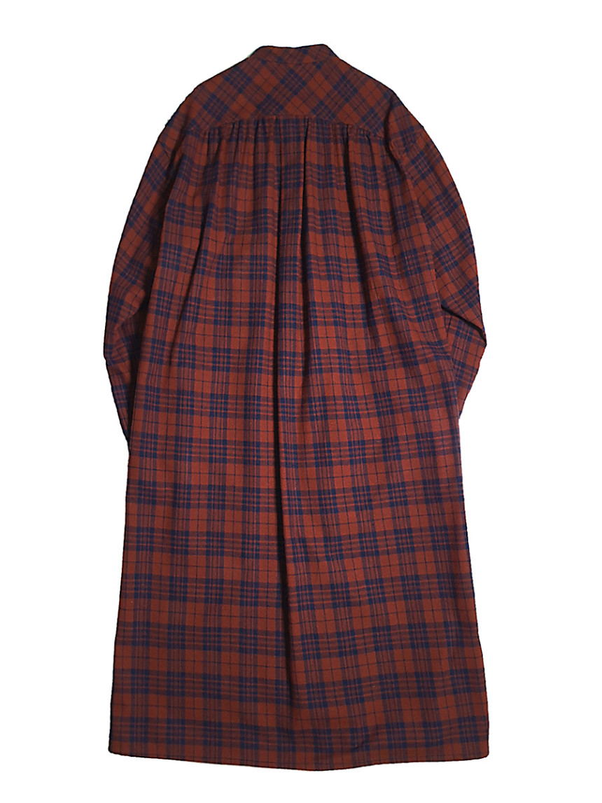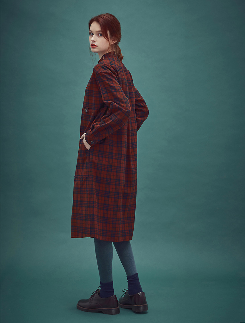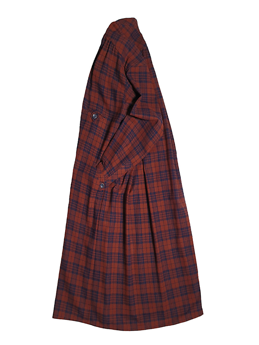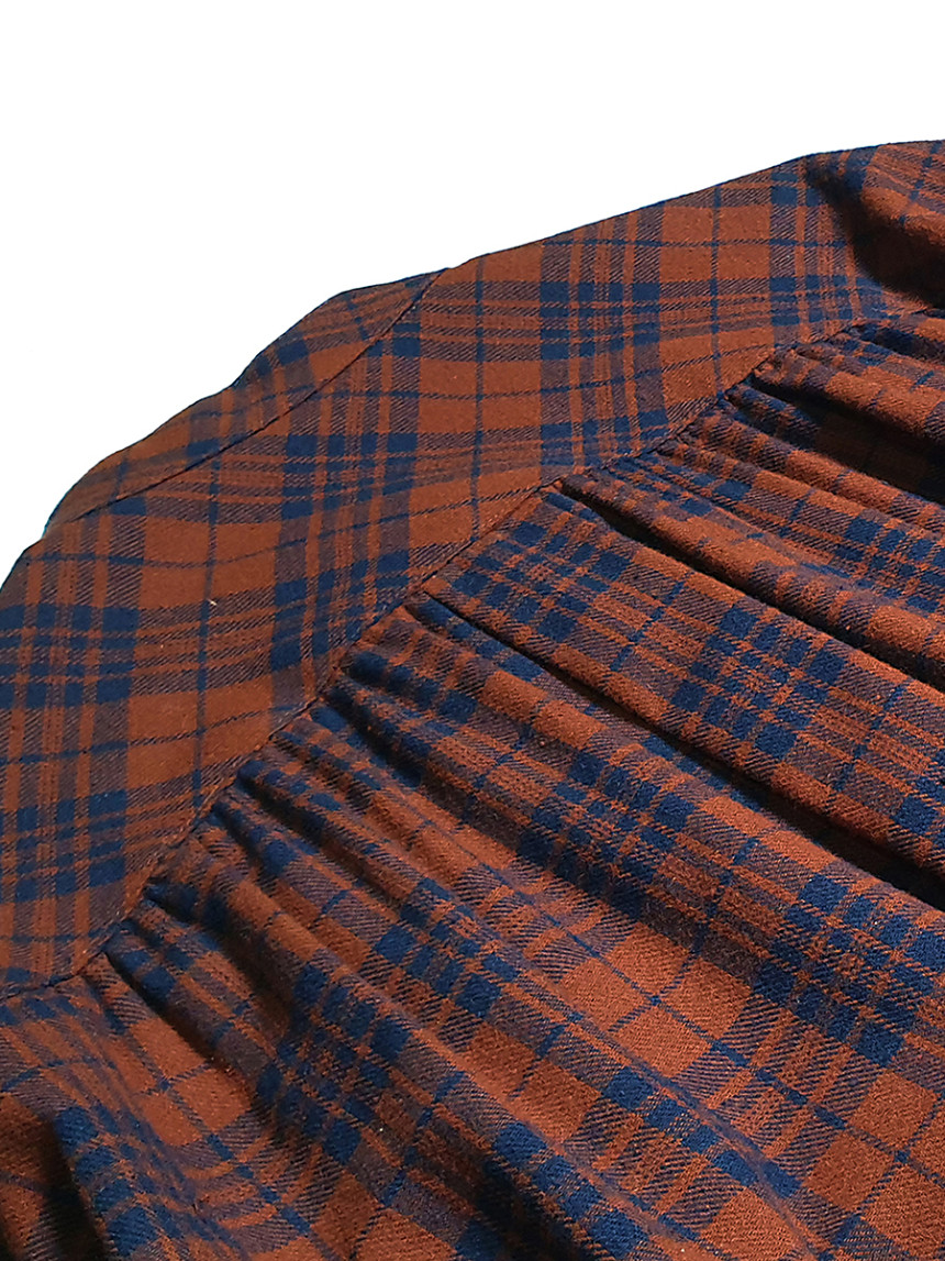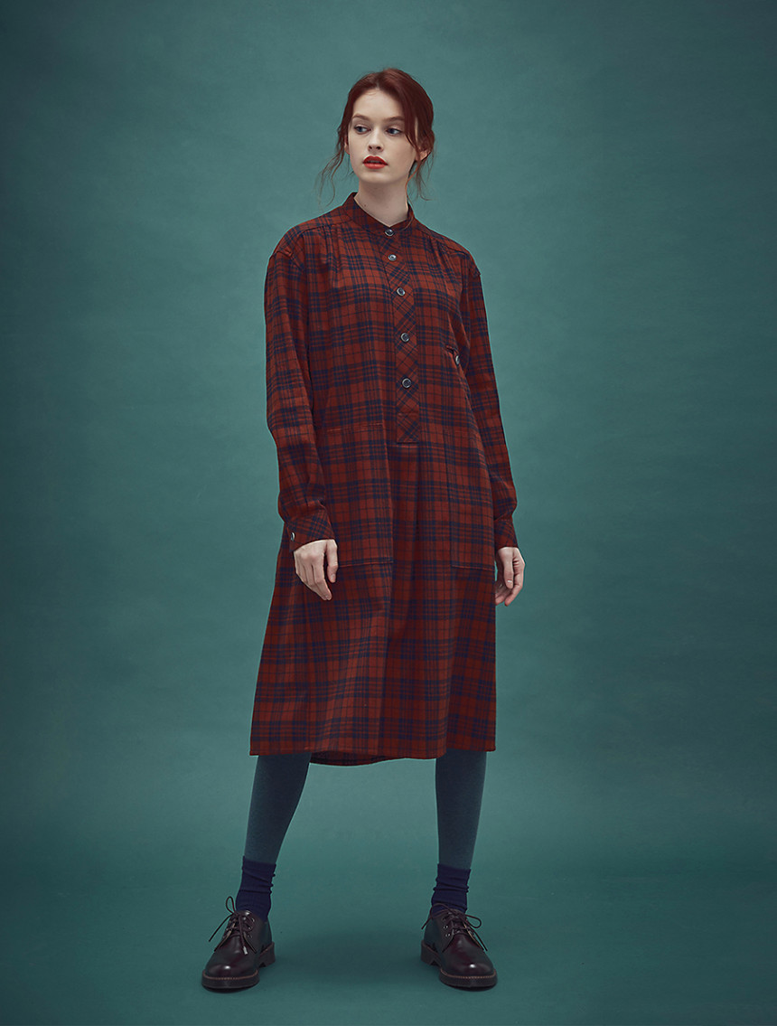 남성복 턱시도 셔츠의 디테일과 여성스러운 셔링 드레스를 하이브리드 시킨 풀오버 체스트넛 체크 드레스[Pullover chestnut check dress]입니다.