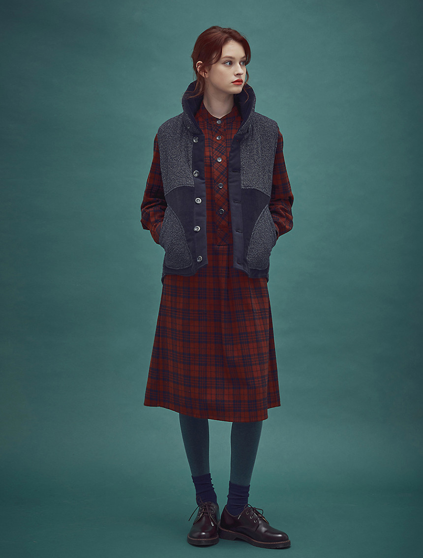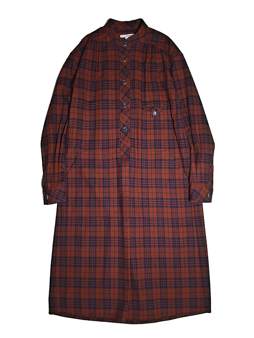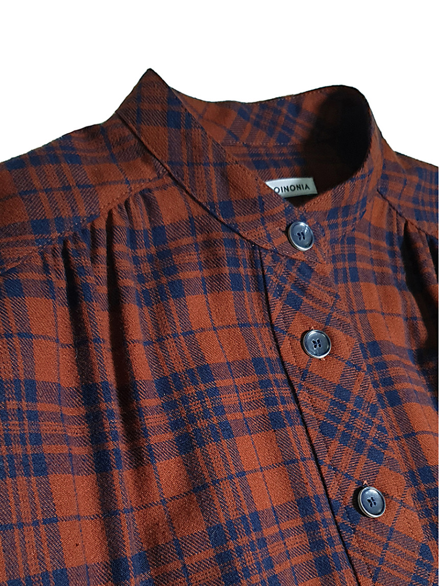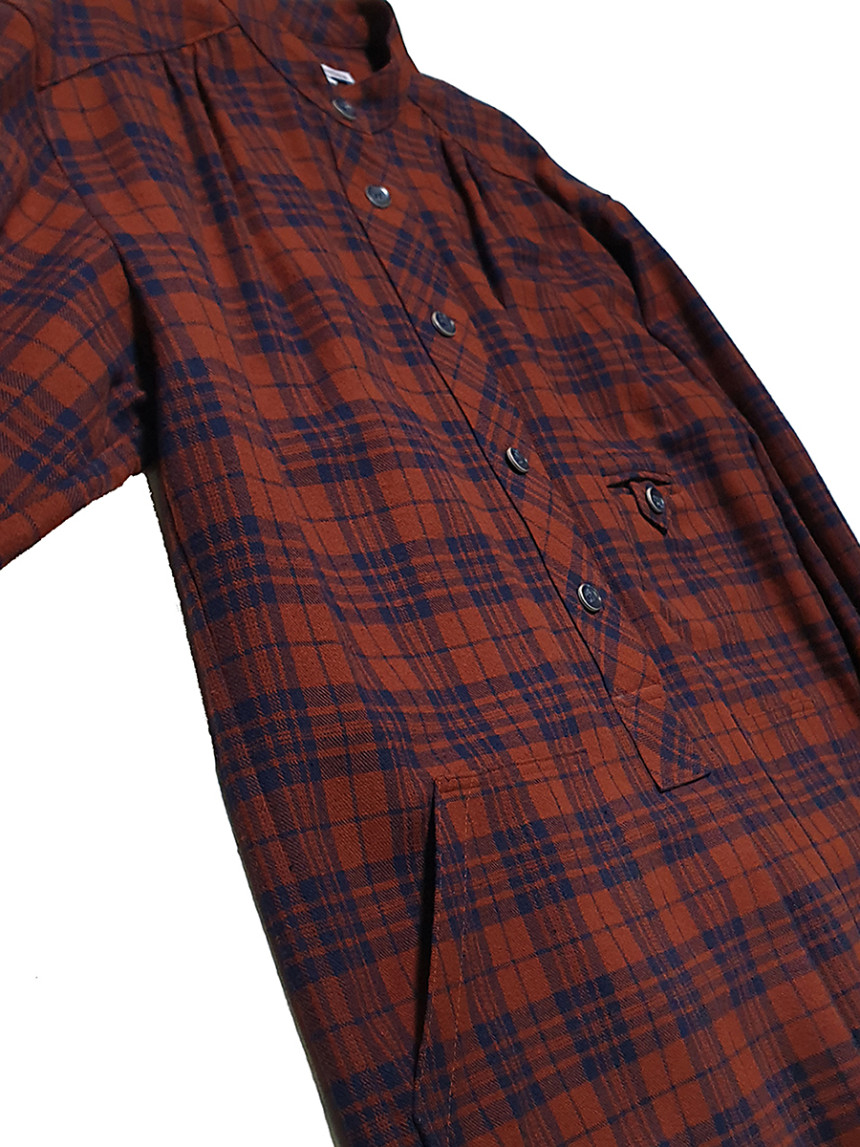 남성복 턱시도 셔츠의 디테일과 여성스러운 셔링 드레스를 하이브리드 시킨 풀오버 체스트넛 체크 드레스[Pullover chestnut check dress]입니다.
