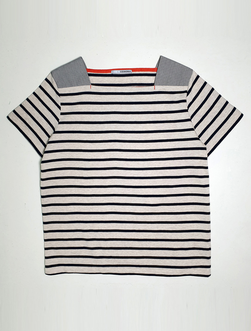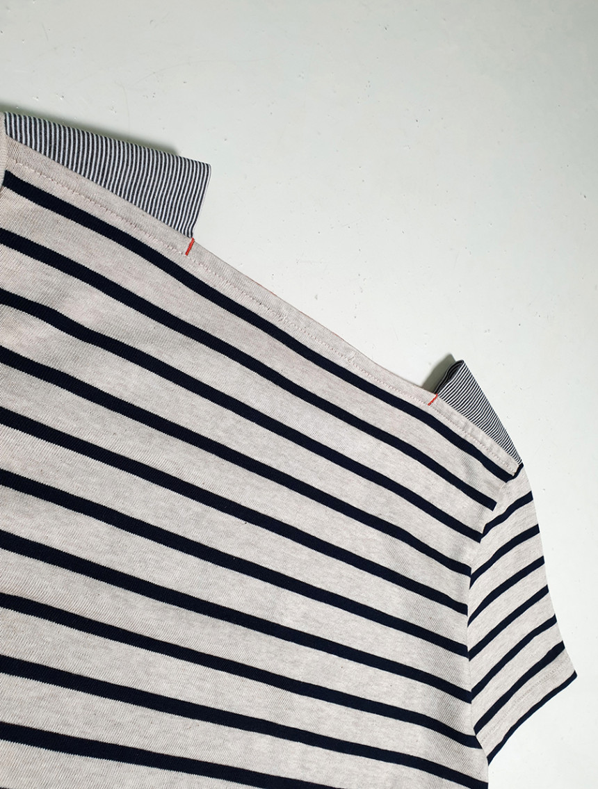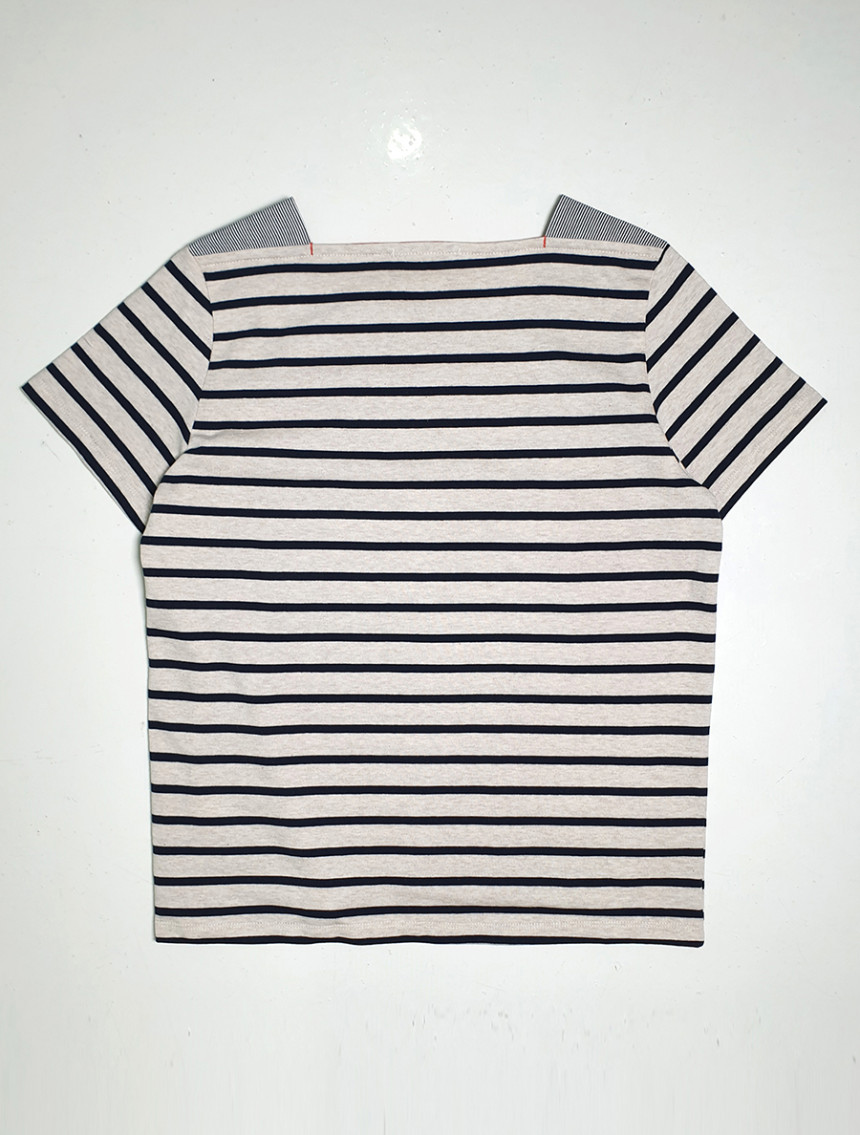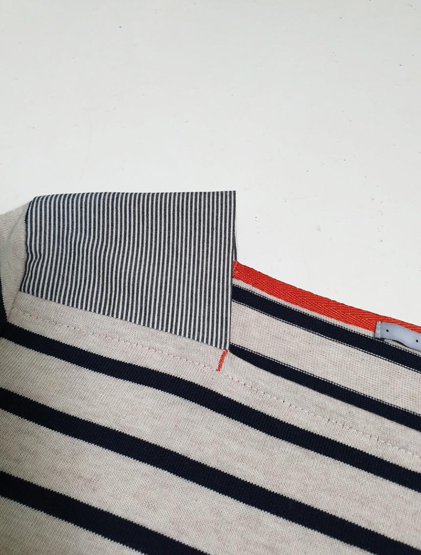 어깨부분은 30수 스트라이프 코튼 원단으로 어깨 심라인 없이 디자인 되어 어깨가 편안하고 여름에 달라 붙지 않아 시원합니다. 보트네크라인과 스퀘어 네트라인의 조합은 독특한 네크라인을 만들어 줍니다. 뒤쪽 네크라인에 오렌지색의 테이프로 목선이 늘어나지 않게 배색 되어있고 우븐원단과 니트 원단이 연결된 부분에 오렌지 바텍으로 포인트를 살리며 튼튼하게 마감 처리 되어 있습니다.