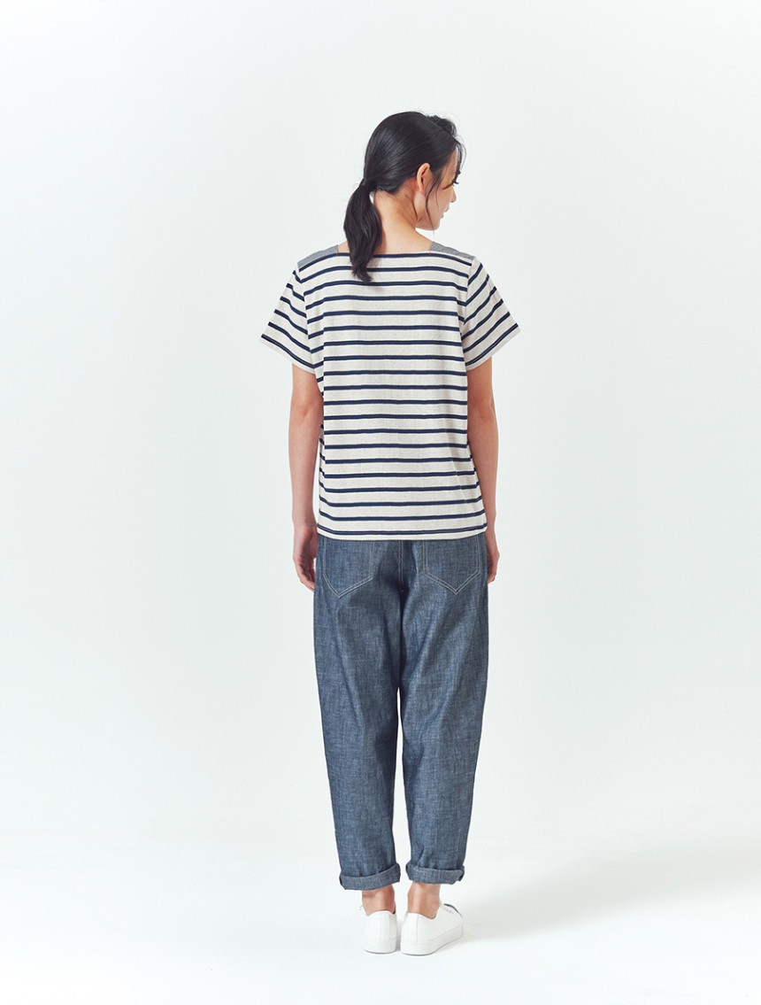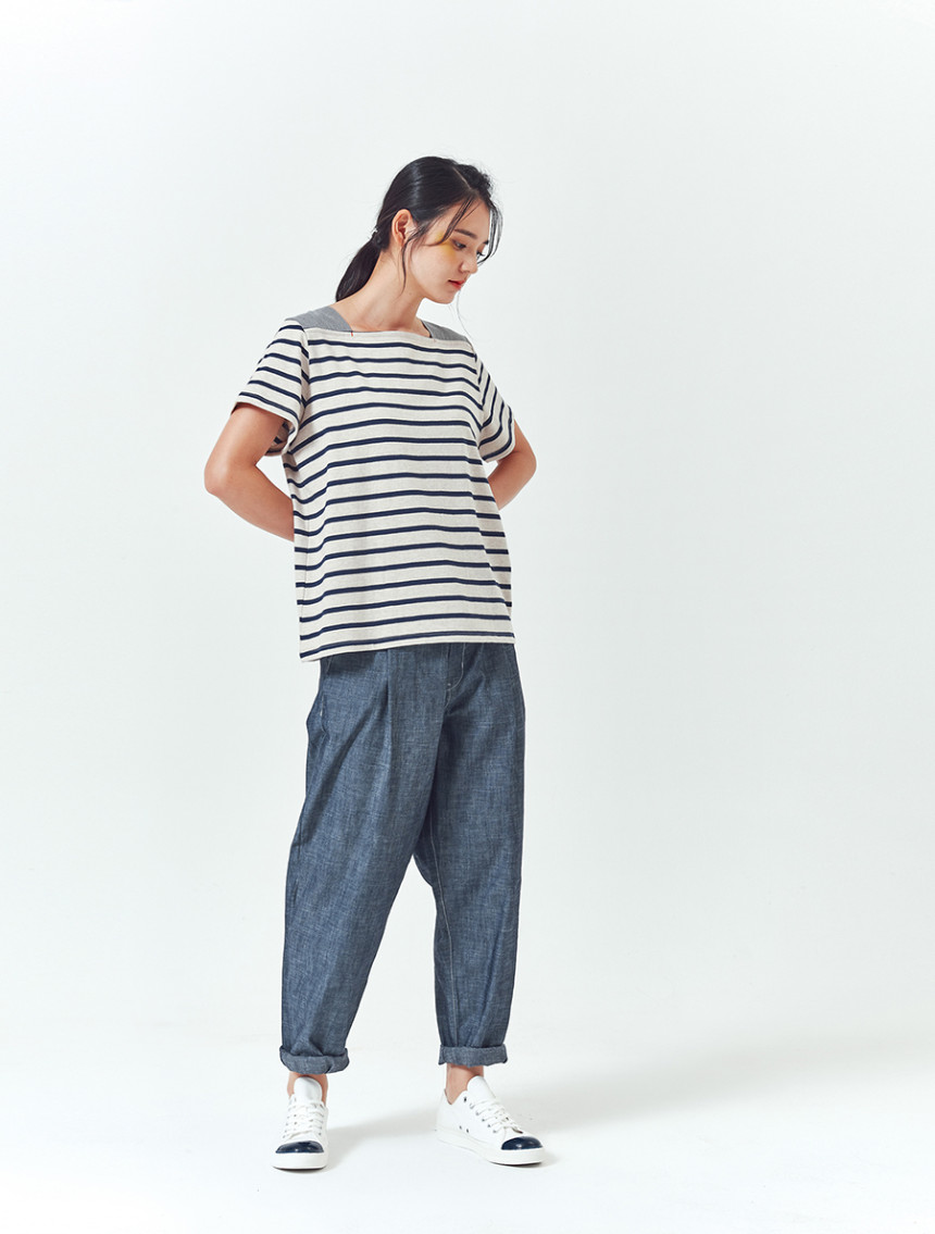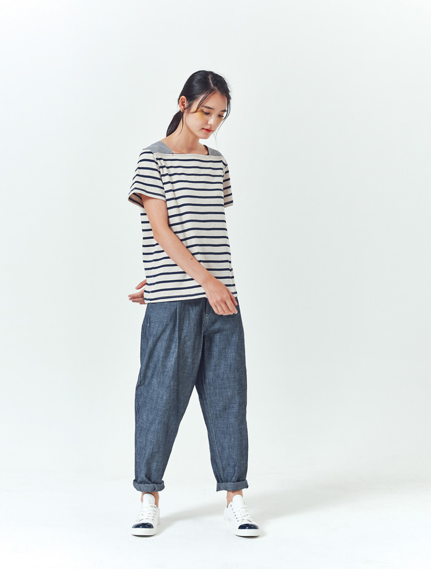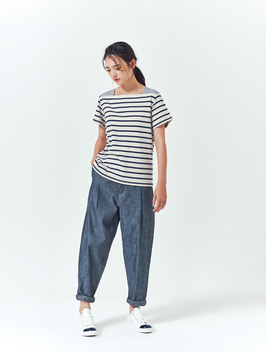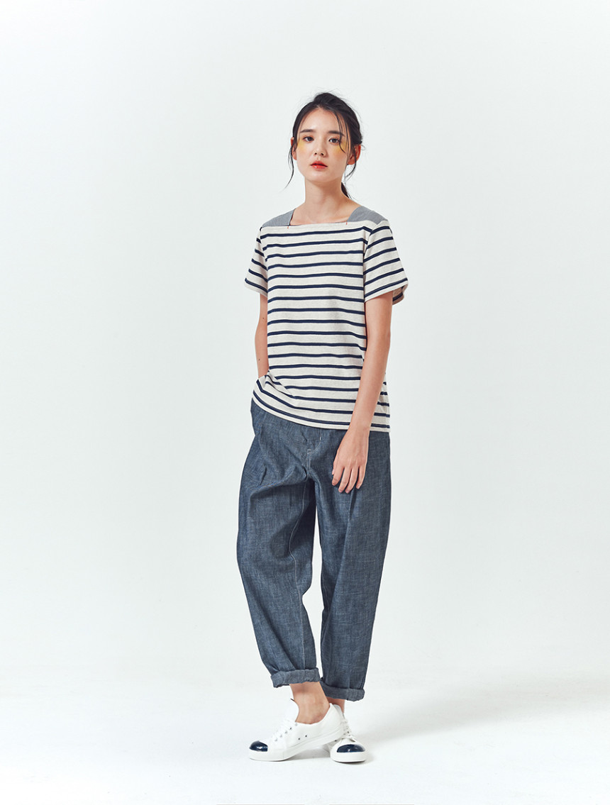 어깨부분은 30수 스트라이프 코튼 원단으로 어깨 심라인 없이 디자인 되어 어깨가 편안하고 여름에 달라 붙지 않아 시원합니다. 보트네크라인과 스퀘어 네트라인의 조합은 독특한 네크라인을 만들어 줍니다. 뒤쪽 네크라인에 오렌지색의 테이프로 목선이 늘어나지 않게 배색 되어있고 우븐원단과 니트 원단이 연결된 부분에 오렌지 바텍으로 포인트를 살리며 튼튼하게 마감 처리 되어 있습니다.