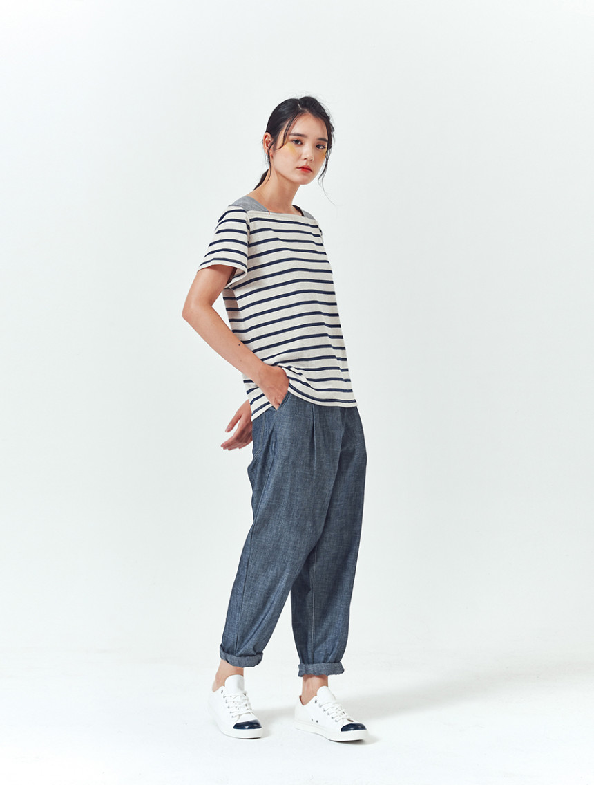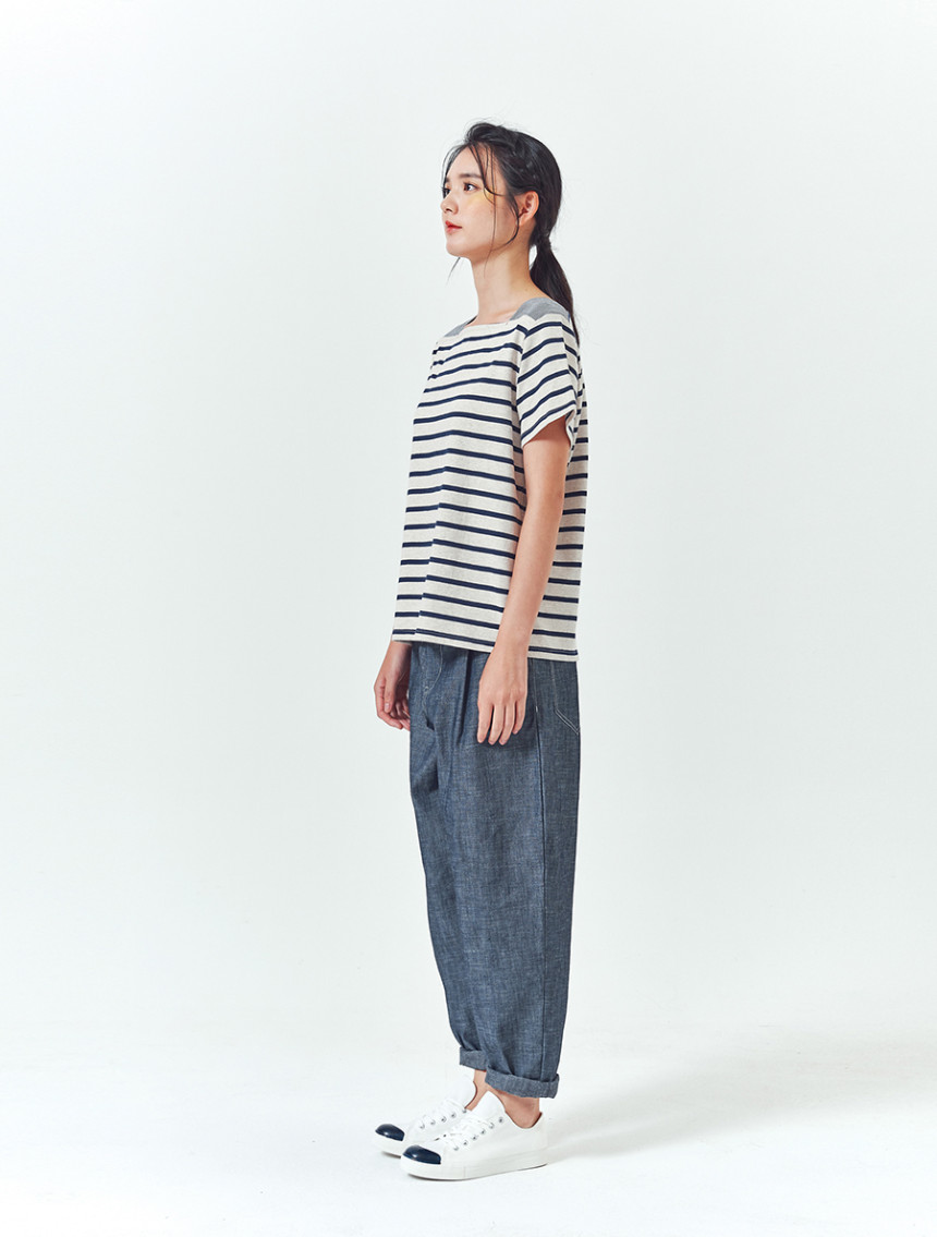 앞쪽과 뒤쪽 모두 스트라이프 선이 수평으로 잔잔히 살아 있어서 마치 평온한 바닷가에서 일출과 일몰을 보는 느낌의 [코이노니아 캔버스]의 회화적인 오리지널리티가 살아 있는 데일리 티셔츠입니다.