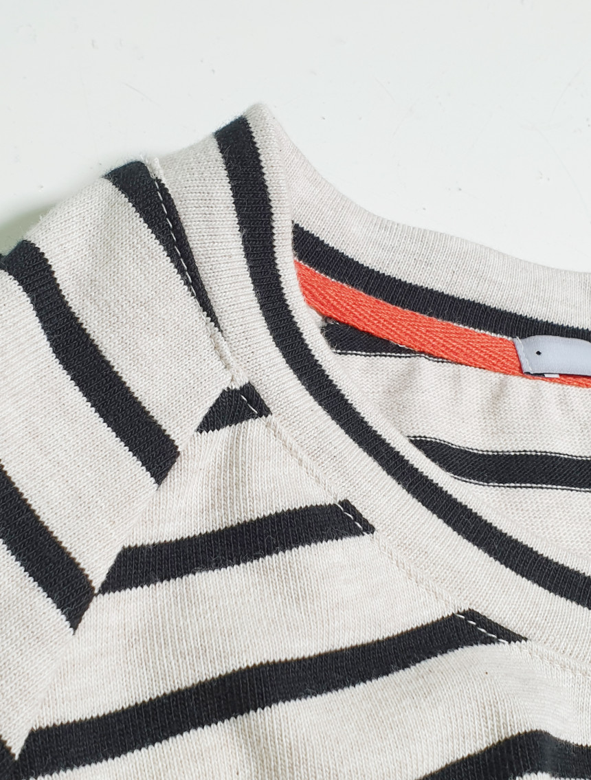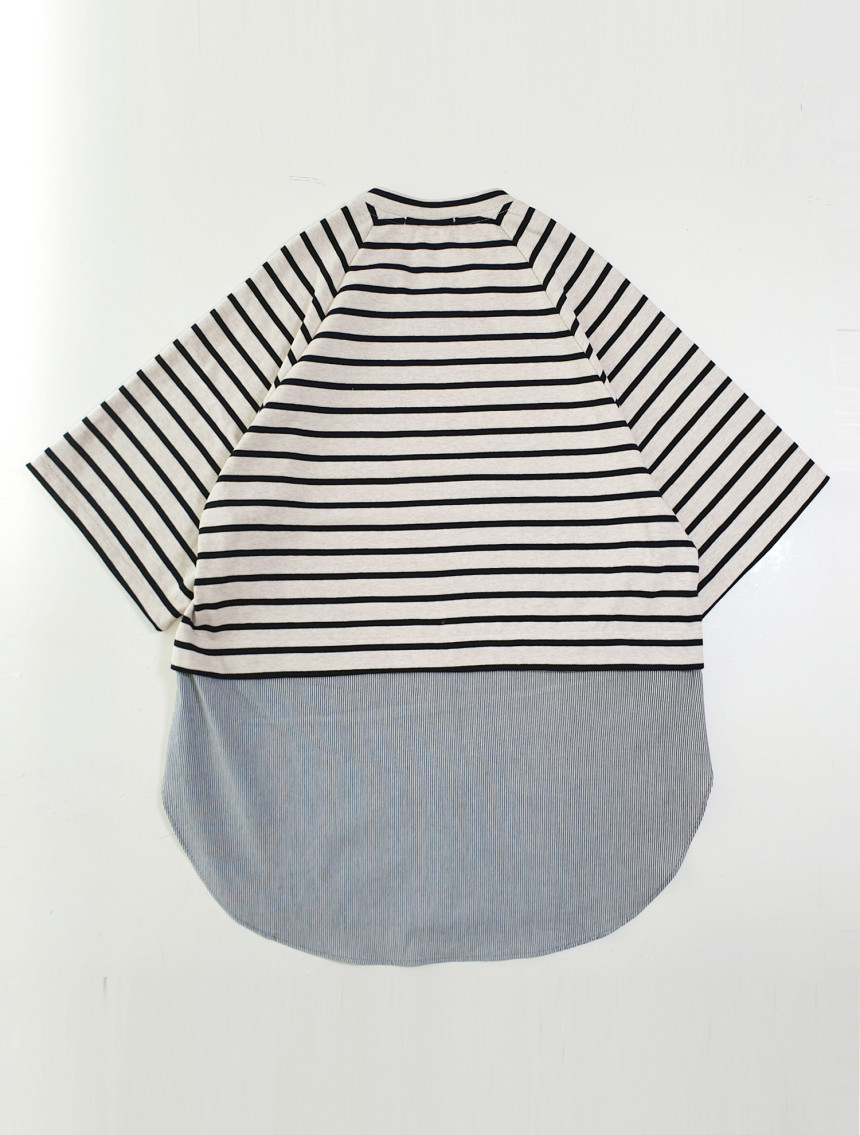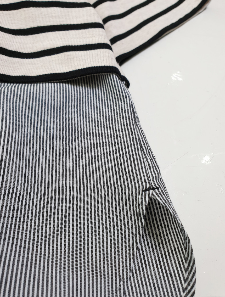 티셔츠와 버튼셔츠의 연결 부분도 한번 접어 봉제되어서 밋밋하지 않고 마치 레이어드룩을 입은 느낌을 줍니다.
