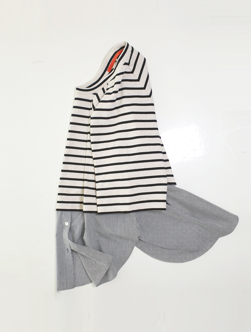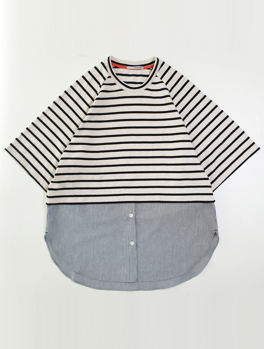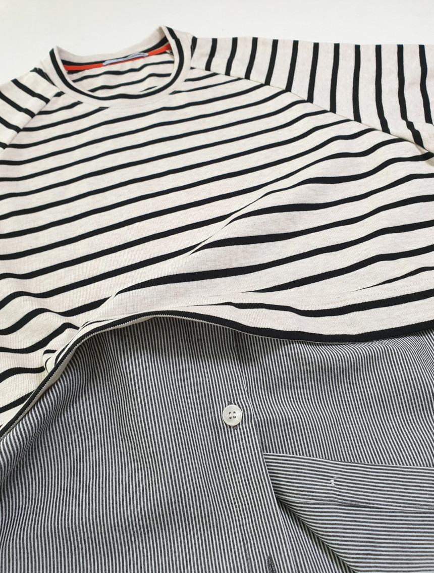 20수 코튼100% 니트 소재와 30수 선염 스트라이프 코튼으로 혼합하여 제작한 [티+버튼 셔츠]입니다.