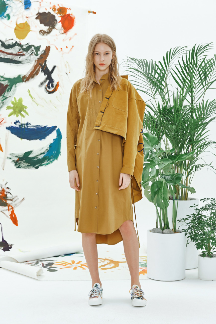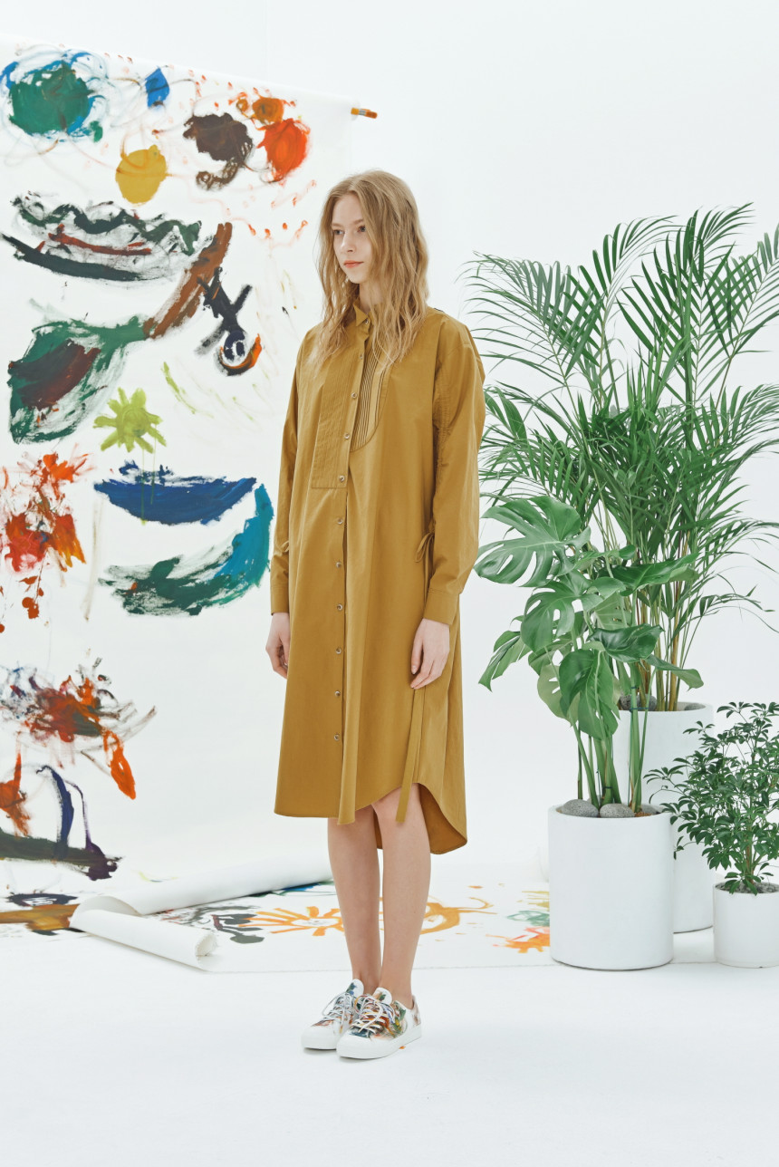 40수 바이오 워싱 코튼으로 만들어진 비대칭 핀턱 셔츠 드레스입니다. 앞부분은 남성복의 턱시도 셔츠 카라와 좌 우가 비대칭으로 디자인된 핀턱 디자인이 마치 그림을 보는듯합니다. 소매에는 얇은 터널이 있어서 스트링으로 길이를 조절할 수 있고 조절하면서 자연스럽게 패턴이 변형되며 잔잔한 주름이 생깁니다.