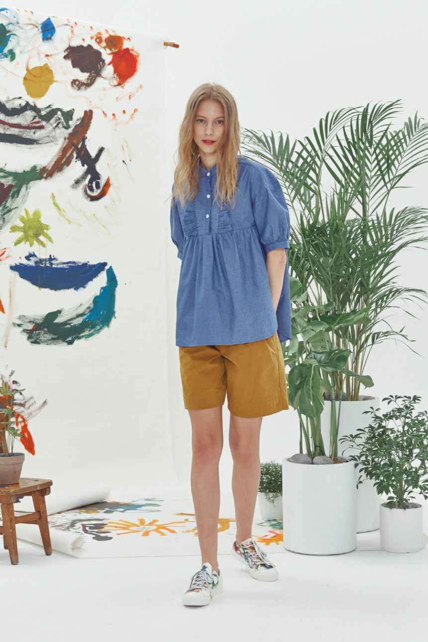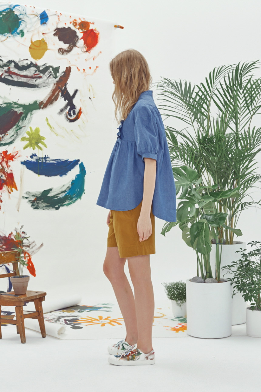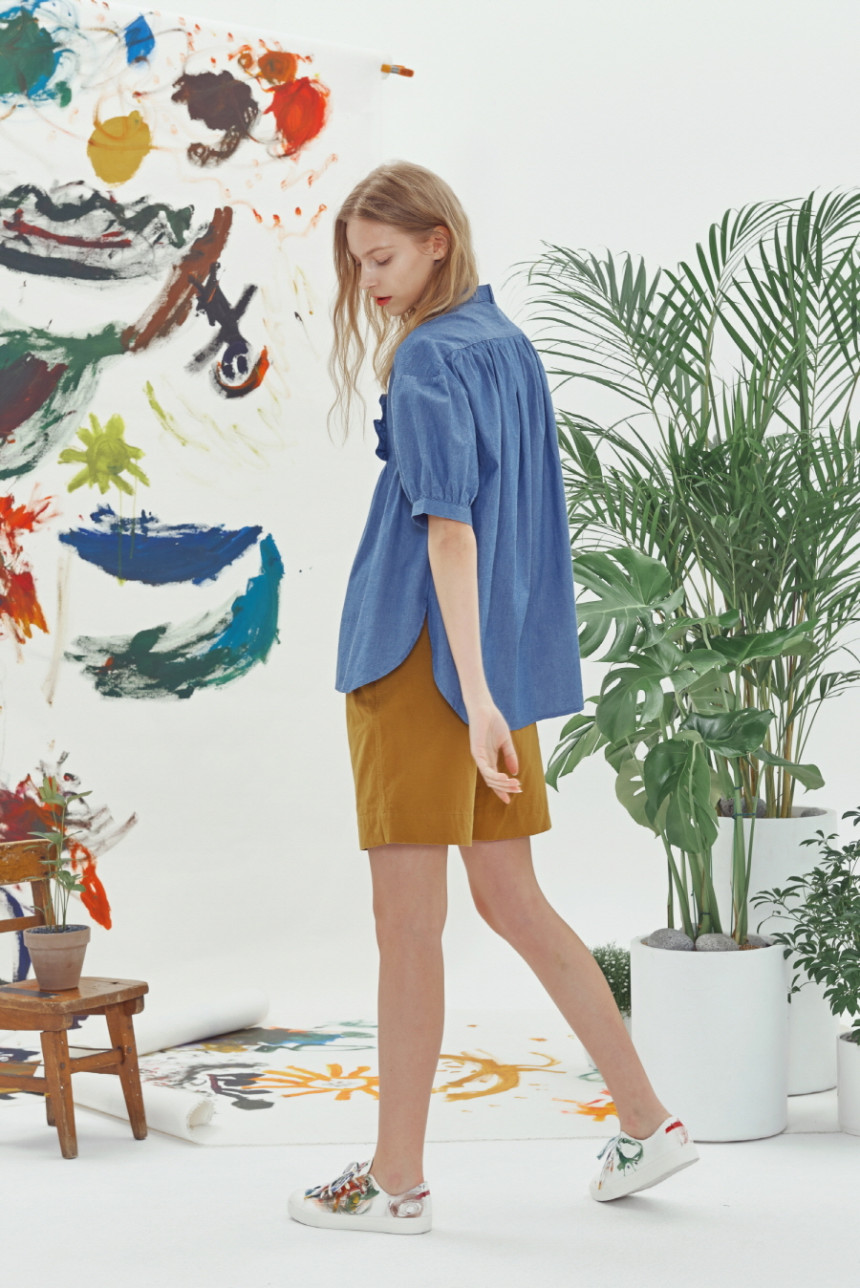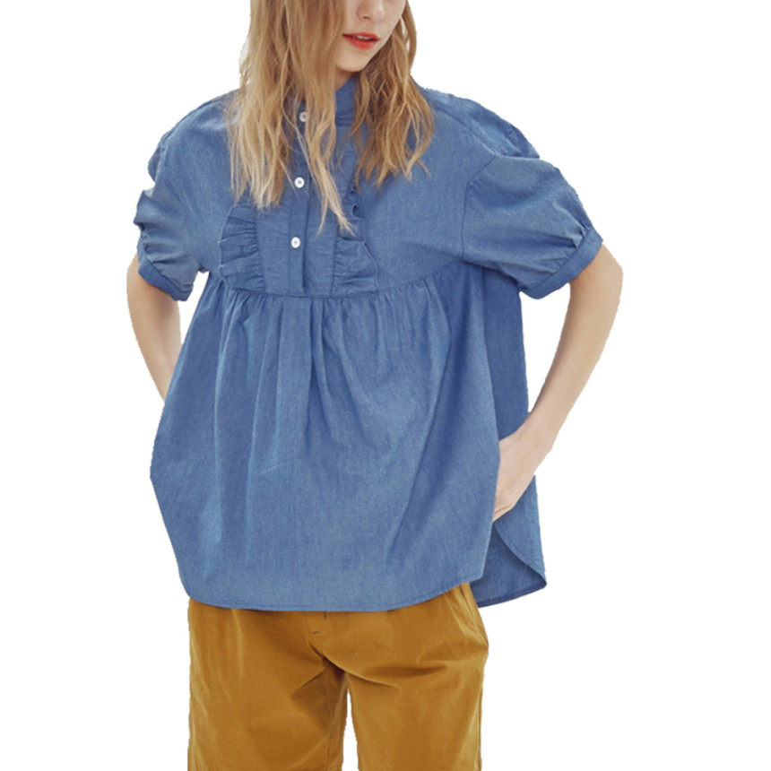 샴브레이 워시드 블루의 코튼 소재를 사용한여 제품 제작 후 워싱 단계를 다시 거친 제품이어서 빈티지한 자연스러운 주름의 미가 느껴집니다. 천연 자개 단추와 빈티지 블루컬러가 묘한 조화로움을 만들어 냅니다.
