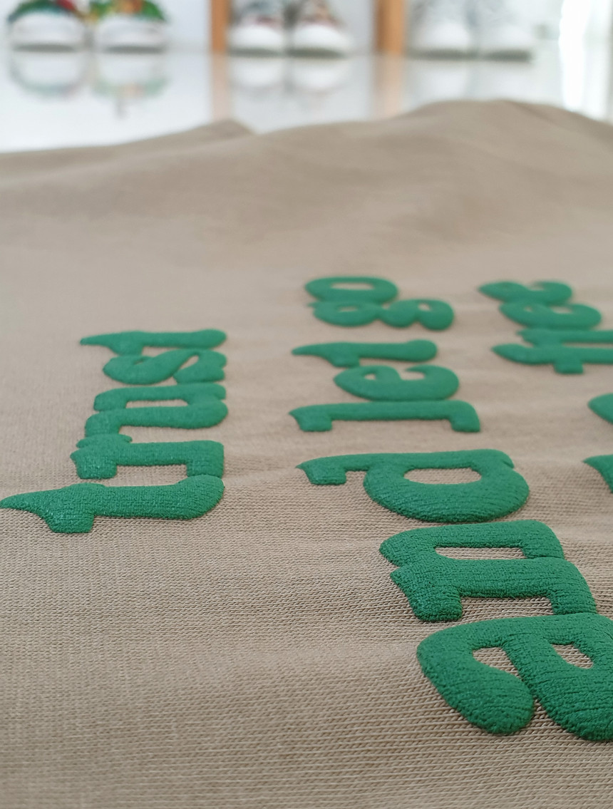 "trust and let go to be free", "자유로워지기 위해 믿고 나아가라"라는 말이 특수 발포 기법으로 프린팅되어