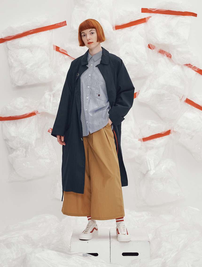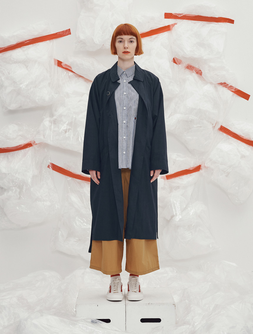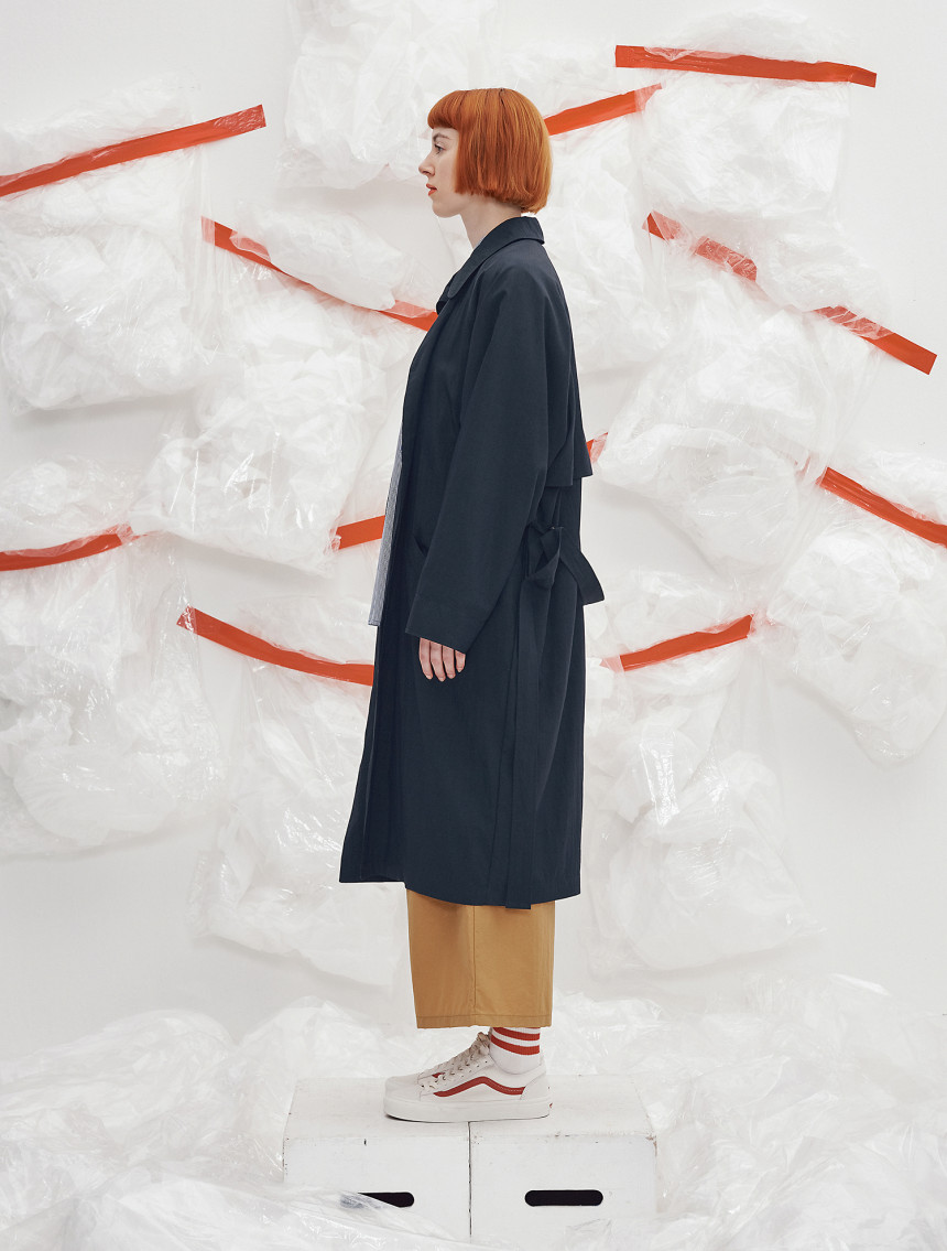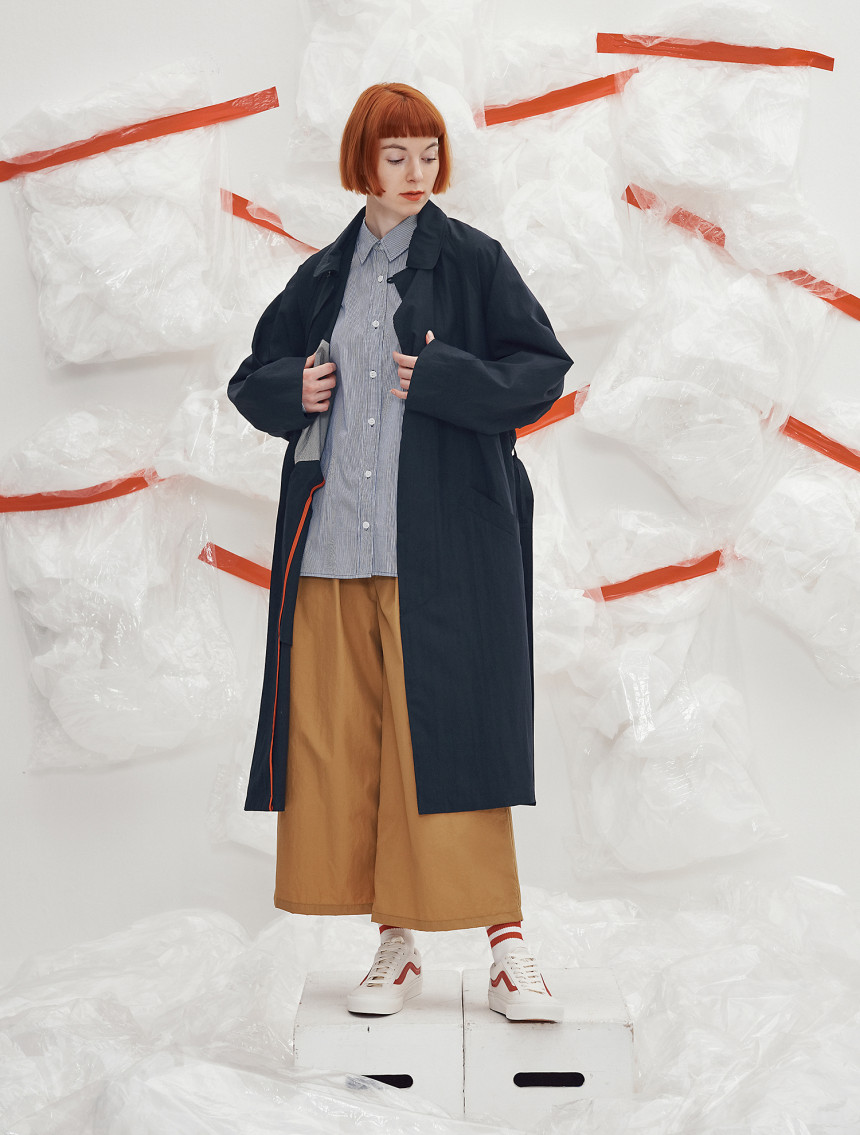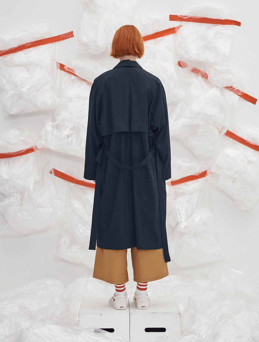 트랜치 내부 디자인인을 보면 40수 스트라이프 면 소재를 사용한 인사이드 백윙과 포켓 디자인, 은은한 광택이 있는 오렌지 폴리에스터 소재의 해리를 통한 컬러감은 코이노니아 캔버스만의 미술적인 감성을 만들어 줍니다.