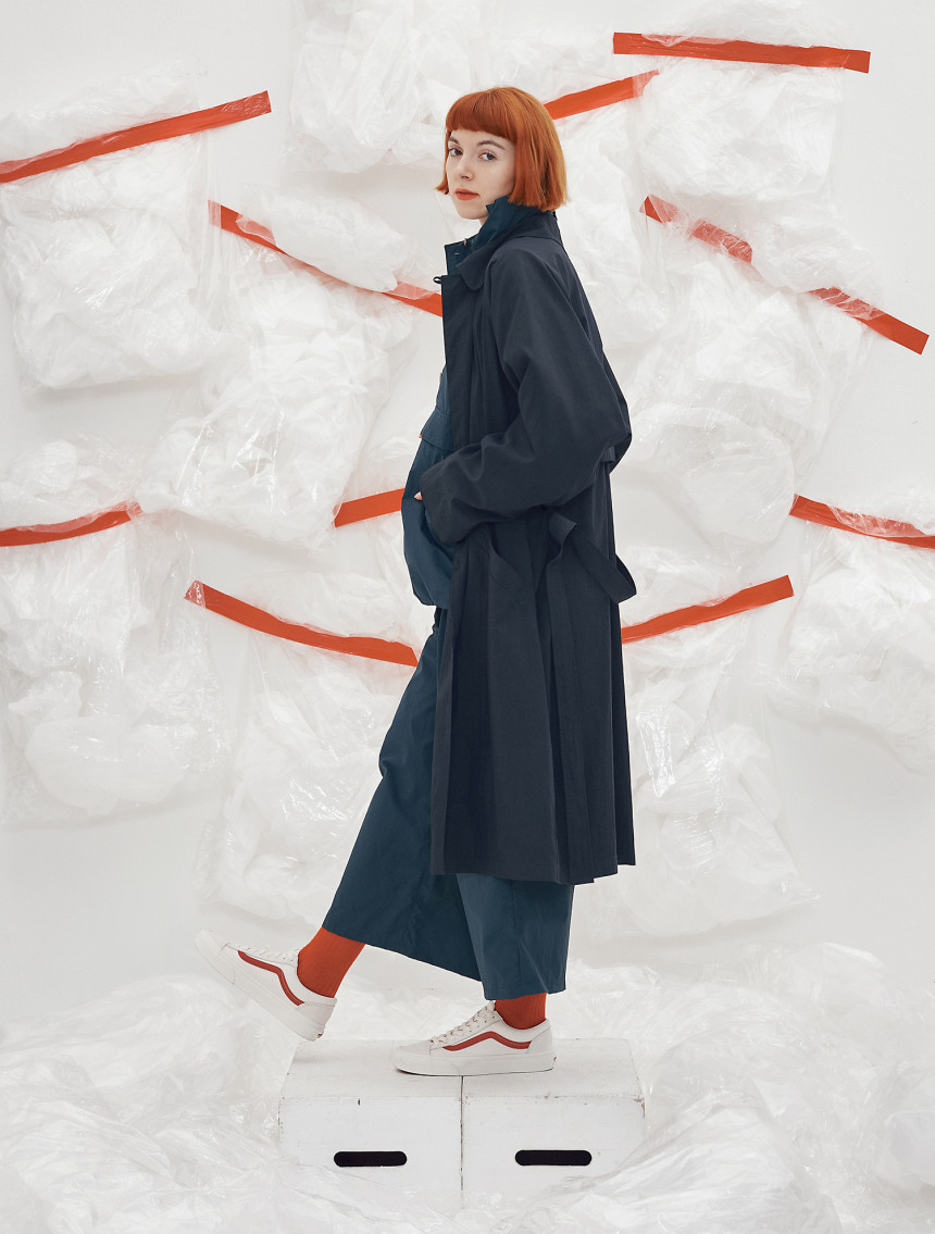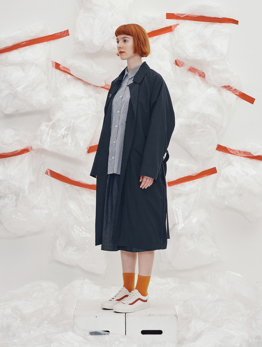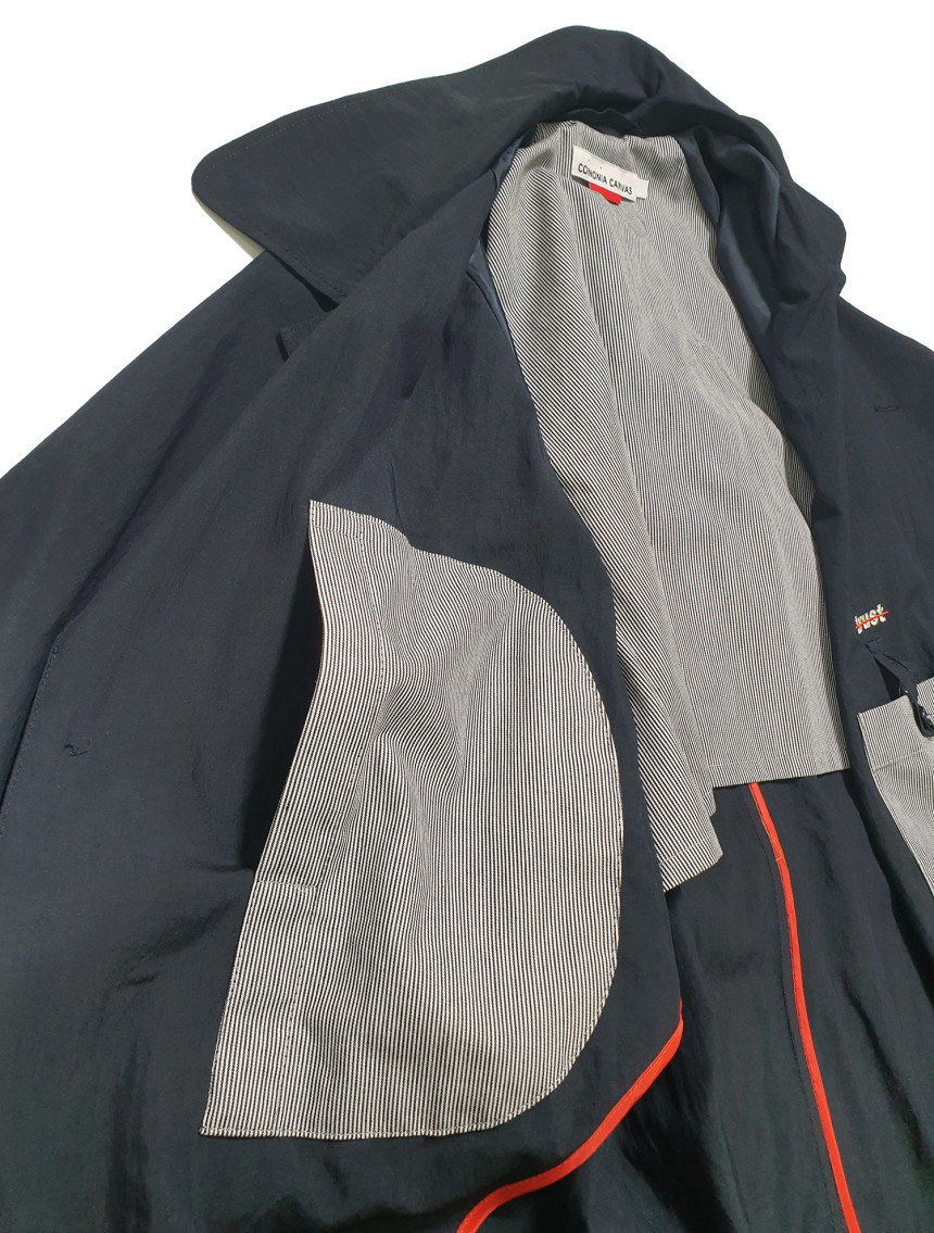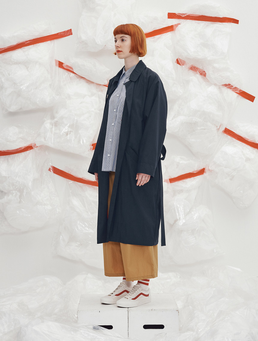 트랜치 내부 디자인인을 보면 40수 스트라이프 면 소재를 사용한 인사이드 백윙과 포켓 디자인, 은은한 광택이 있는 오렌지 폴리에스터 소재의 해리를 통한 컬러감은 코이노니아 캔버스만의 미술적인 감성을 만들어 줍니다.