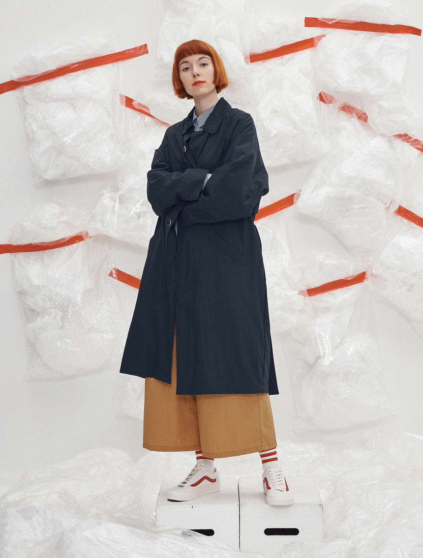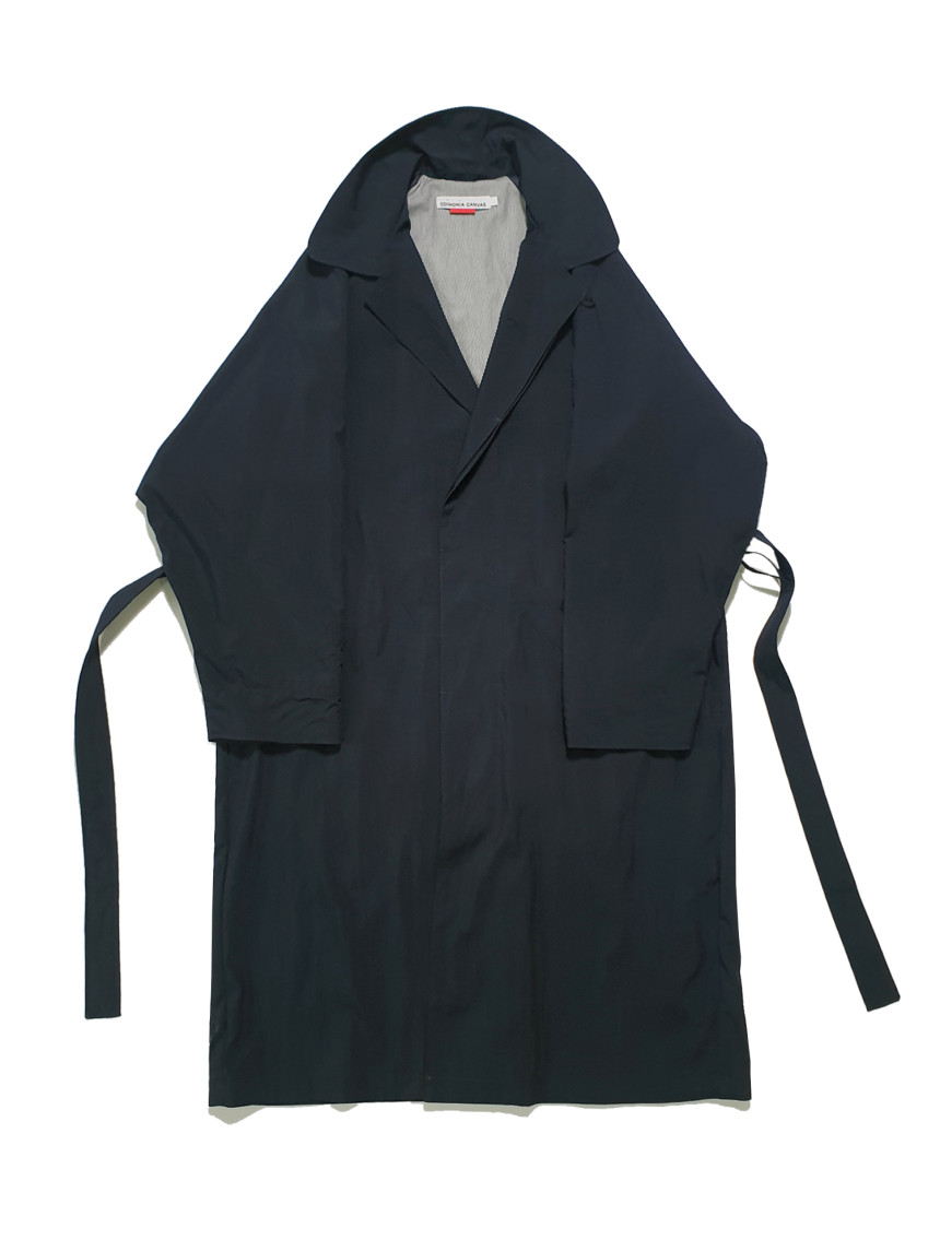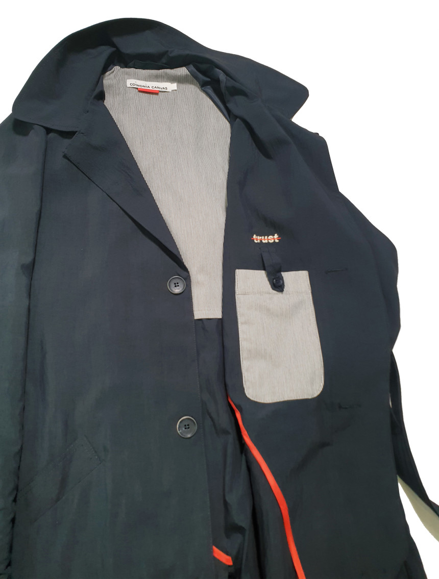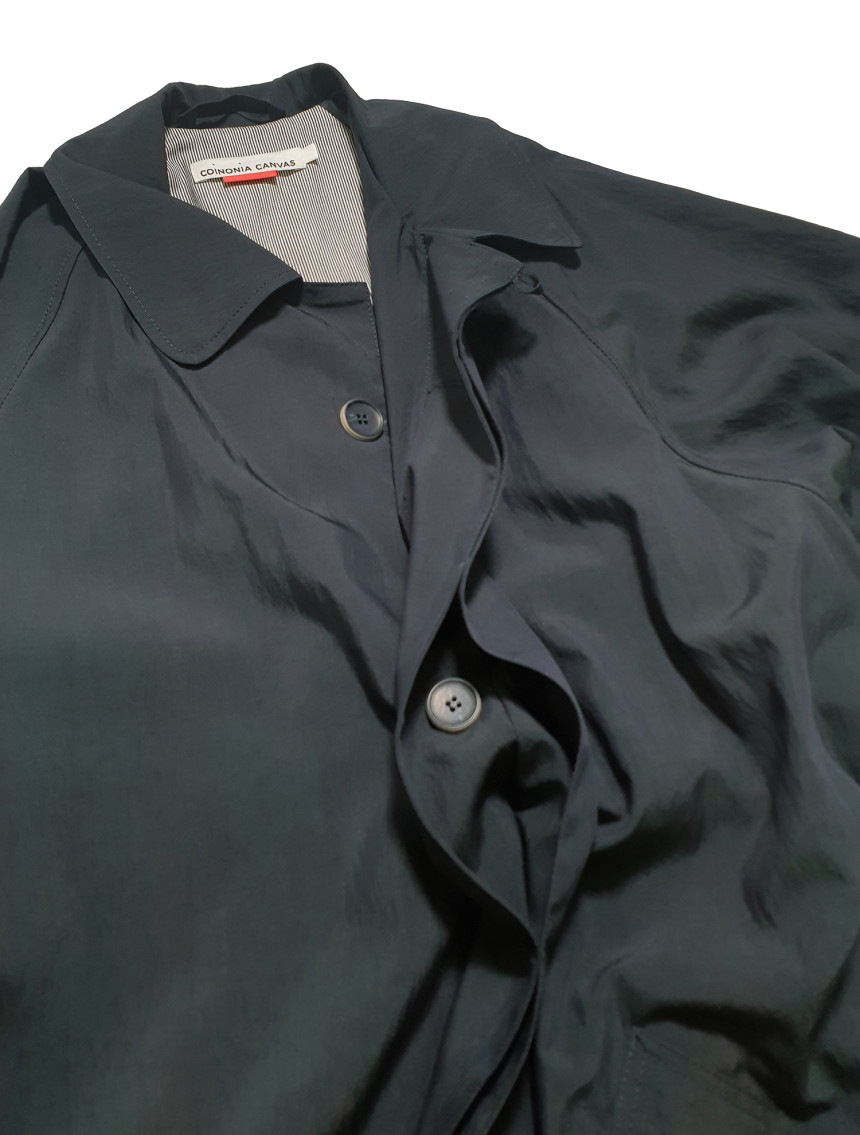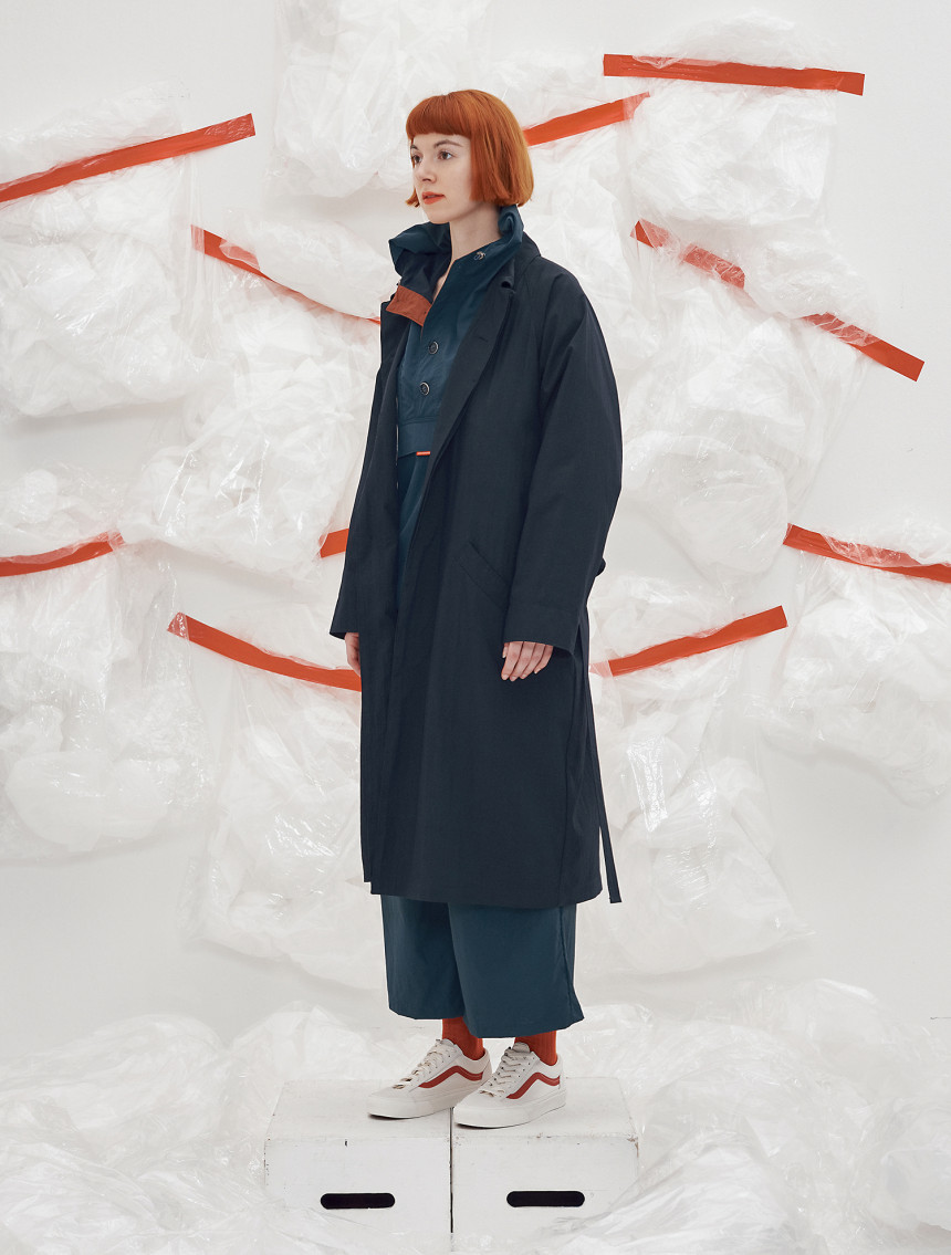 트랜치 내부 디자인인을 보면 40수 스트라이프 면 소재를 사용한 인사이드 백윙과 포켓 디자인, 은은한 광택이 있는 오렌지 폴리에스터 소재의 해리를 통한 컬러감은 코이노니아 캔버스만의 미술적인 감성을 만들어 줍니다.