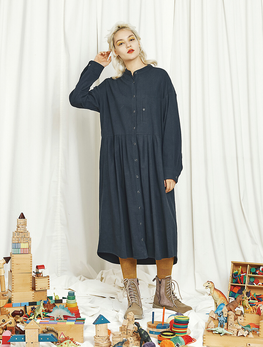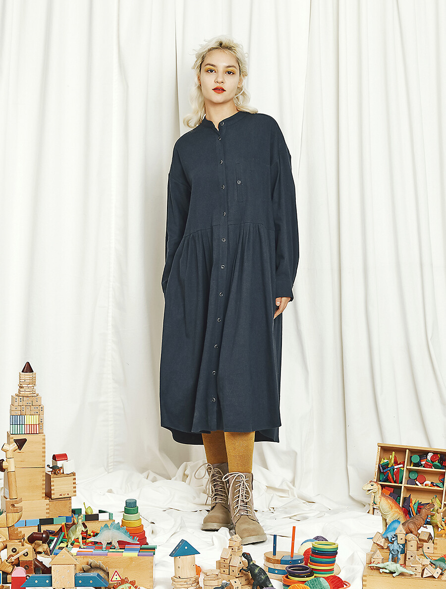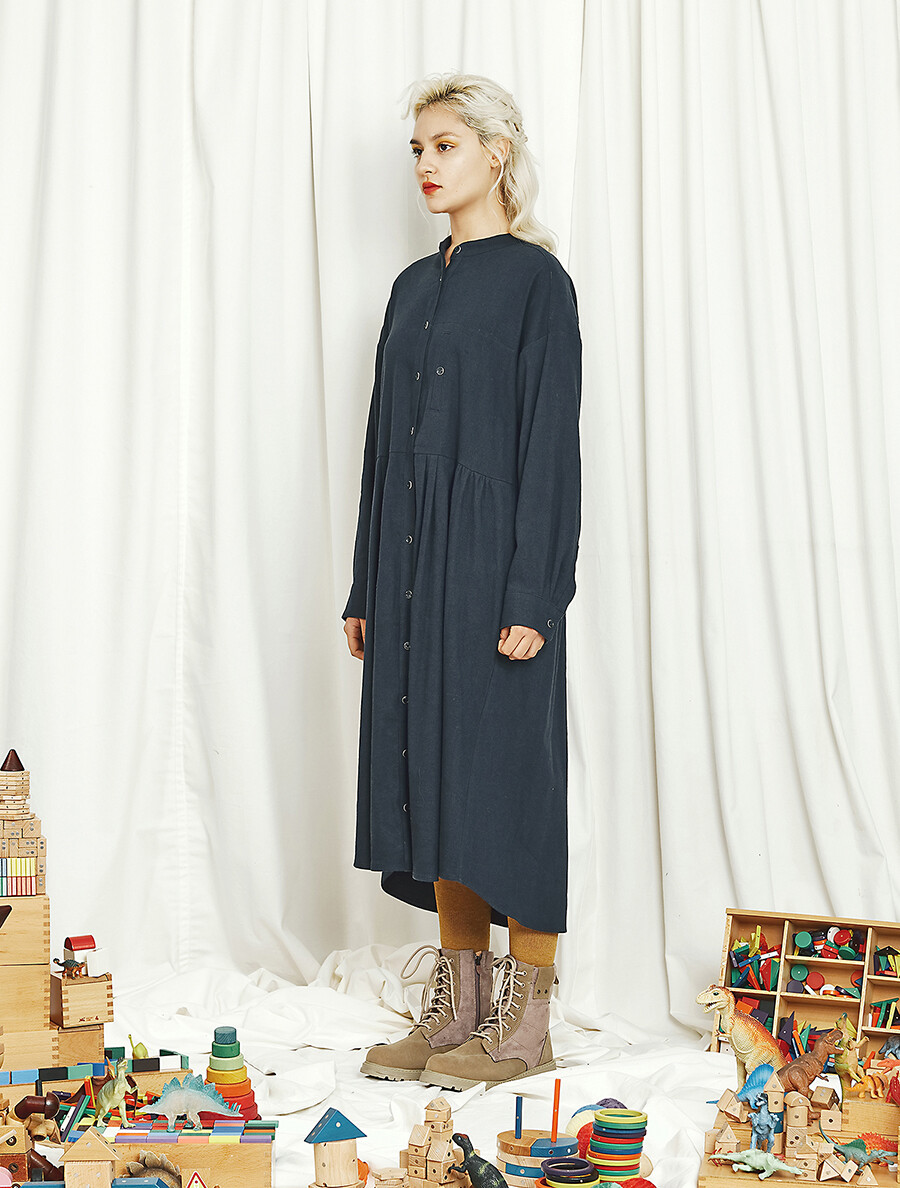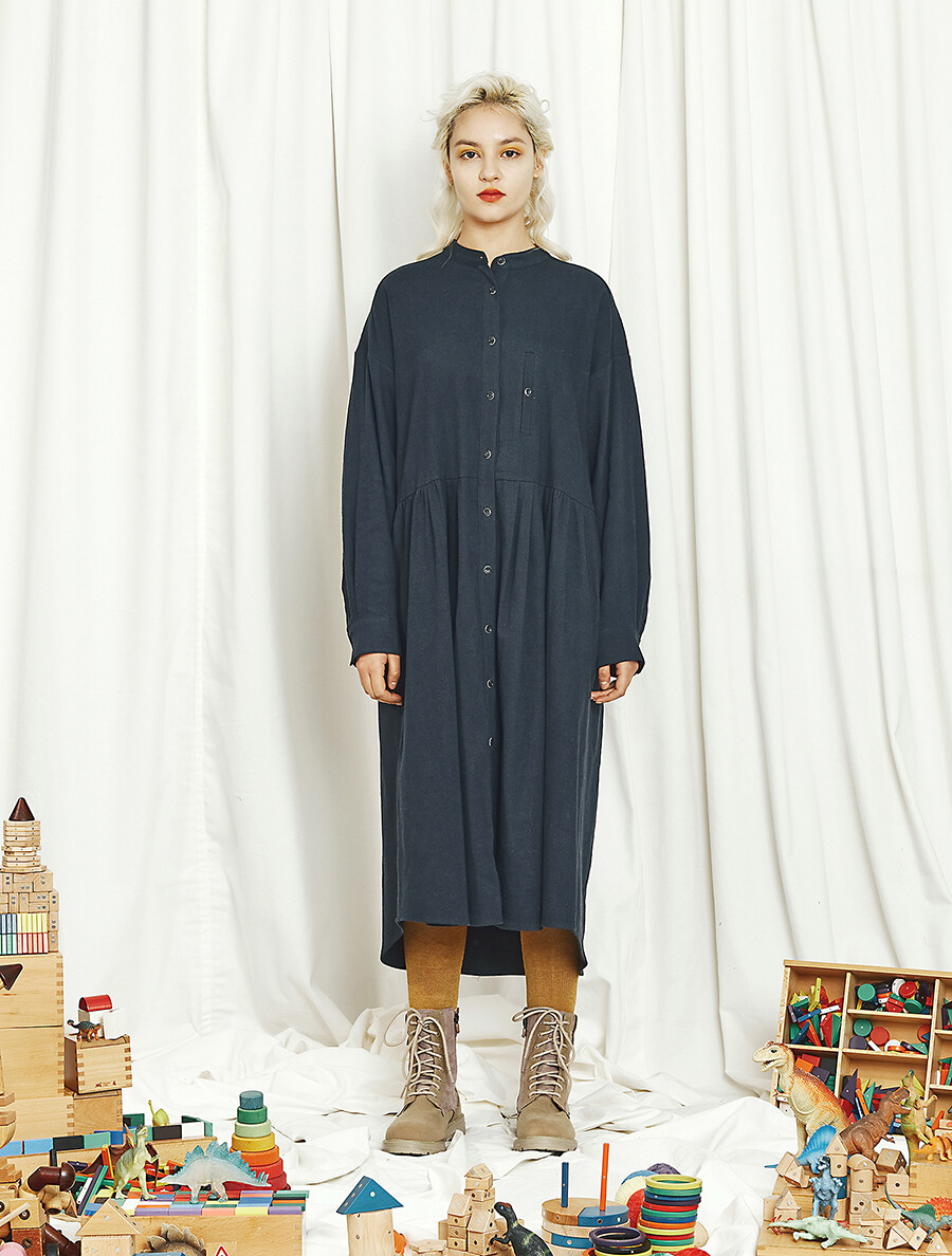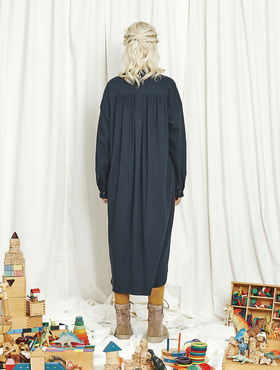 기존 코이노니아 캔버스의 필드트립 드레스가 모두 풀오버 스타일이었다면 이번 디자인은 버튼으로 드레스 전체를 오픈할 수 있는 셔츠드레스와 아웃 코트 개념을 살짝 가져온 필드트립 드레스입니다.