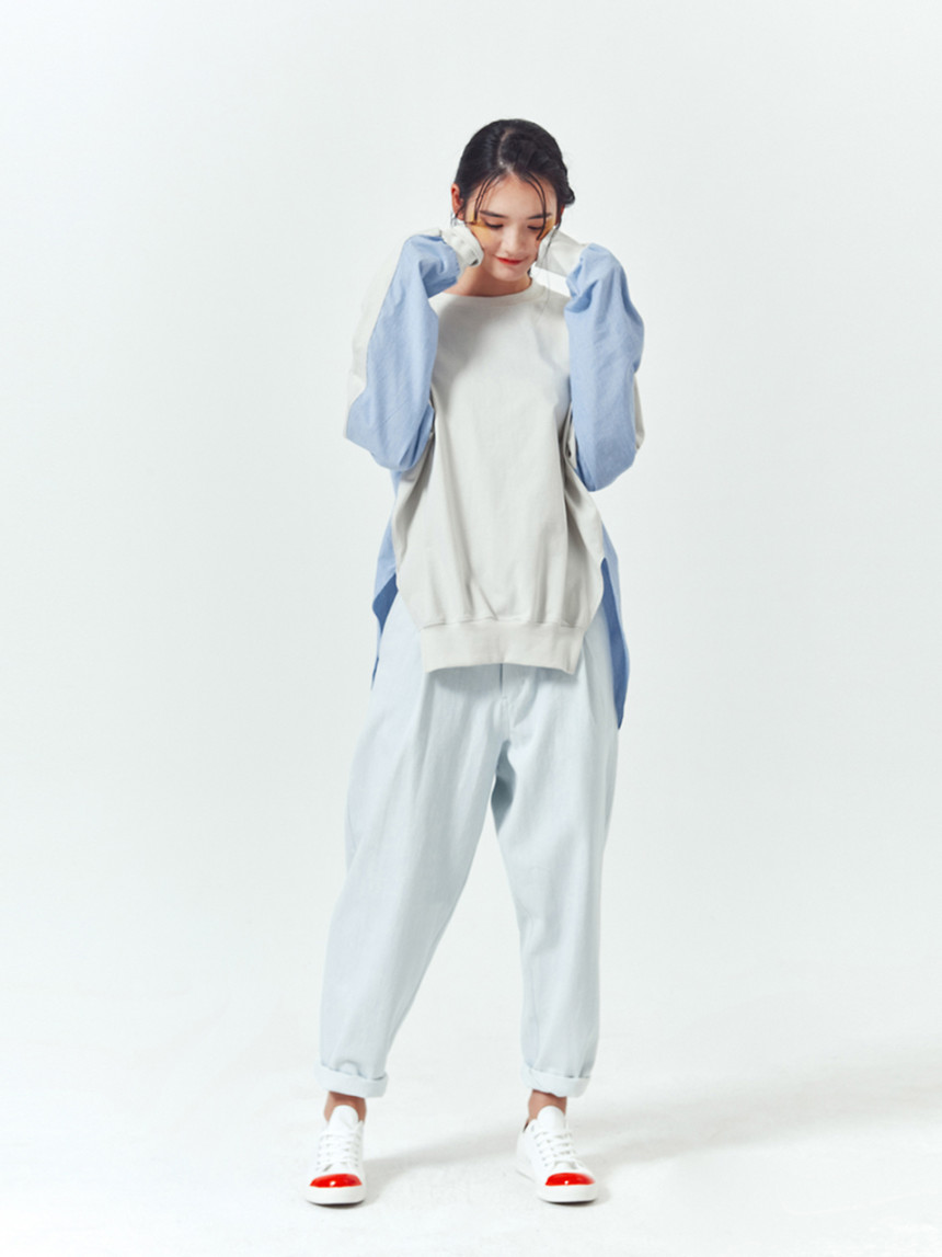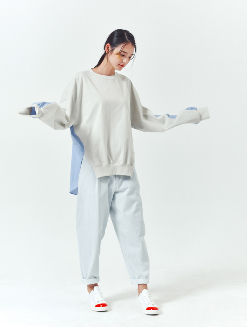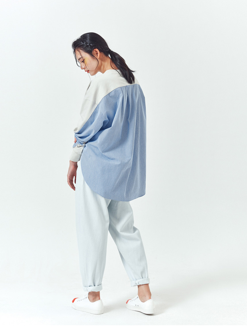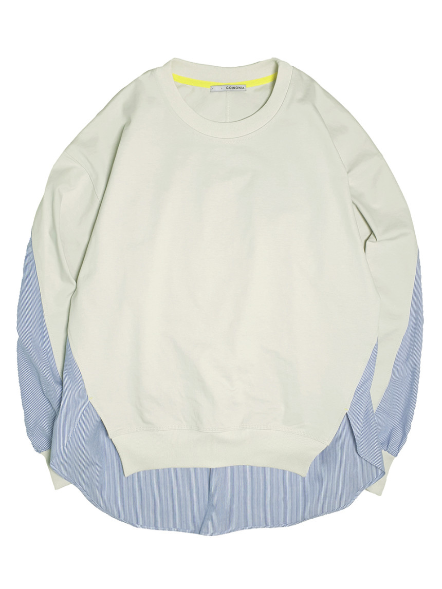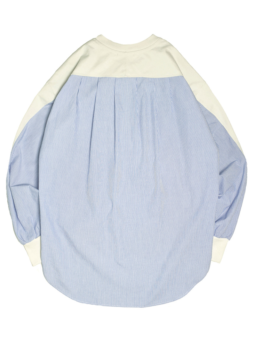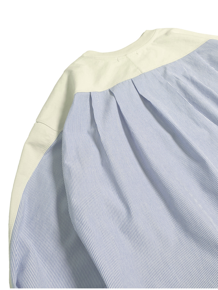 니트와 스트라이프 우븐원단을 혼합하여 만든 T+SHIRTS입니다. 앞쪽은 스웨트 셔츠 디자인이고 뒤쪽은 셔츠 디자인을 가진 두 얼굴의 '티' 플러스 '셔츠'입니다. 위크데이와 위크엔드 모두 편하게 착용하실 수 있는 타임리스 아이템입니다.