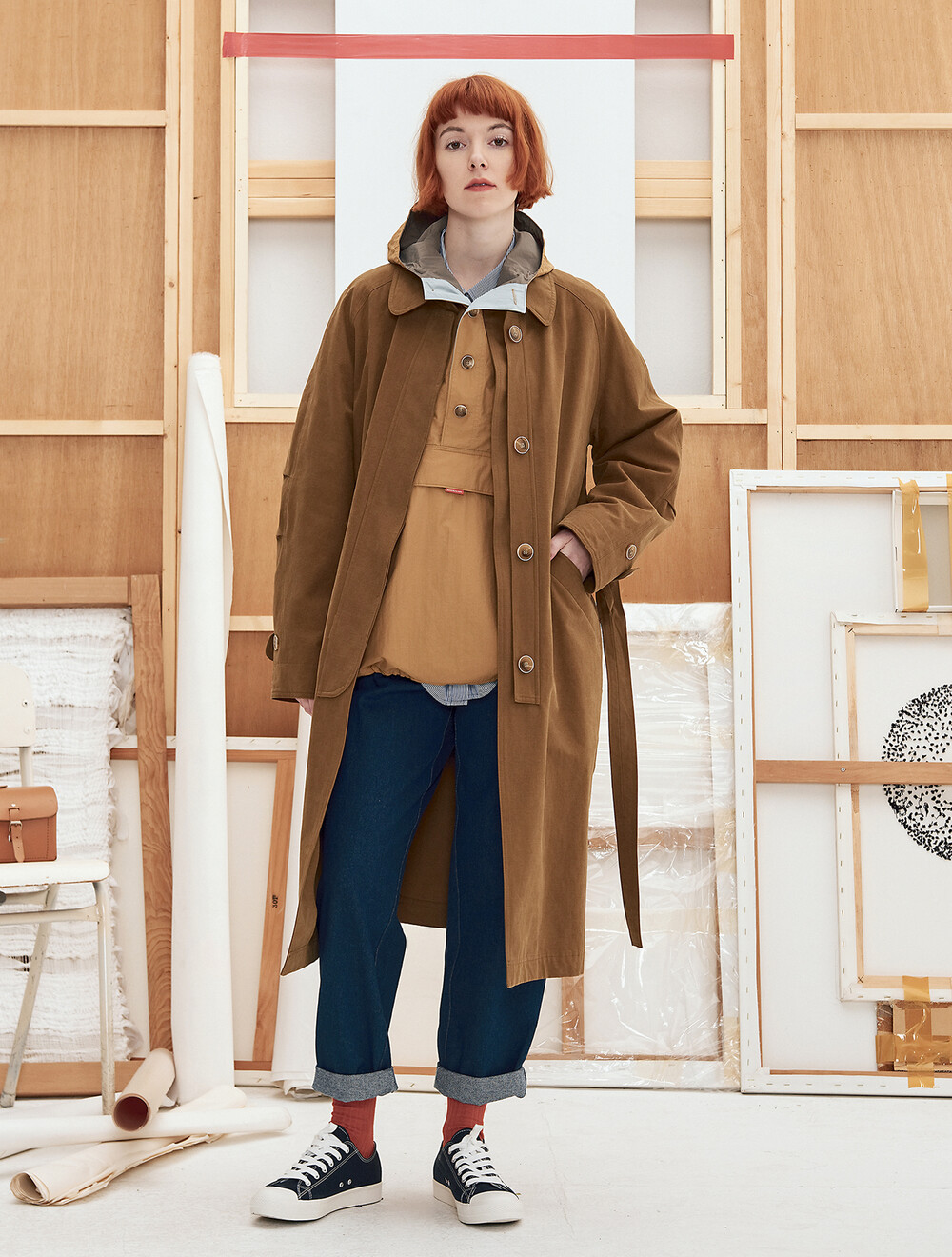 Urban anorak-Powder camel + Oversized daily shirt + Washed blue denim pants
