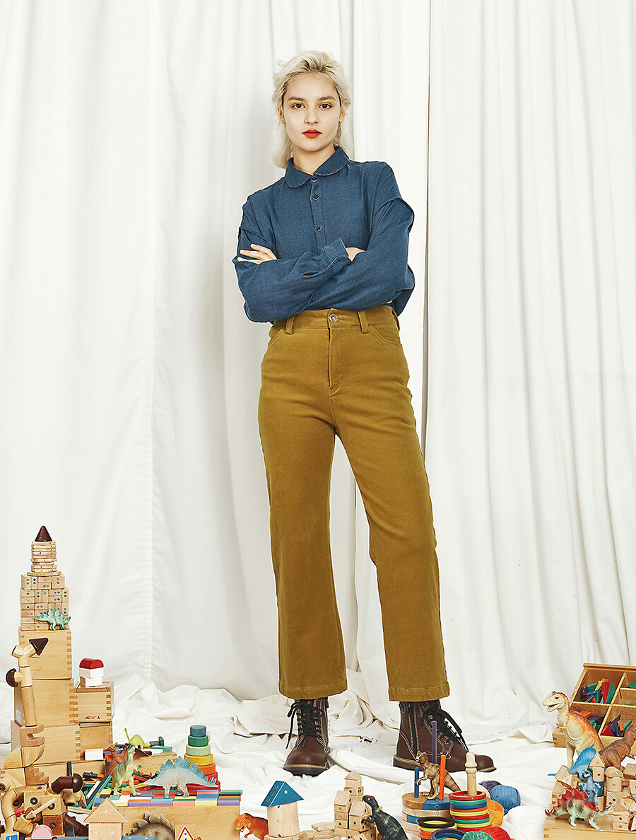 살짝 짧은 느낌의 스트레이트 핏으로 슬림 해 보이면서도 중성적인 매력을 가지고 있습니다.