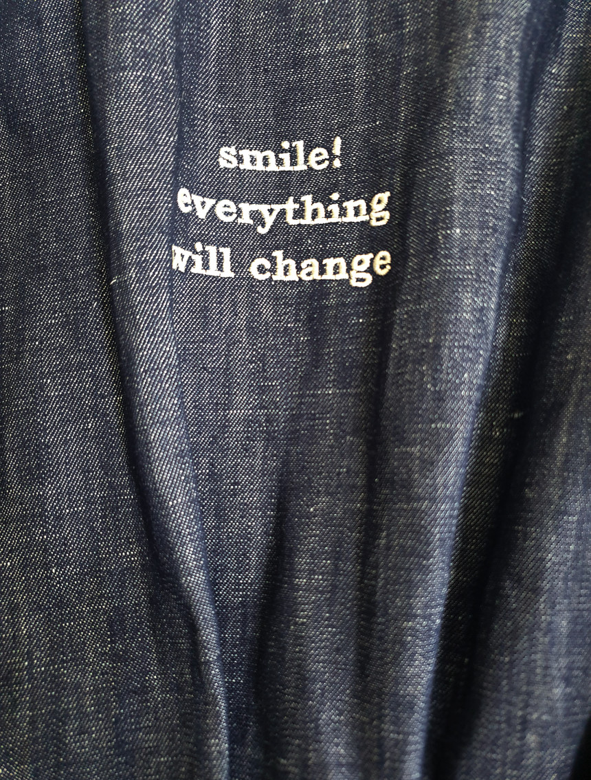 특히 앉았을 때나 걸을 때나 나의 시선의 끝자락에 들어오는 스커트 주름 사이의 문구 "Smile everything will change", "미소는 모든 걸 바꾸게 할거야"는 나를 향해 꿈과 소망을 주는 잔잔한 소리입니다.