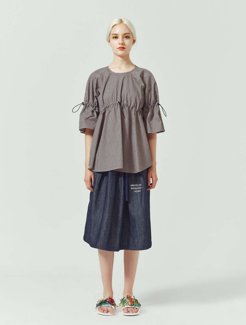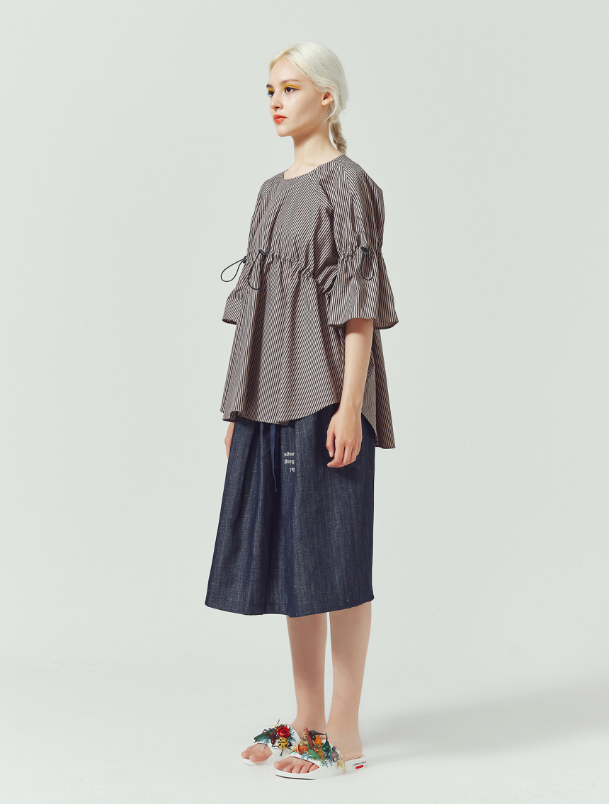 구조적이고 불규칙한 앞쪽의 접혀진 주름과 그 주름의 끝에 위치한 긴 스트링은 고감도의 독특한 디자인 감성을 만들어주고 부드러운 엘라스틱 밴드로 만들어진 뒤쪽의 주름은 편안한 착용감을 만들어 줍니다. 서로 다른 두 종류의 주름이 조화를 이룬 스커트입니다.