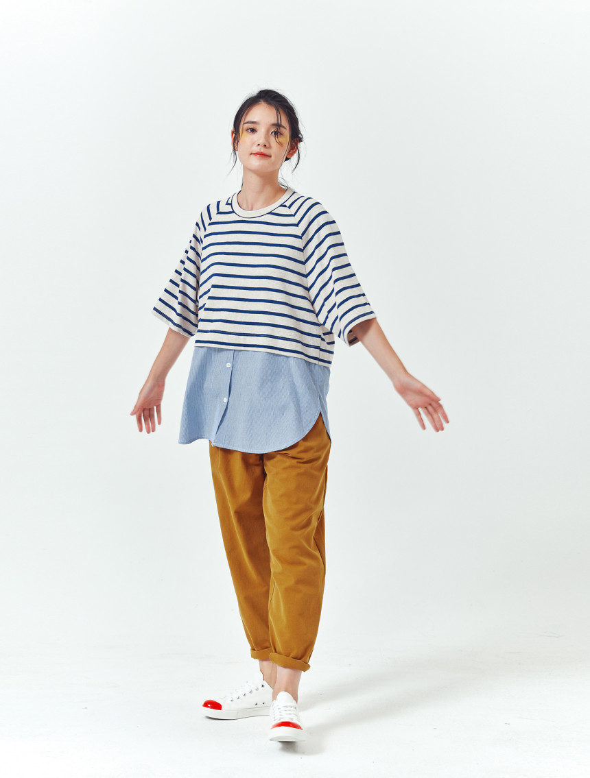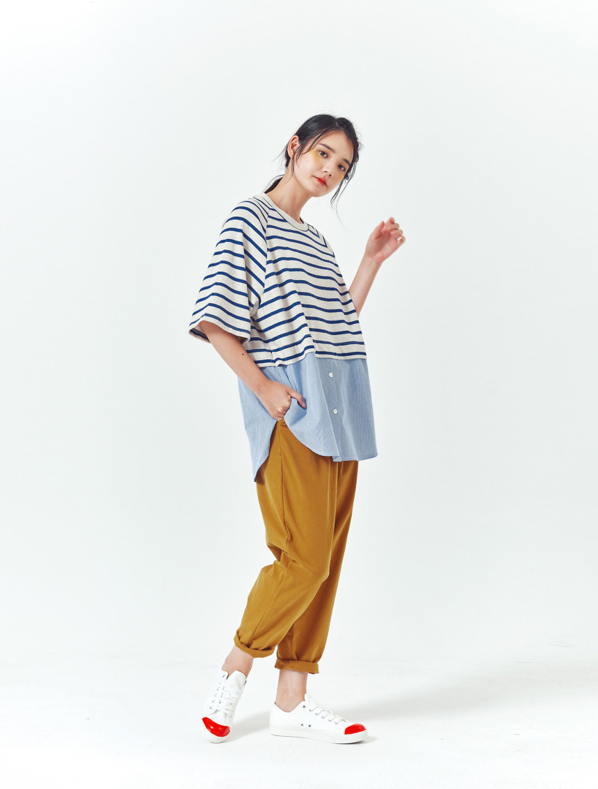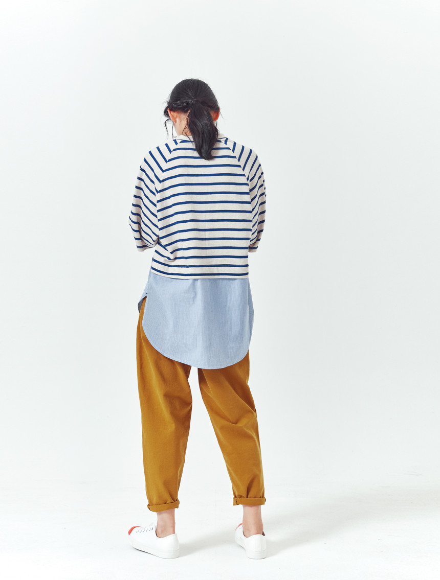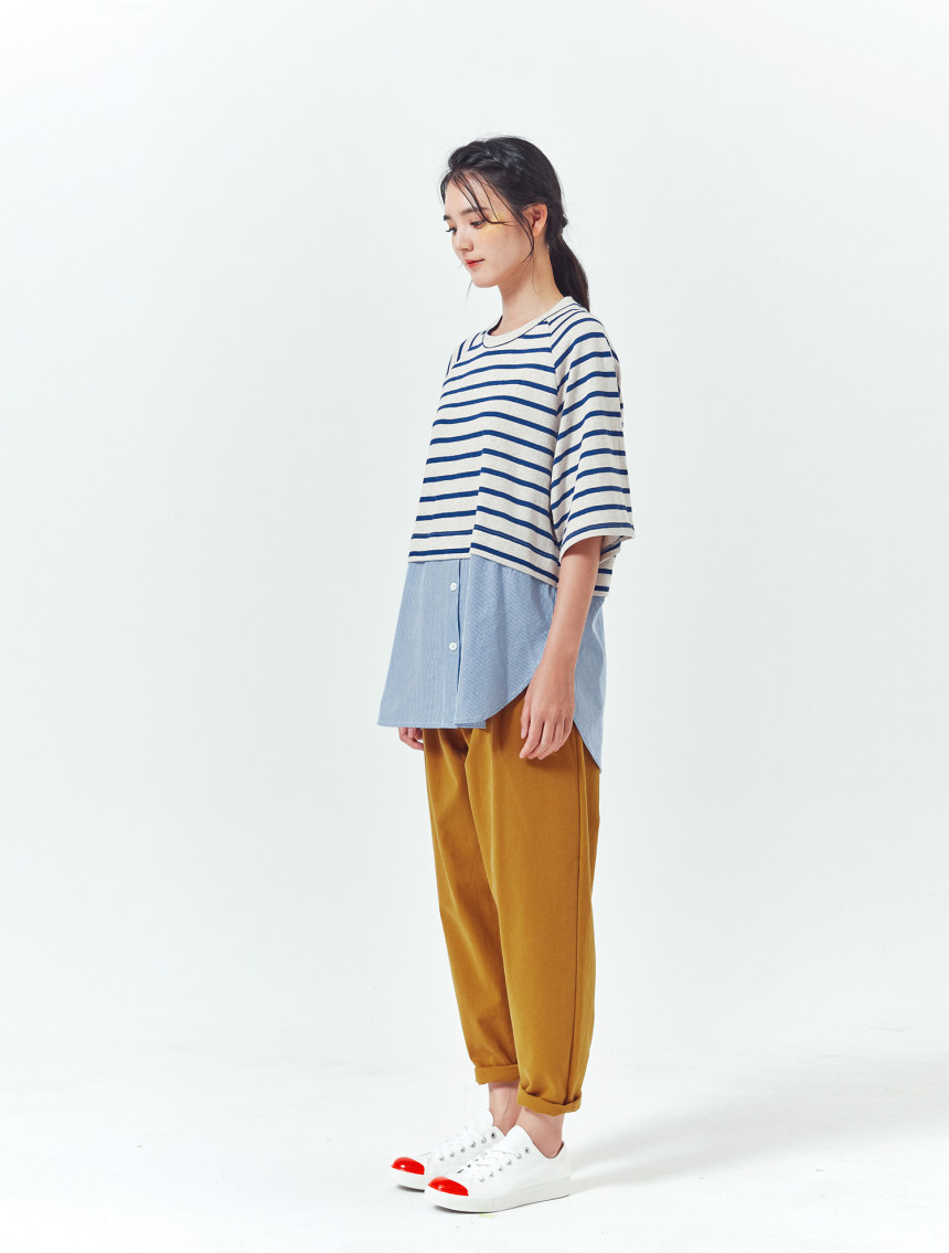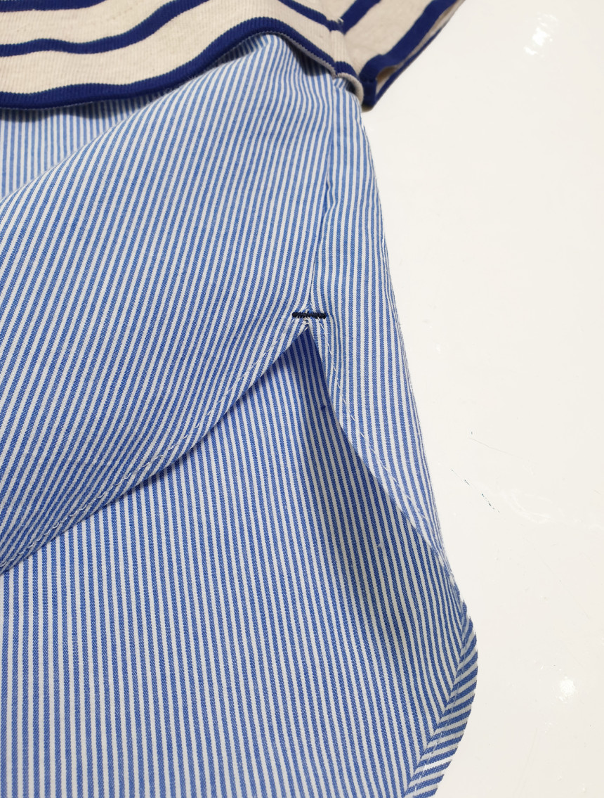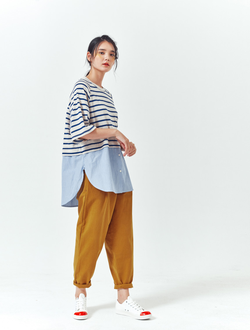티셔츠와 버튼셔츠의 연결 부분도 한번 접어 봉제되어서 밋밋하지 않고 마치 레이어드룩을 입은 느낌을 줍니다.