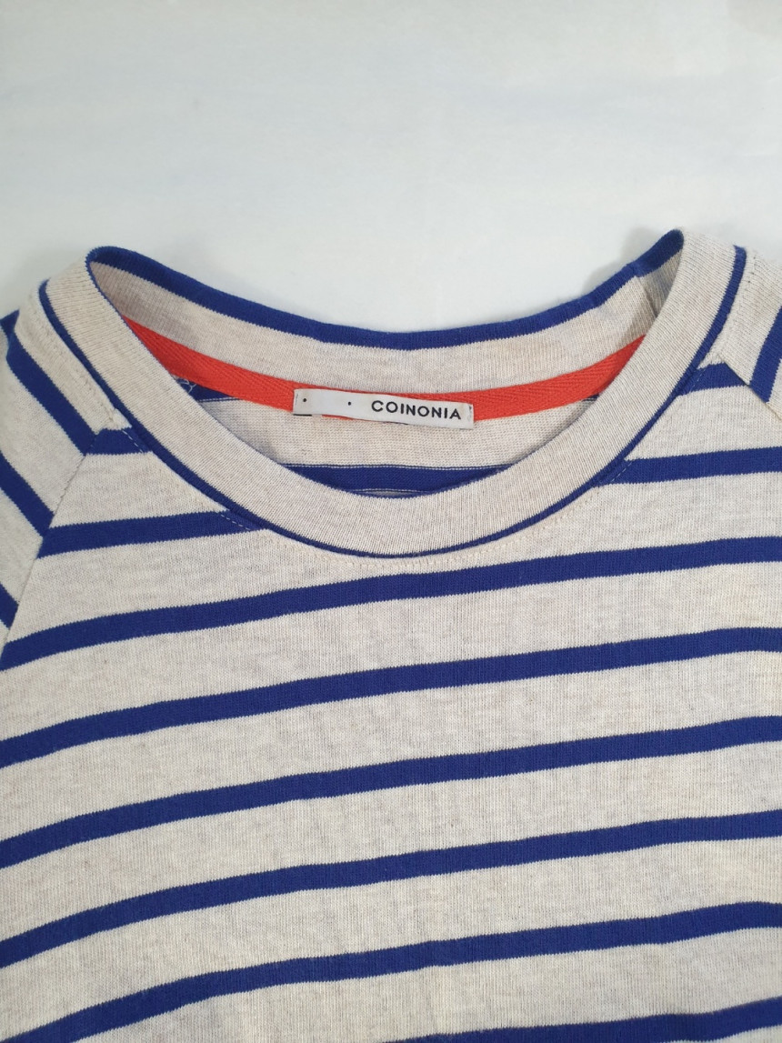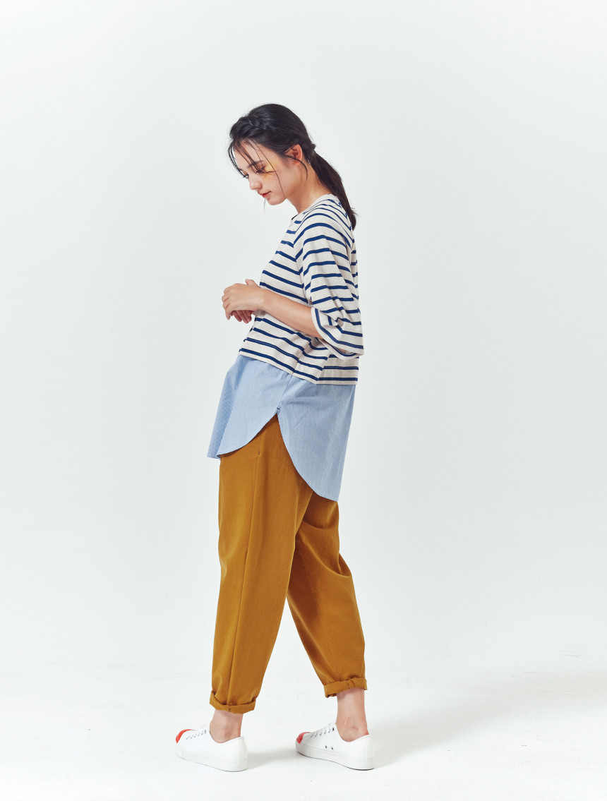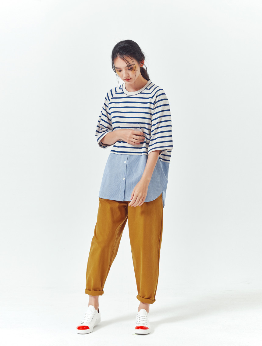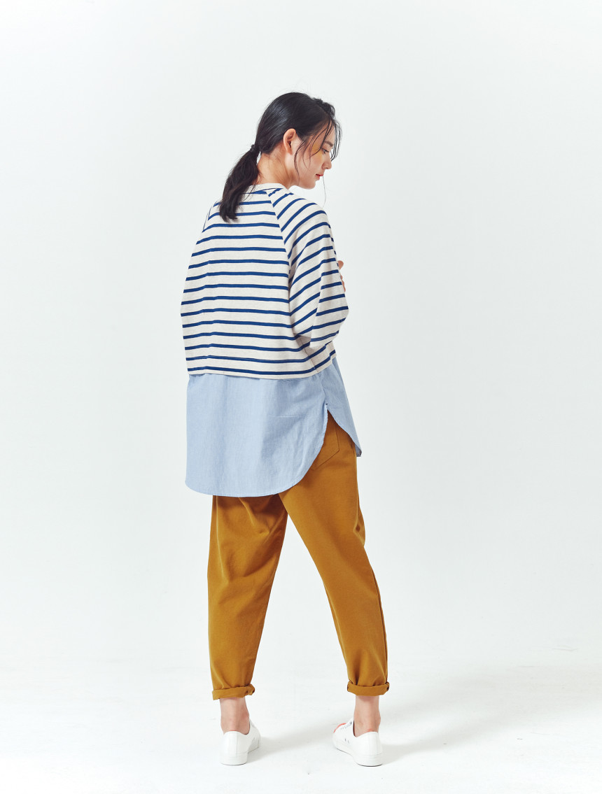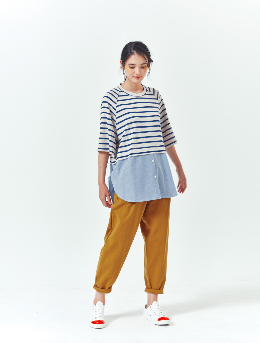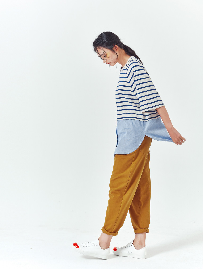 티셔츠와 버튼셔츠의 연결 부분도 한번 접어 봉제되어서 밋밋하지 않고 마치 레이어드룩을 입은 느낌을 줍니다.
