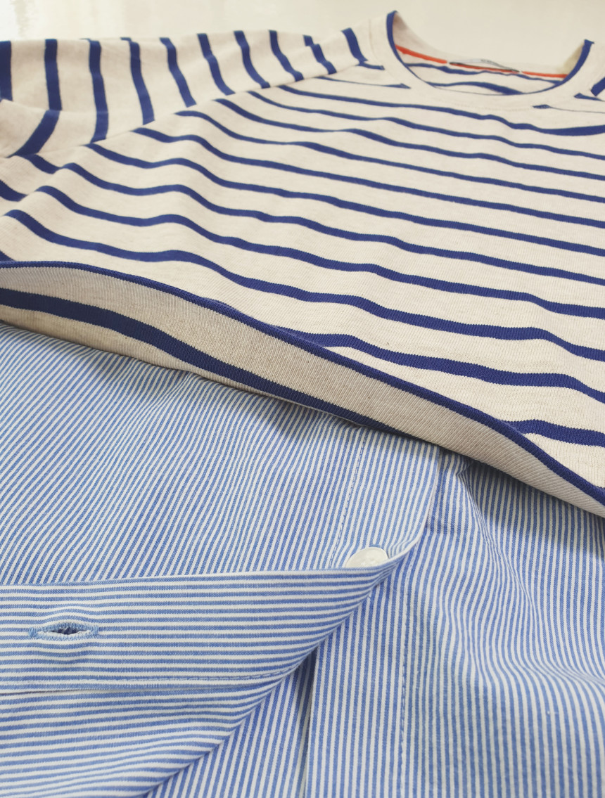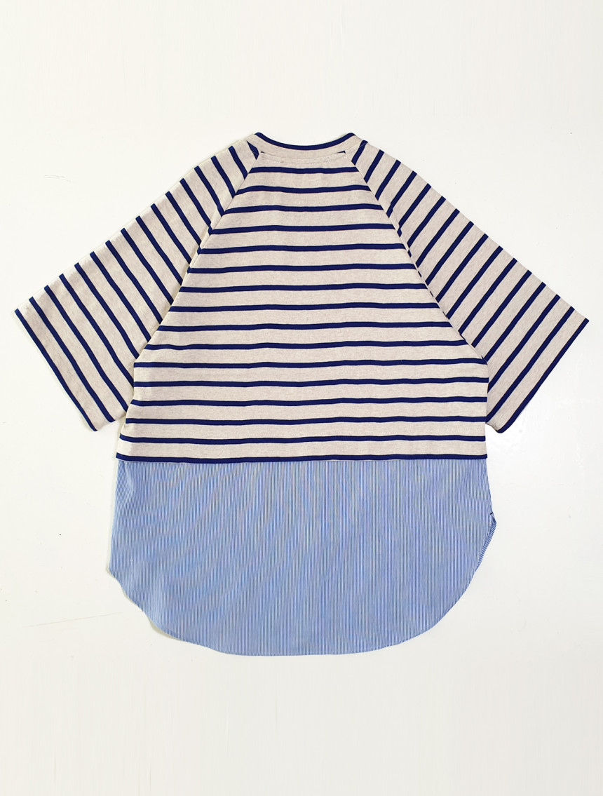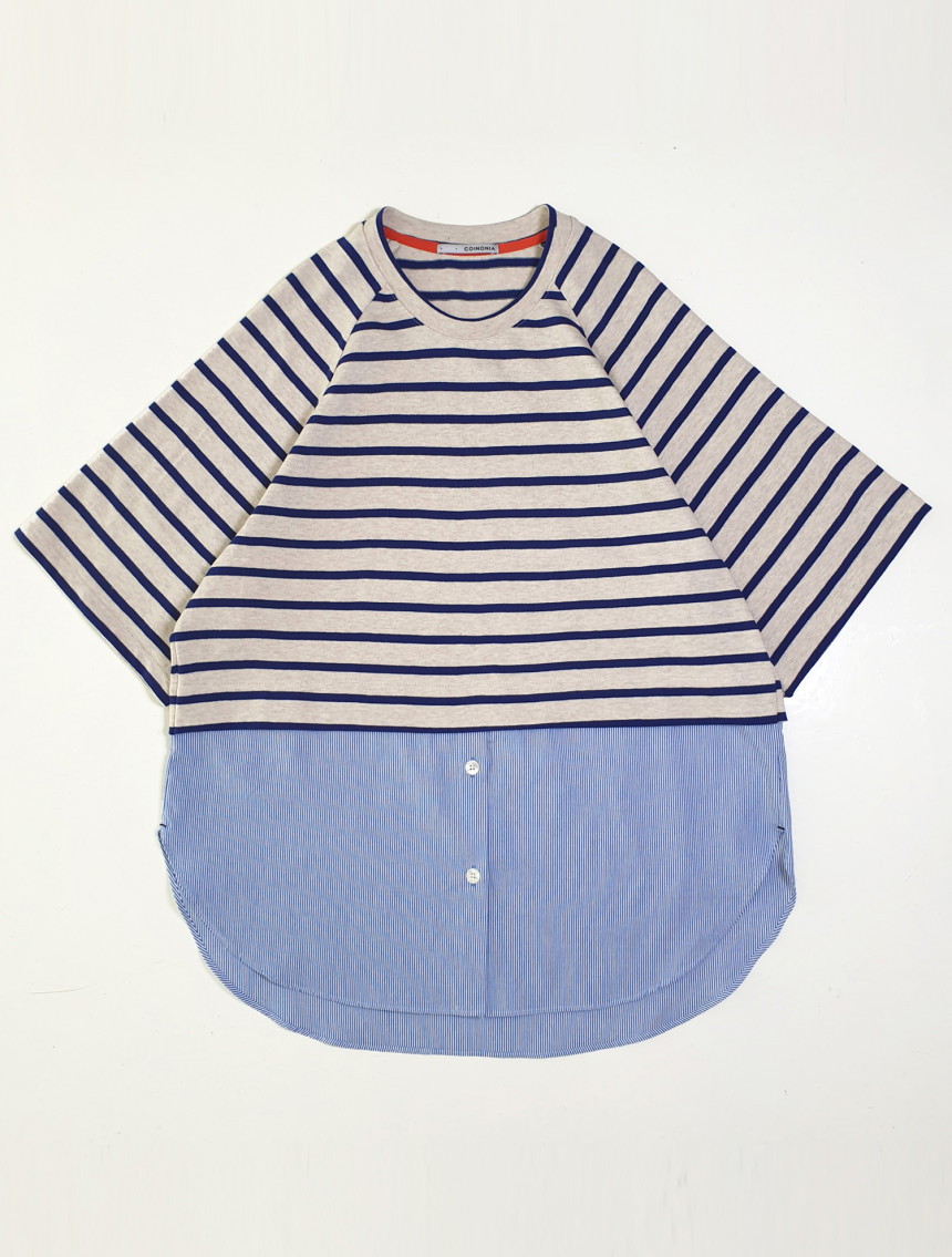 20수 코튼100% 니트 소재와 30수 선염 스트라이프 코튼으로 혼합하여 제작한 [티+버튼 셔츠]입니다.