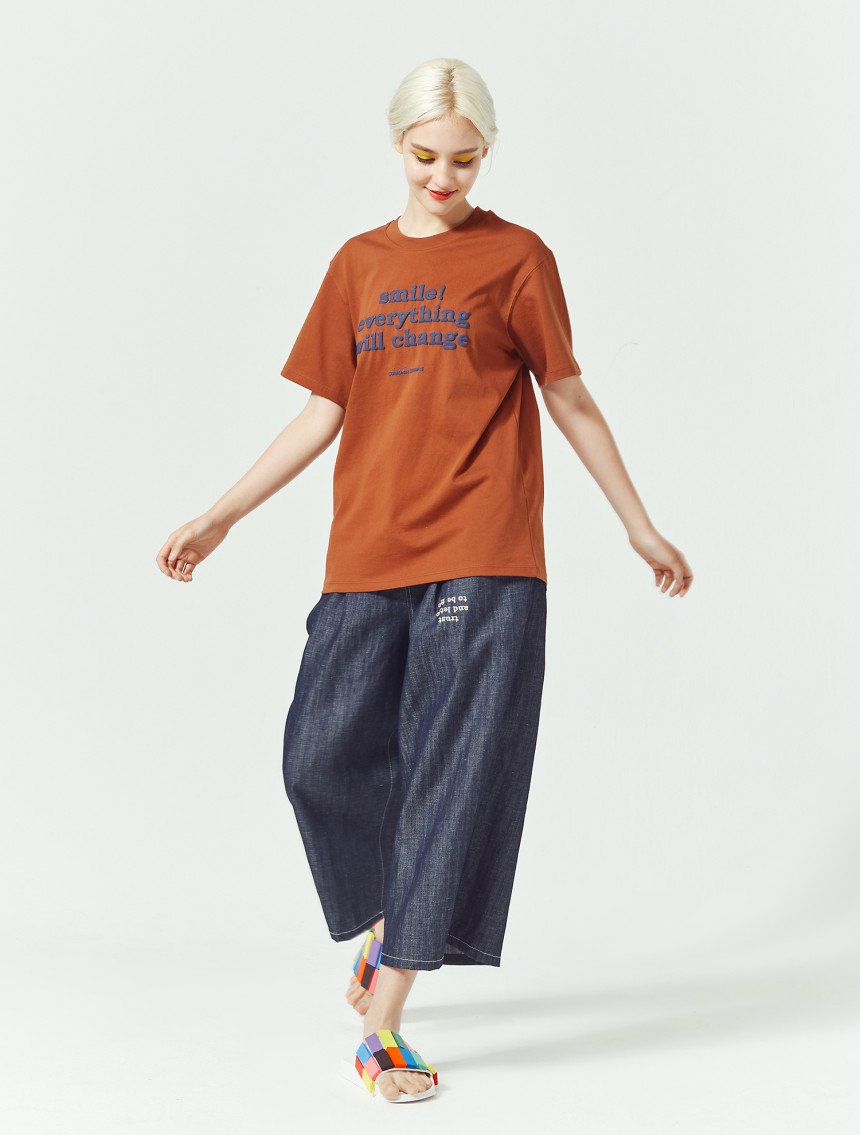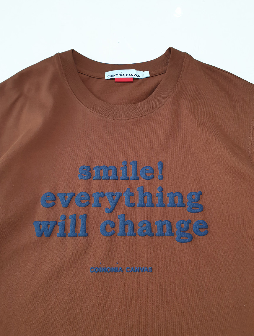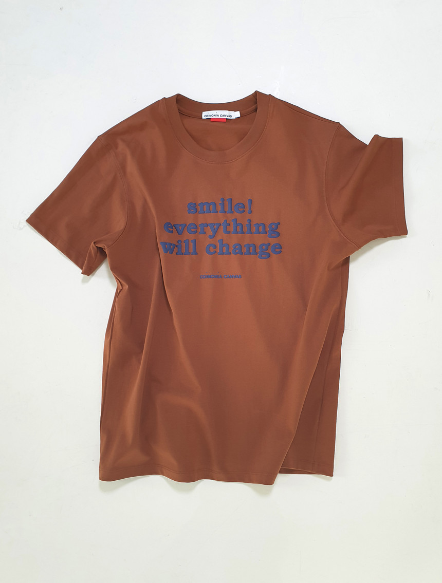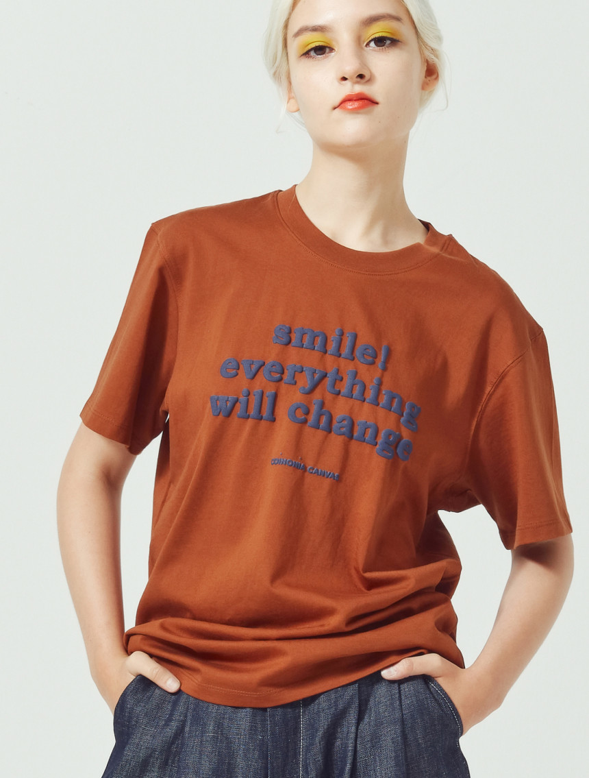 "Smile! everying will change", "미소 지어 보세요! 모든 일이 변화될 거예요"라는 긍정적인 말이 특수 발포 기법으로 프린팅되어 가볍지만 두께감 있고 견고하게 부착되어 있습니다. 스마일의 긍정적인 힘을 느낄 수 있는 티셔츠입니다. 어떤 상황 속에서도 믿고 나아가면 진정한 자유가 찾아온다라는 신뢰의 두께감을 느낄 수 있 는 티셔츠입니다.
