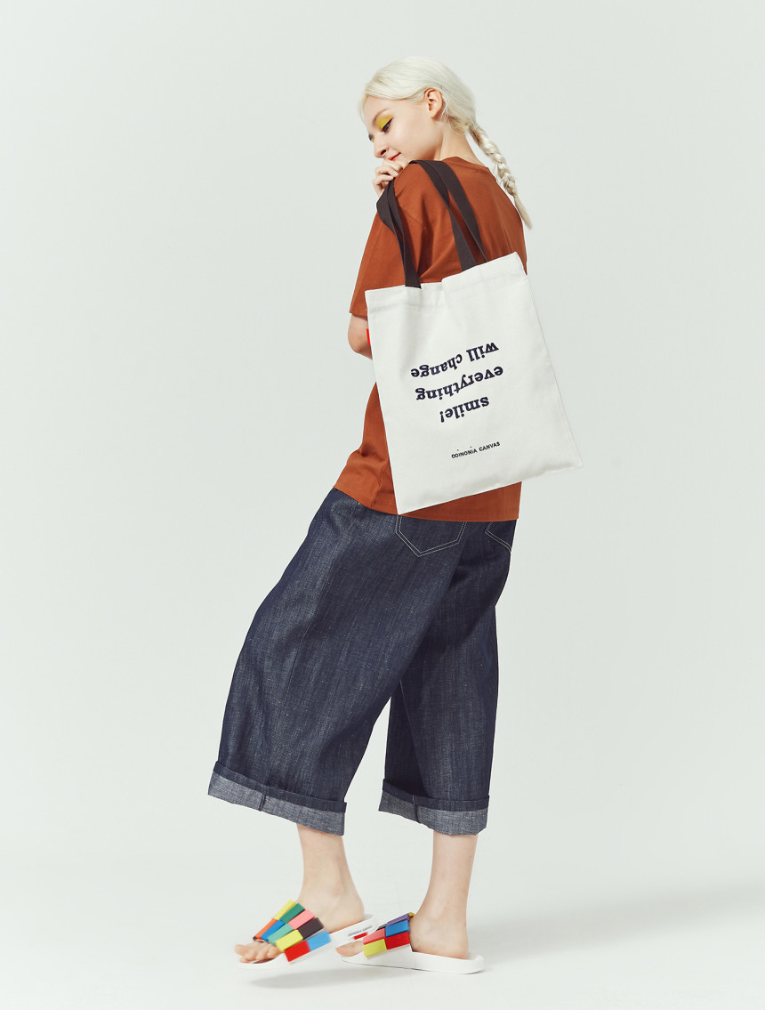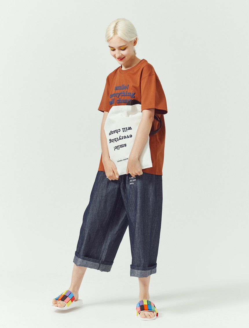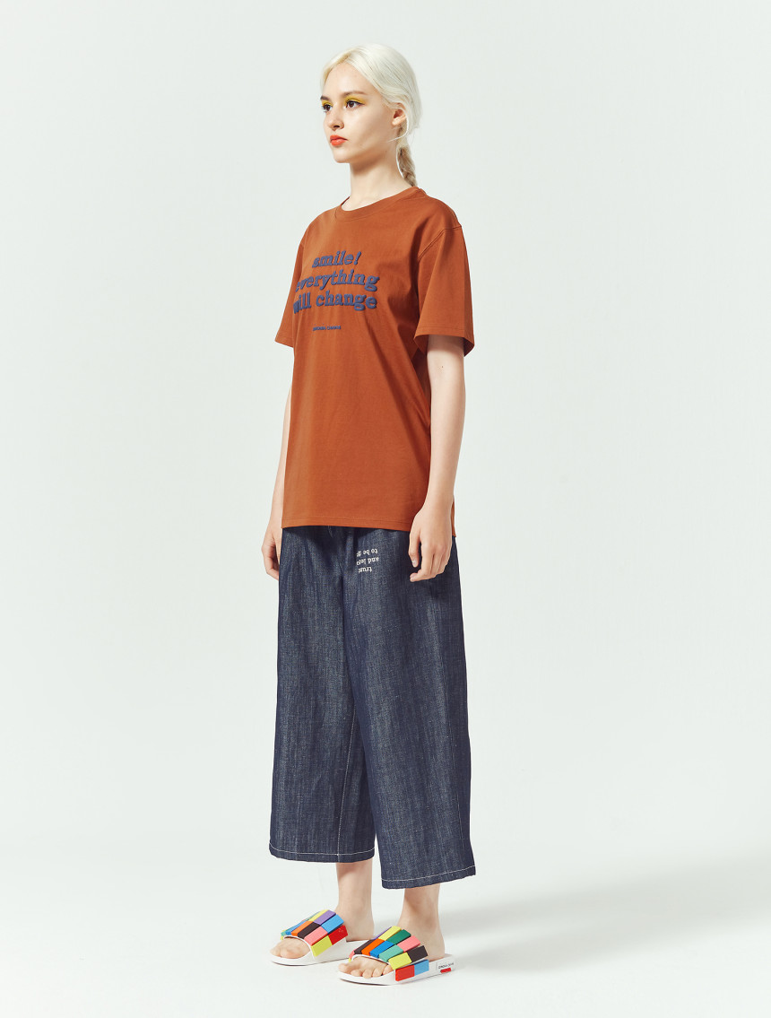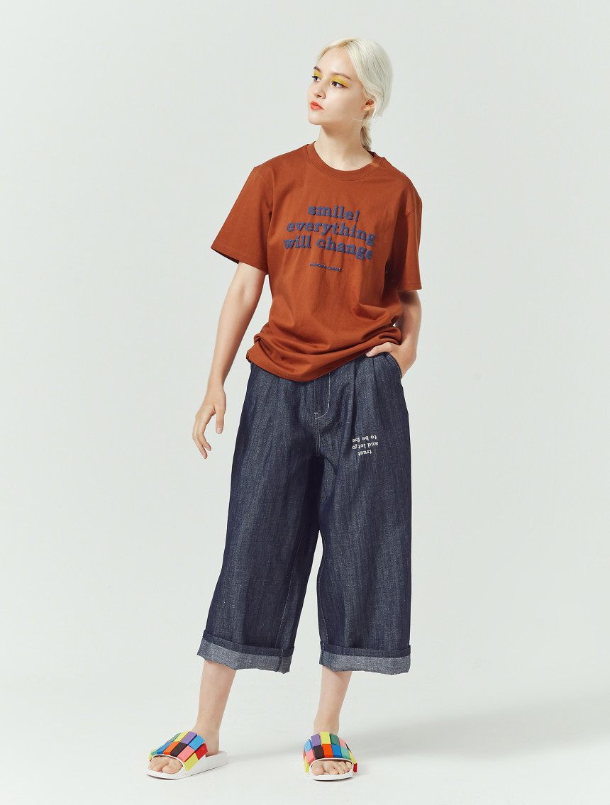 "Smile! everying will change", "미소 지어 보세요! 모든 일이 변화될 거예요"라는 긍정적인 말이 특수 발포 기법으로 프린팅되어 가볍지만 두께감 있고 견고하게 부착되어 있습니다. 스마일의 긍정적인 힘을 느낄 수 있는 티셔츠입니다. 어떤 상황 속에서도 믿고 나아가면 진정한 자유가 찾아온다라는 신뢰의 두께감을 느낄 수 있 는 티셔츠입니다.