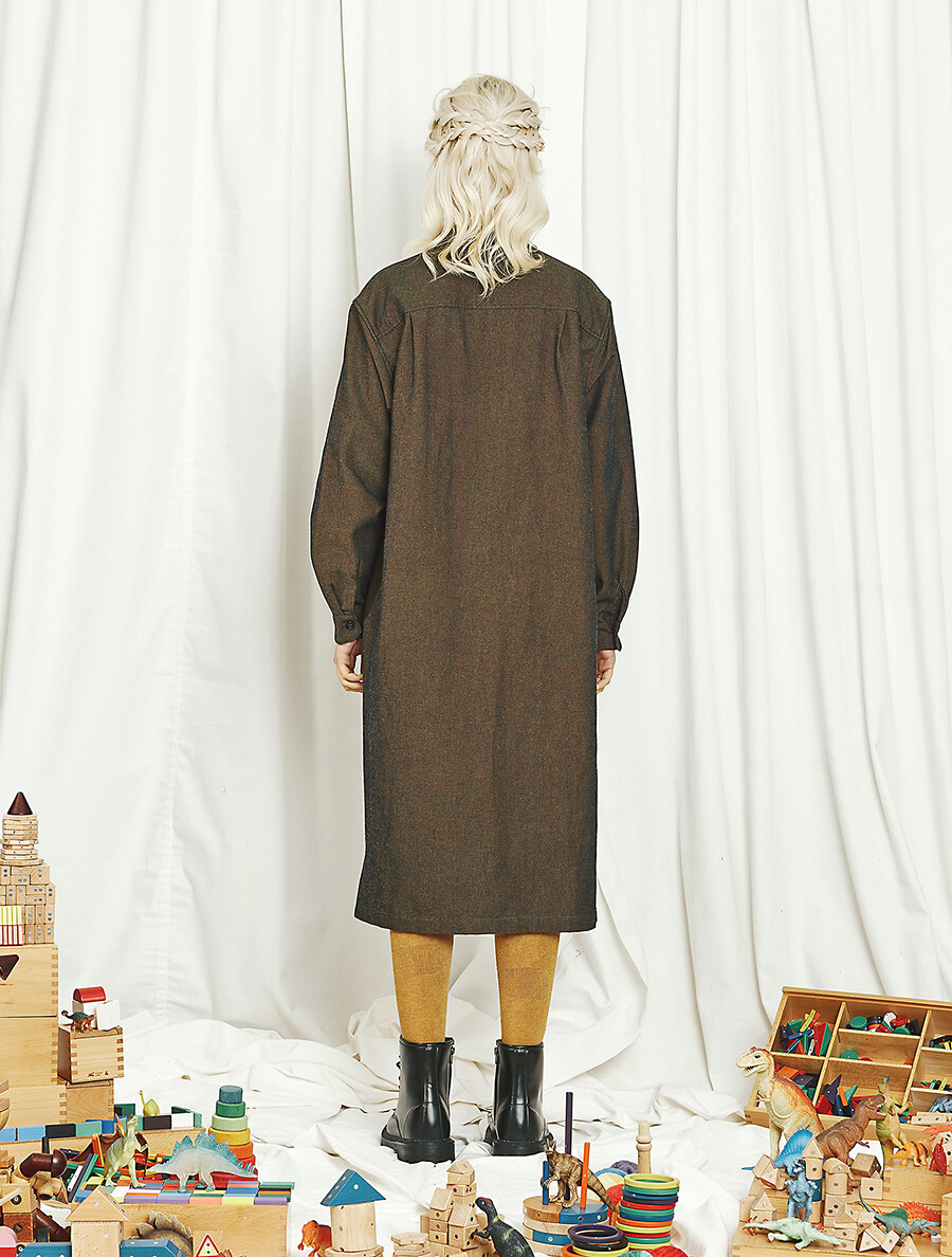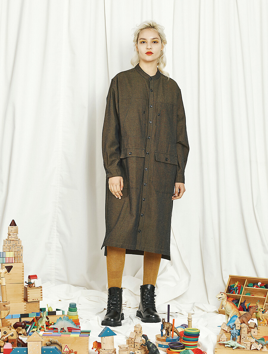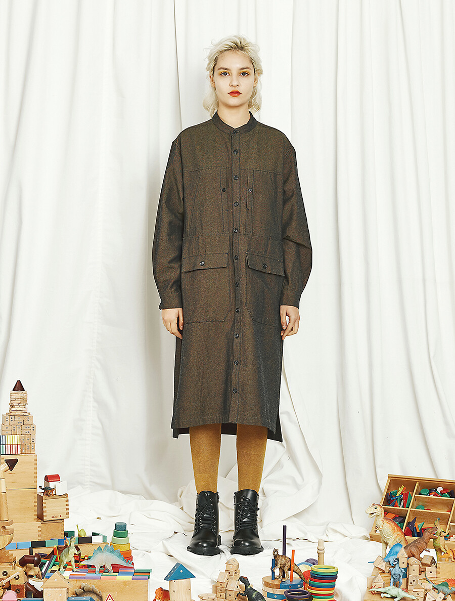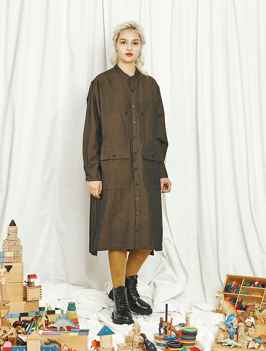 인디고 선염된 데님 원사와 머스터드 선염사를 옥스포드 조직으로 제직된 코튼소재로 바이오 워싱을 거친 제품입니다. 바이오 워싱으로 인디고 선염사가 까지면서 머스터드 선염사에 이염되어 전체적으로 고급스럽고 오묘한 빛깔로 새롭게 부활하였습니다. 실용적인 6개의 포켓이 드레스의 전체적인 라인, 절개선의 각도, 실루엣과 조화를 이루며 본인이 있어야 할 자리에 책임감 있게 위치해 있습니다.