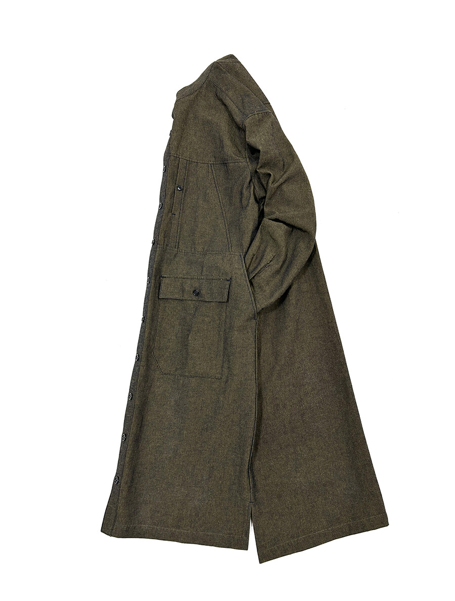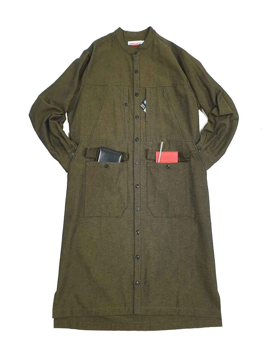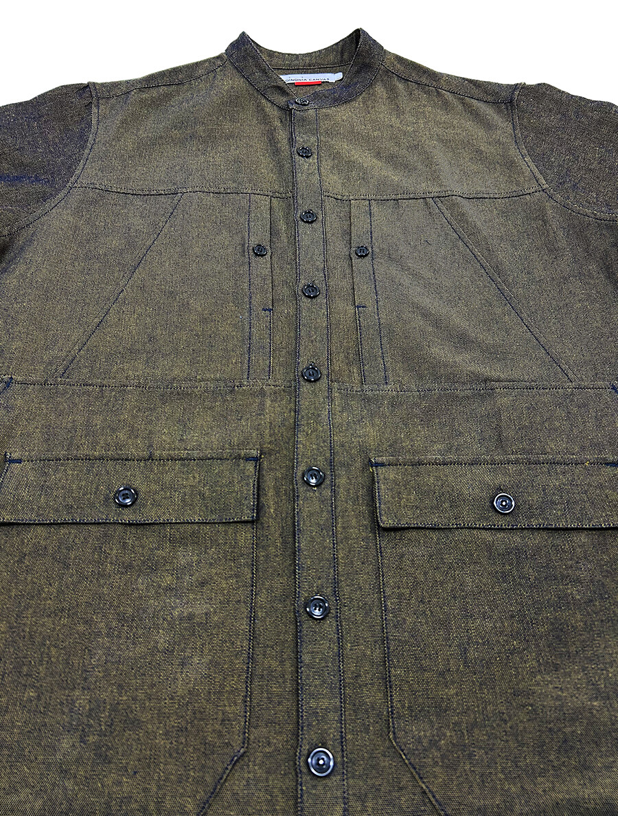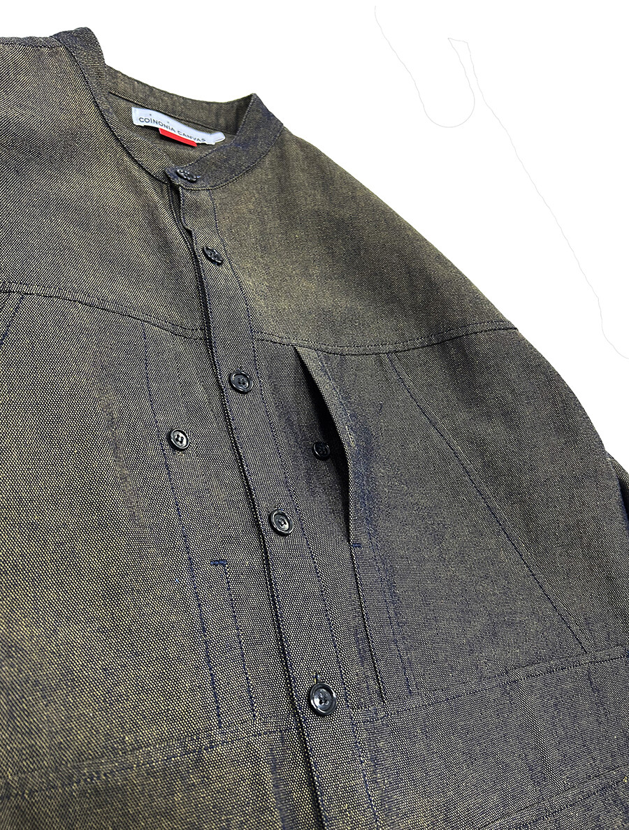 인디고 선염된 데님 원사와 머스터드 선염사를 옥스포드 조직으로 제직된 코튼소재로 바이오 워싱을 거친 제품입니다. 바이오 워싱으로 인디고 선염사가 까지면서 머스터드 선염사에 이염되어 전체적으로 고급스럽고 오묘한 빛깔로 새롭게 부활하였습니다. 실용적인 6개의 포켓이 드레스의 전체적인 라인, 절개선의 각도, 실루엣과 조화를 이루며 본인이 있어야 할 자리에 책임감 있게 위치해 있습니다.