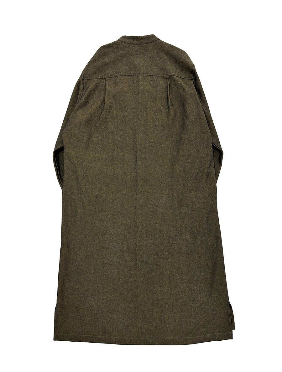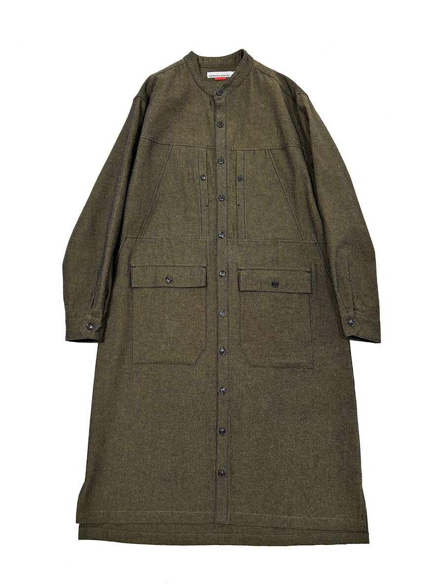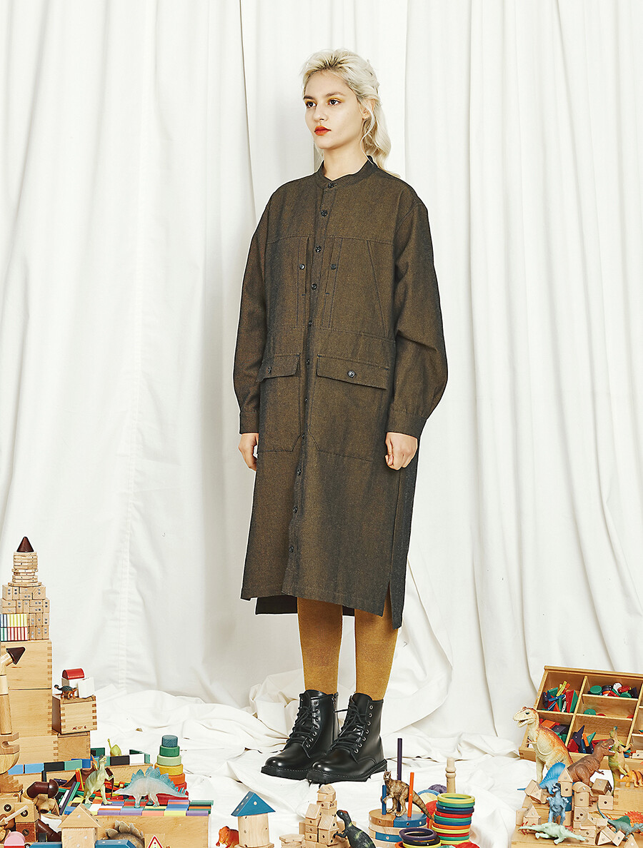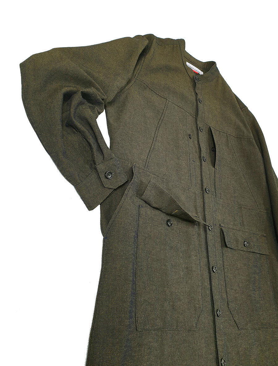 인디고 선염된 데님 원사와 머스터드 선염사를 옥스포드 조직으로 제직된 코튼소재로 바이오 워싱을 거친 제품입니다. 바이오 워싱으로 인디고 선염사가 까지면서 머스터드 선염사에 이염되어 전체적으로 고급스럽고 오묘한 빛깔로 새롭게 부활하였습니다. 실용적인 6개의 포켓이 드레스의 전체적인 라인, 절개선의 각도, 실루엣과 조화를 이루며 본인이 있어야 할 자리에 책임감 있게 위치해 있습니다.