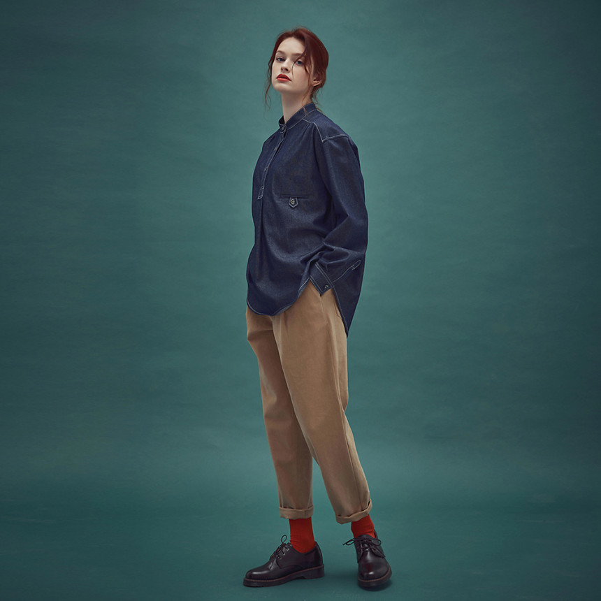 남성복 턱시도 셔츠의 디테일과 여성스러운 셔츠를 하이브리드 시킨 풀오버 체크 셔링 셔츠입니다.